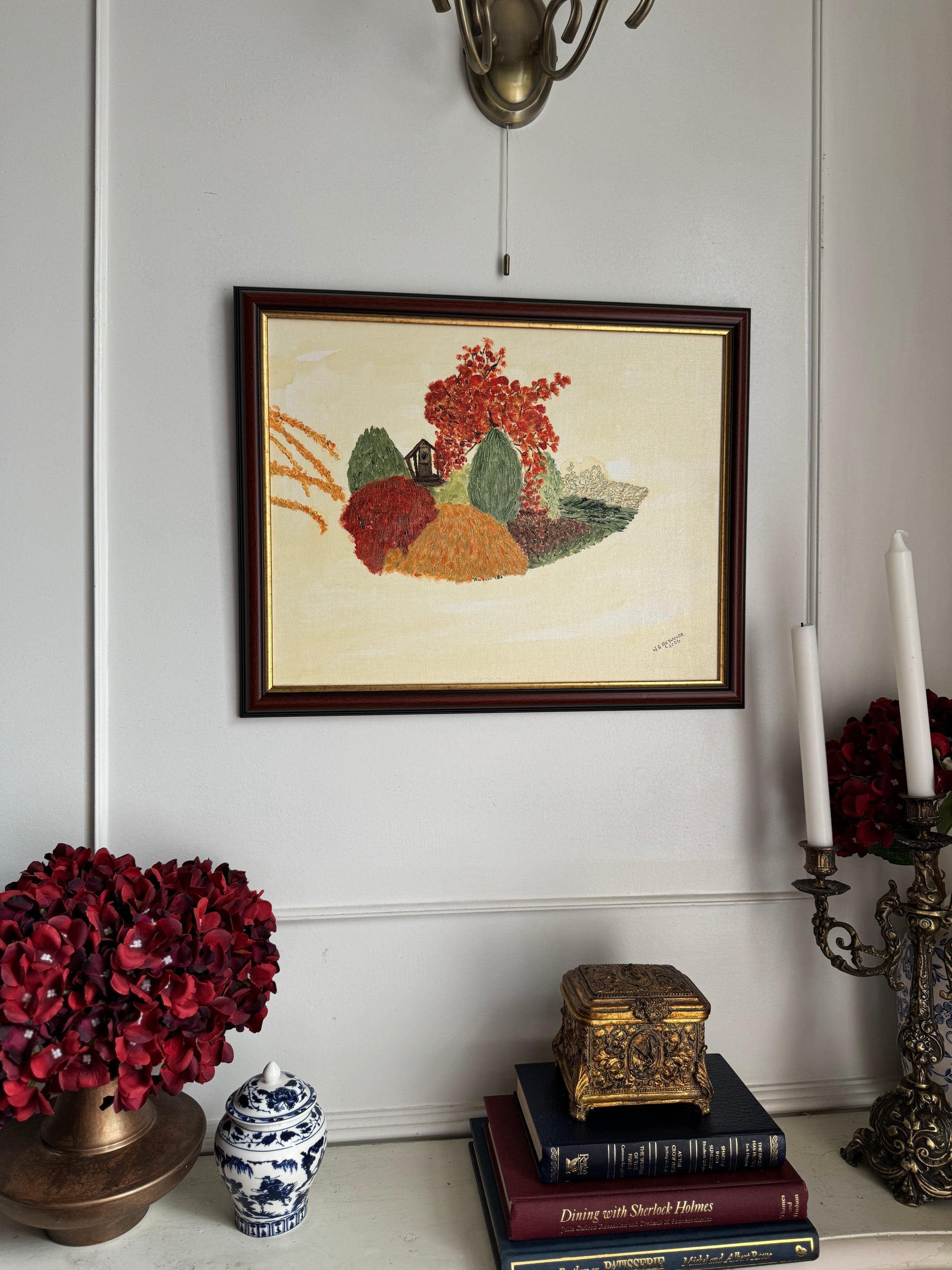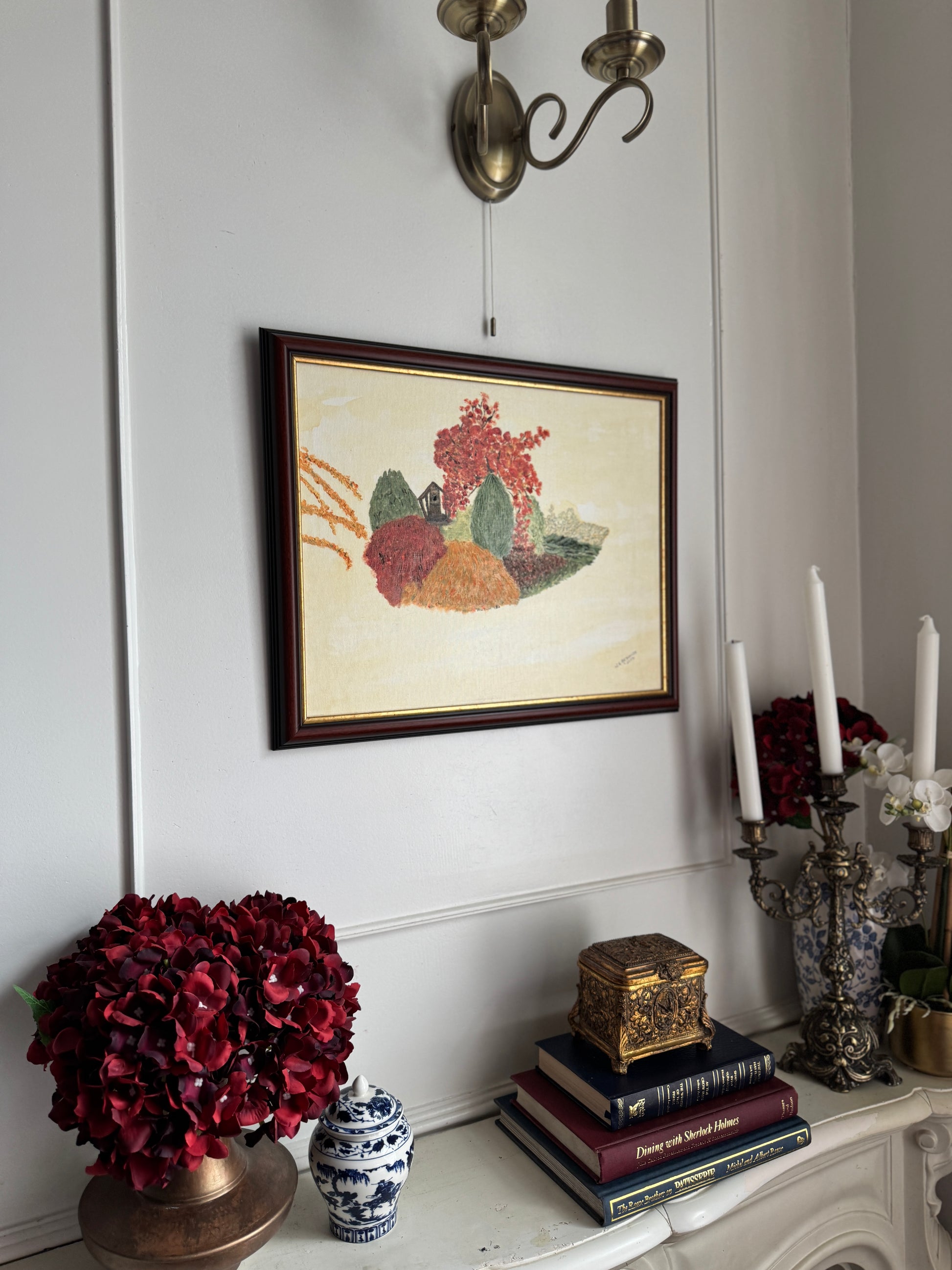 This oil painting beautifully captures the intimate warmth of autumn through the vivid depiction of a fiery bush, its leaves ablaze with tones of gold, rust, and crimson. Each stroke evokes the fleeting beauty of nature’s transformation — a quiet moment of stillness before winter. Perfect for adding seasonal depth and earthy color to any space.