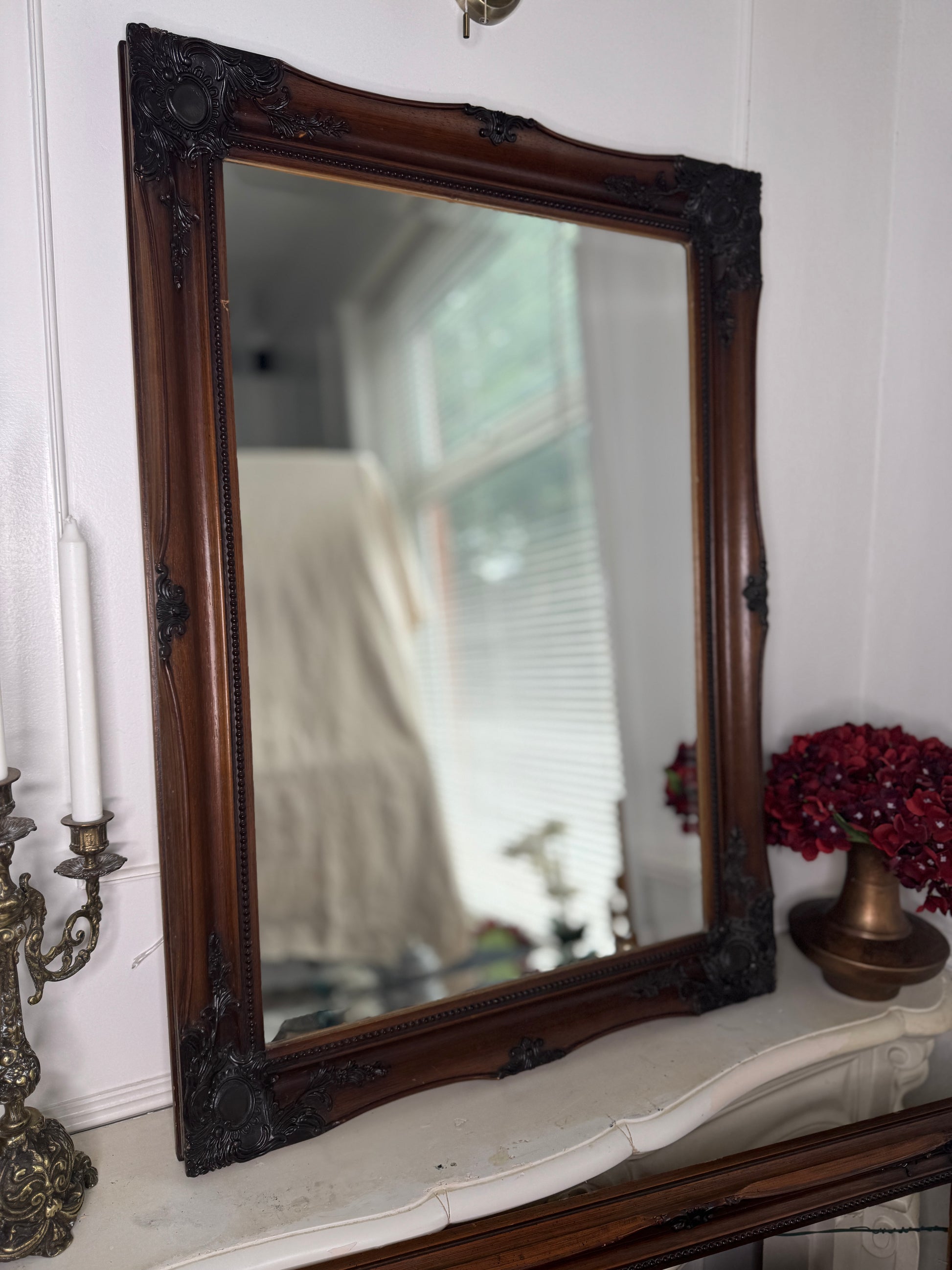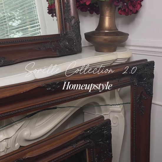 Elevate your home with this stunning antique bevelled mirror, beautifully set in a rich vintage wooden mirror frame adorned with intricate carvings. The ornate wooden frame mirror adds classic elegance and depth to any space, perfect for hallways, bedrooms, or living rooms. Its aged patina and bevelled glass reflect character and history, making it a meaningful accent piece that complements traditional, shabby chic, or French-inspired décor.