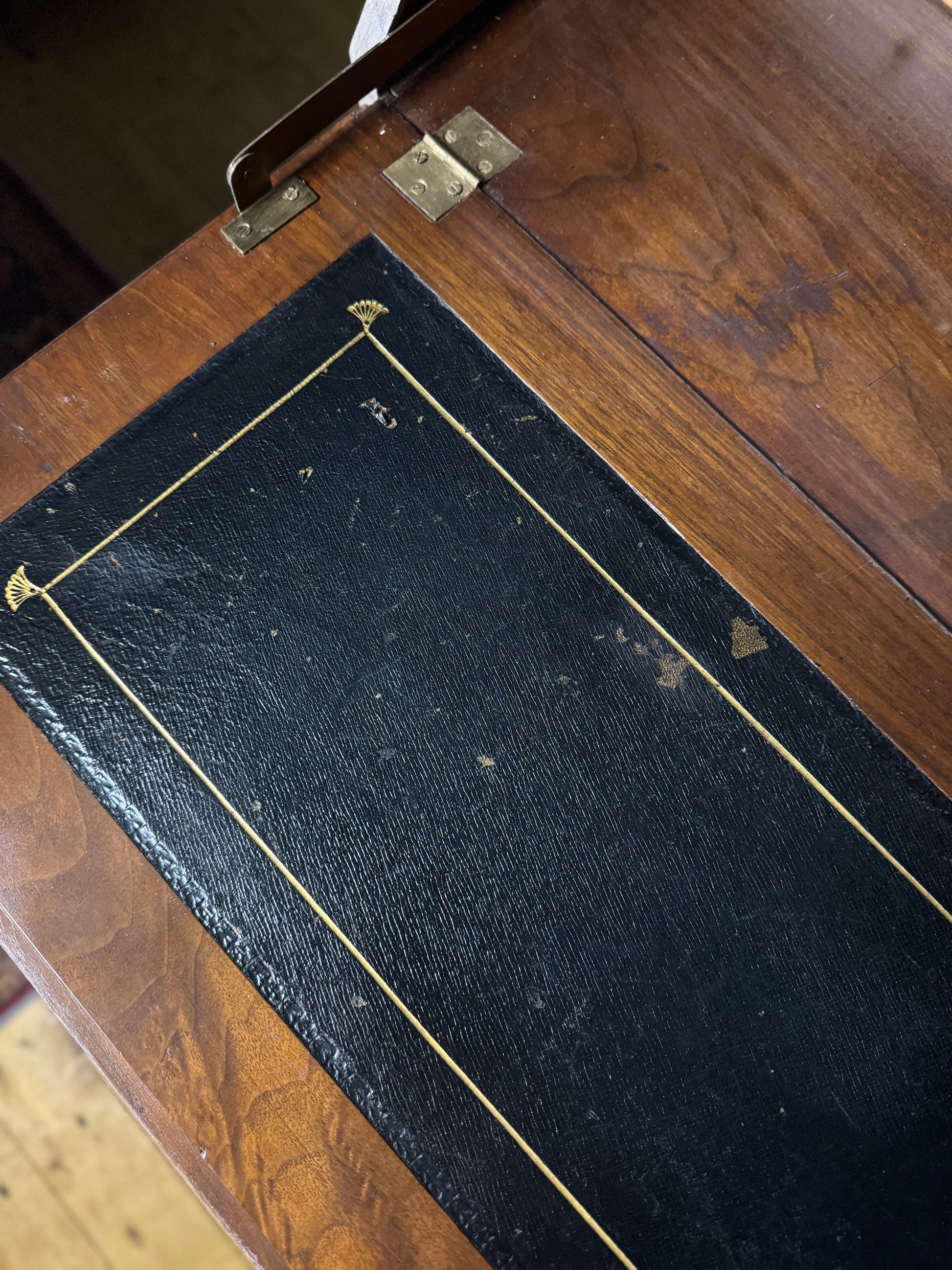 * Drop-down writing desk area with original leather inlay (shows few scratches, see photos)