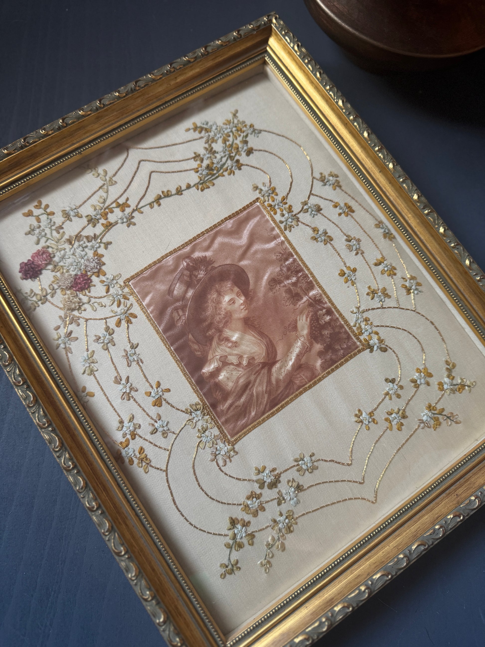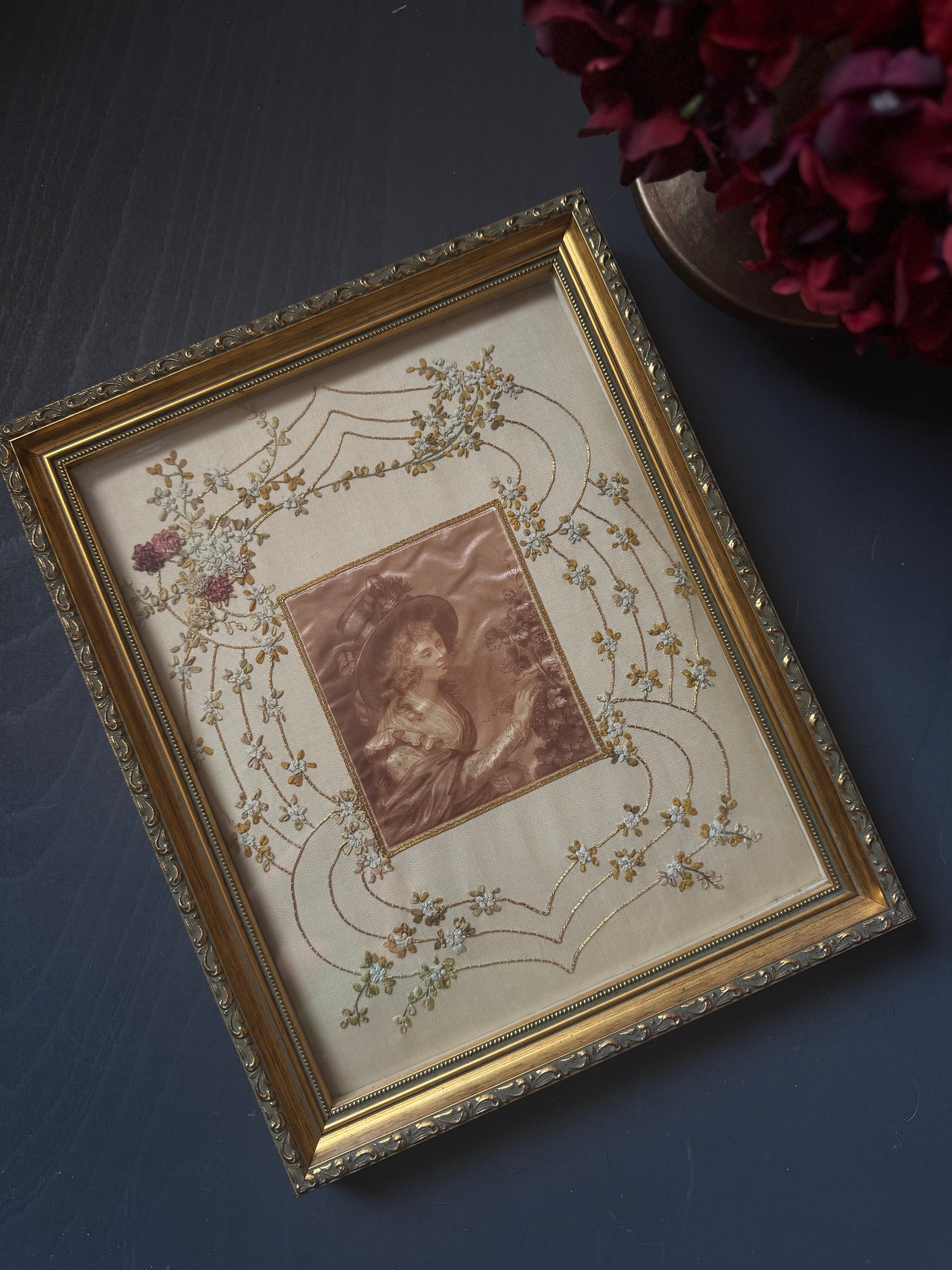 Whether displayed as part of a gallery wall or standing alone as a focal point, this embroidery brings historic texture, soft luster, and a sense of timeless craftsmanship into your space. Ideal for collectors of antique textiles, lovers of decorative arts, or those with an eye for unique and meaningful vintage décor.