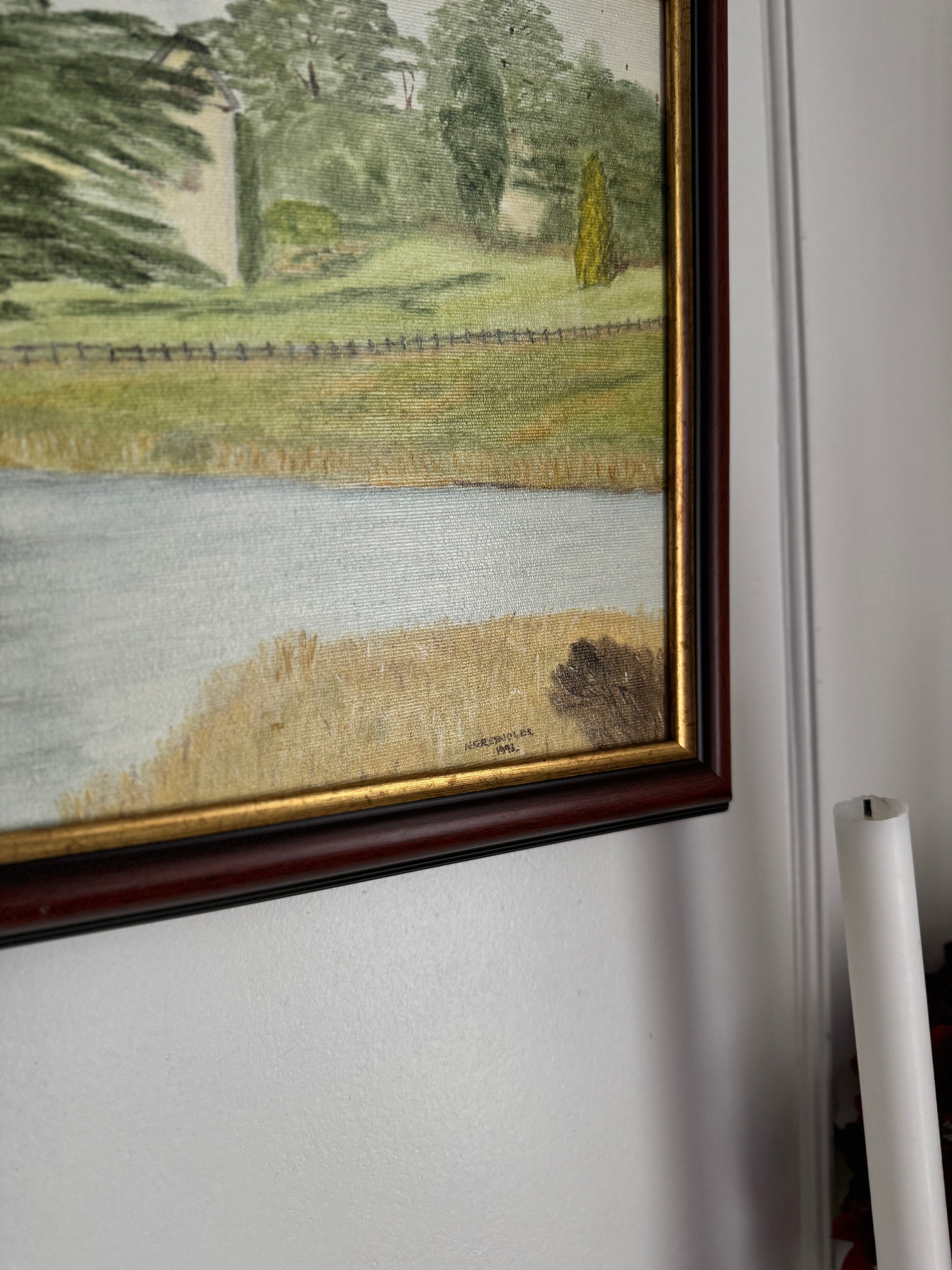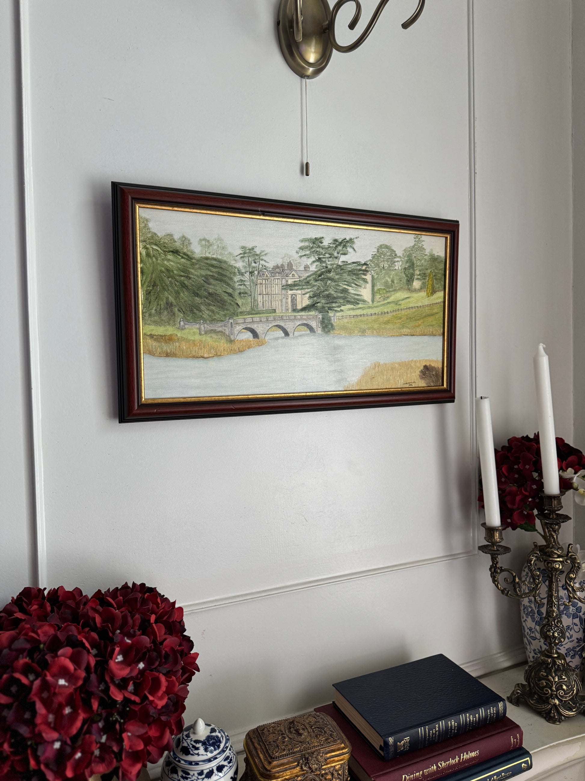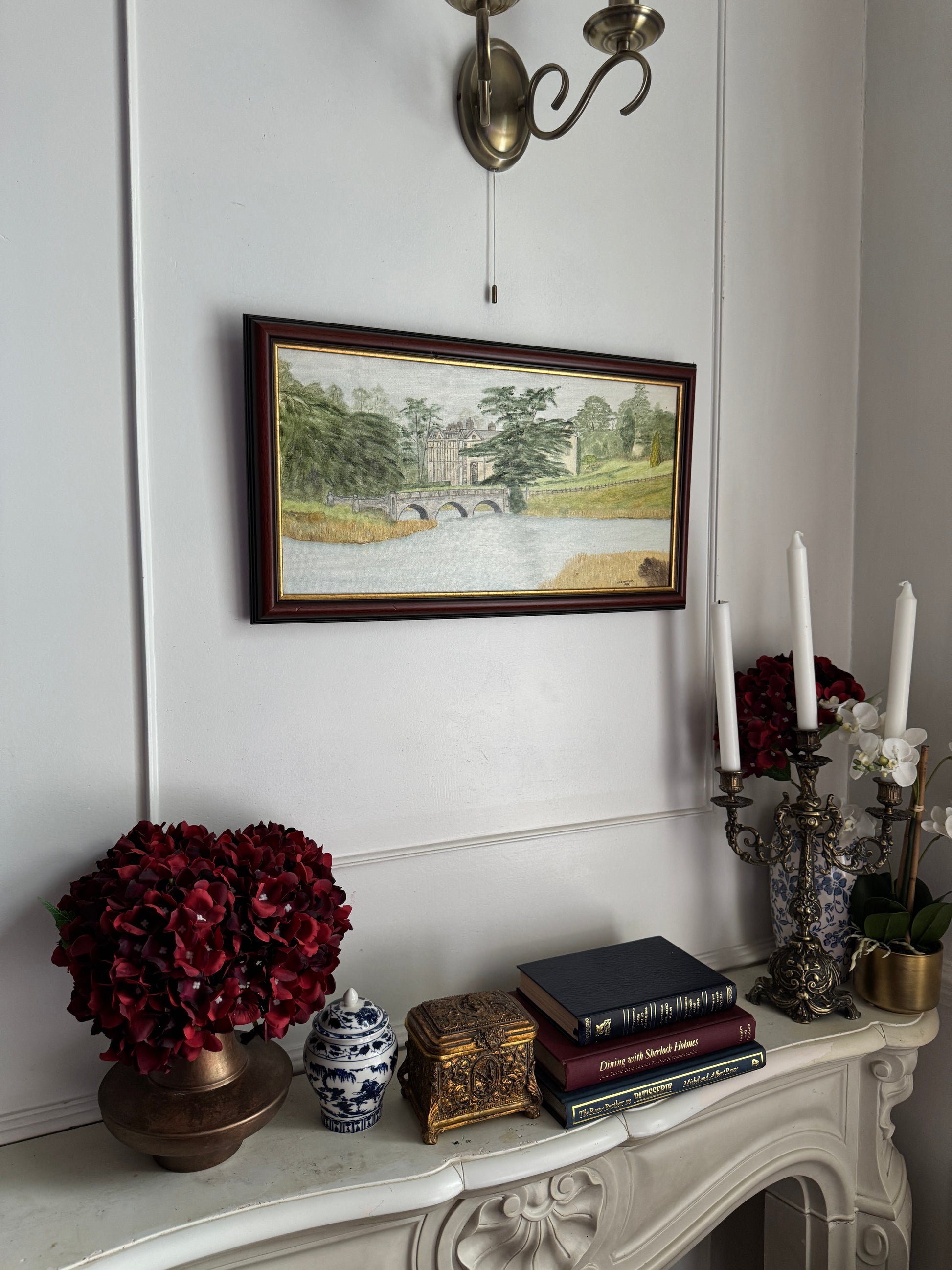 This atmospheric painting captures a tranquil riverside scene in the heart of the UK, where a timeless stone bridge gently arches over flowing water. With soft brushstrokes and a palette of earthy greens, blues, and greys, the artwork evokes the peace of a quiet countryside afternoon. Whether it’s a nod to rural charm or a memory of a cherished walk, this piece adds classic elegance to any space and invites the viewer to pause and breathe in the stillness of nature.