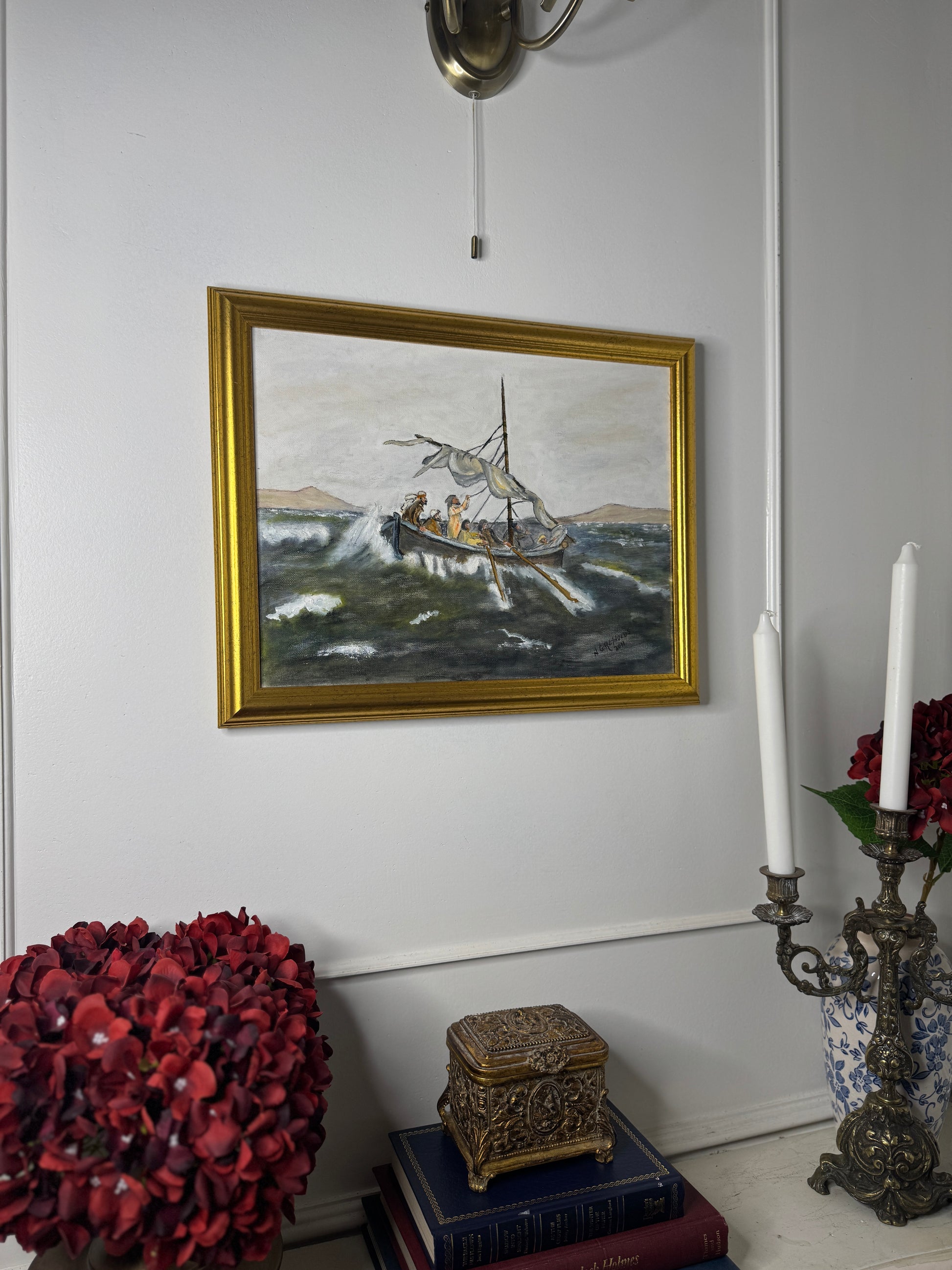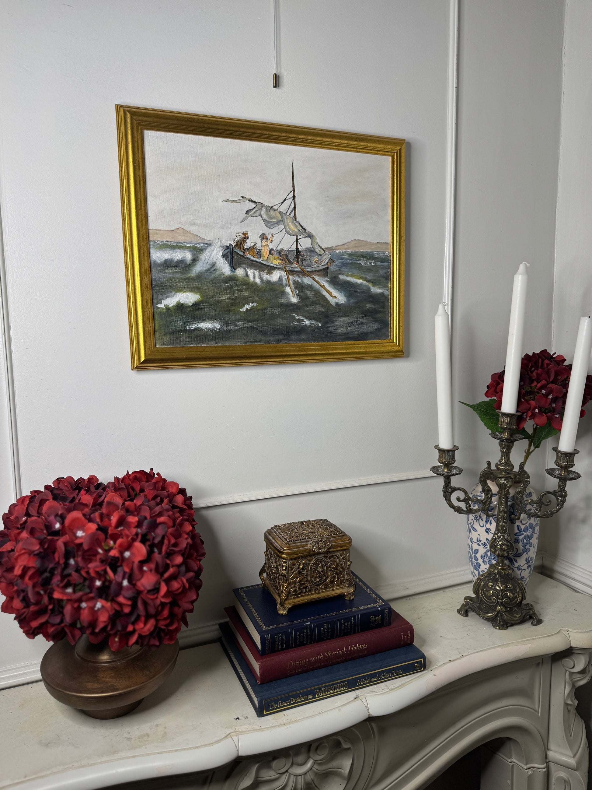 This original oil painting by British artist N.G. Reynolds captures a serene and inspirational biblical scene, depicting Jesus on a boat trip with his disciples. The composition reflects peace, faith, and guidance, rendered with Reynolds’ expressive and detailed brushwork.