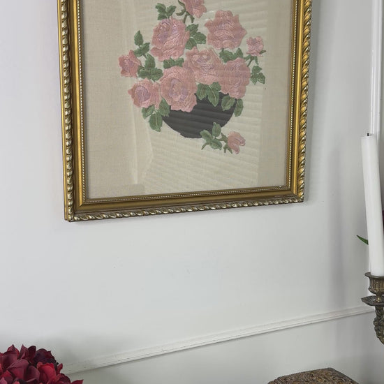 Blush & Bloom – Vintage Embroidered Pink Bouquet in Gilt Frame