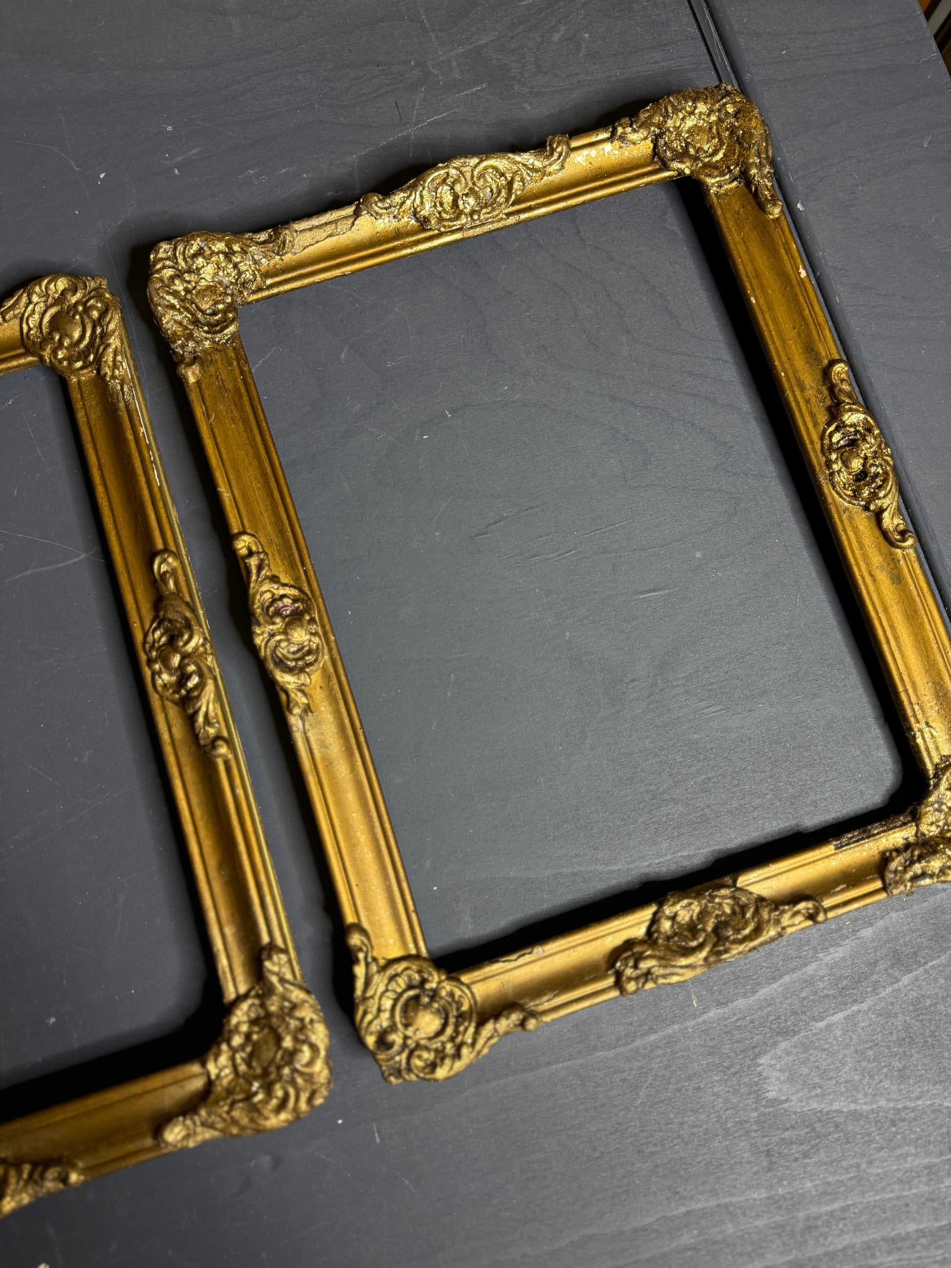 Please Note: These frames are genuine vintage pieces and shows visible wear, age-related marks, and some chips, reflecting their history and character. It appears that previous owners may have attempted some restoration and gilding. These imperfections are typical for items of this age and are reflected in the price.