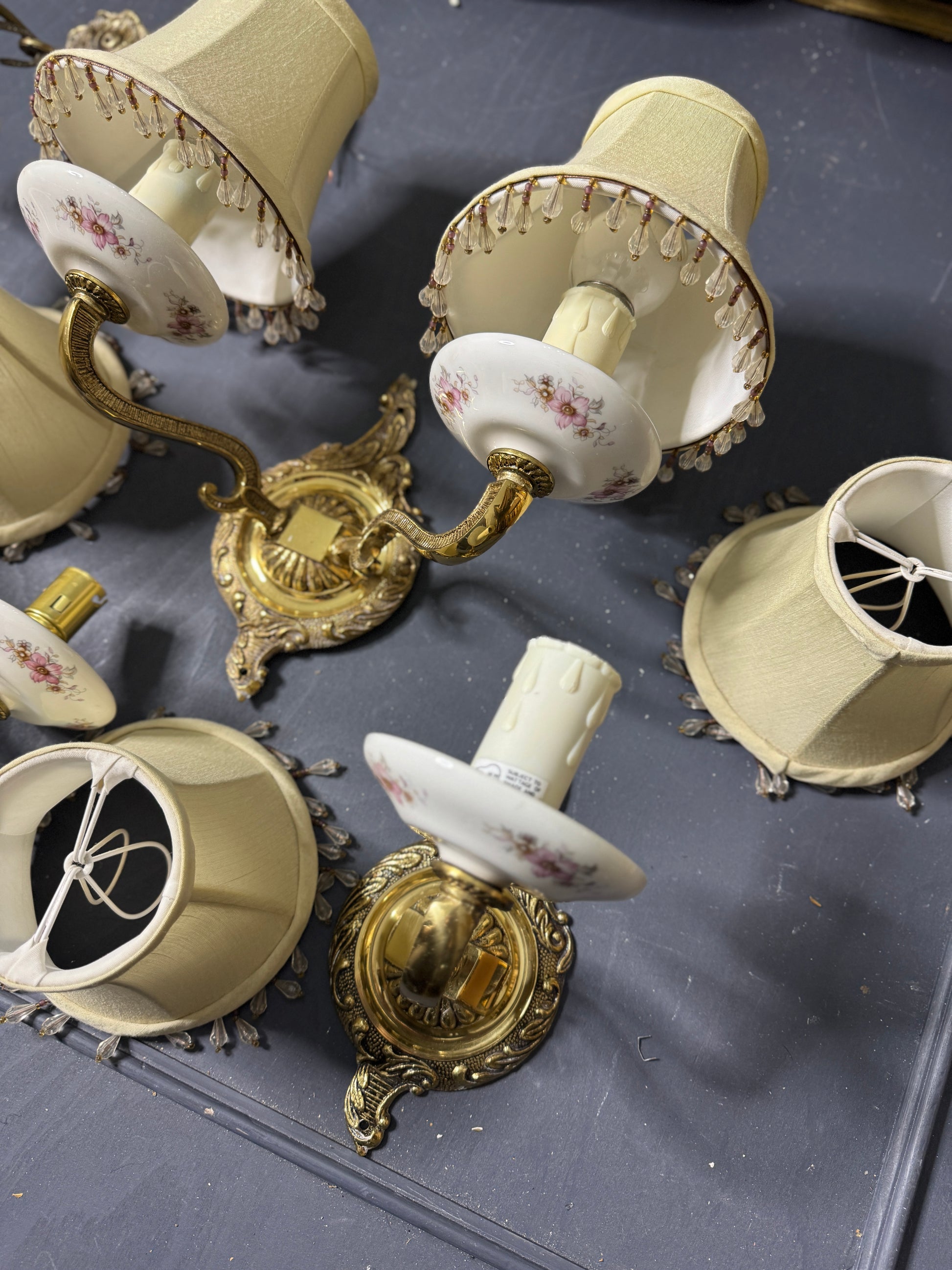 Includes 7 matching lampshades – some with minor tears and wear consistent with age