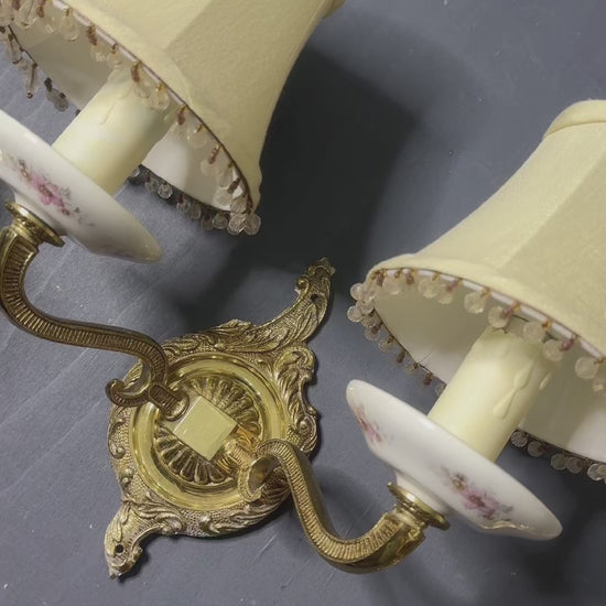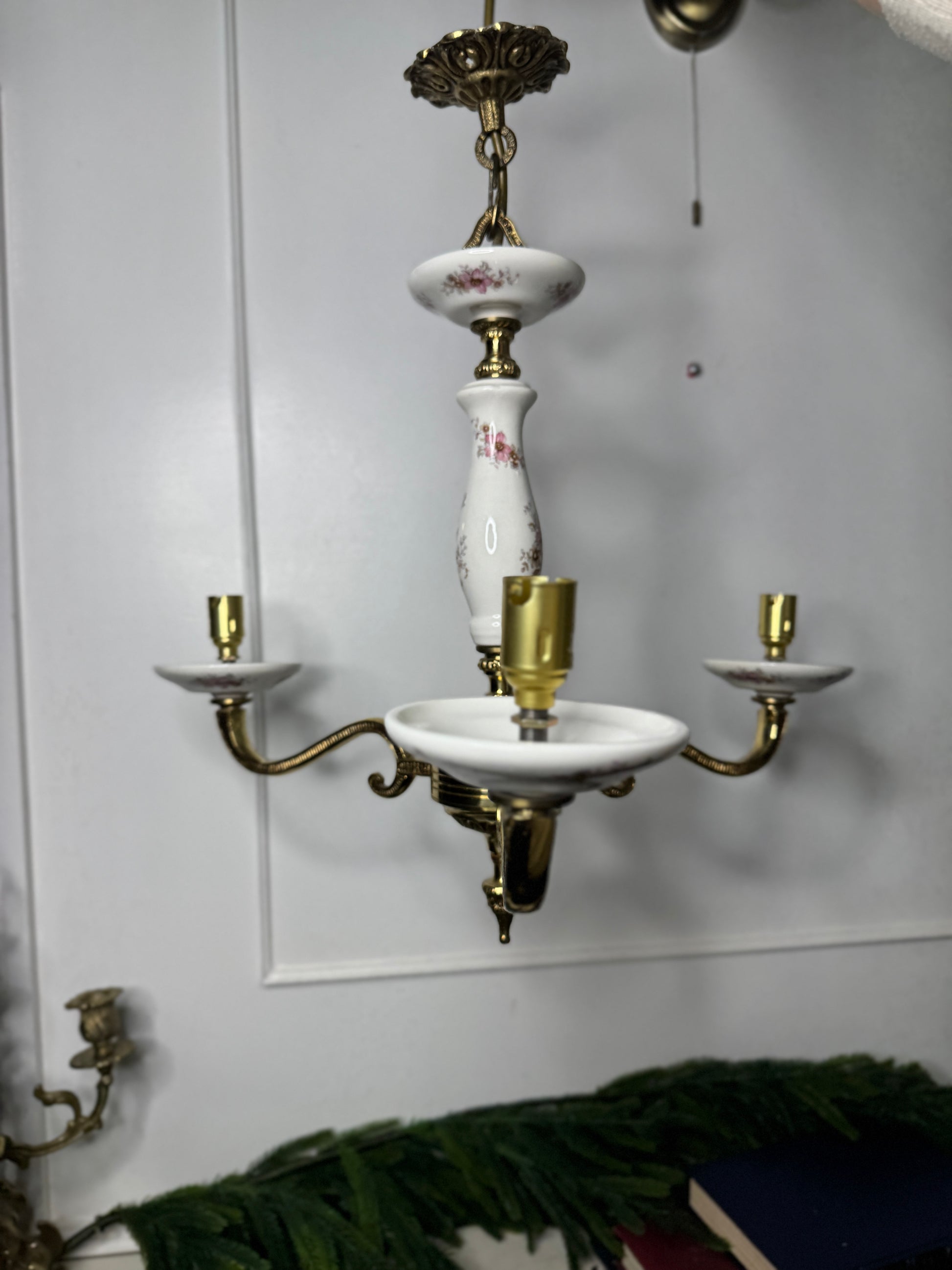 ✨ Capodimonte Style Brass & Fine Ceramic Vintage Chandelier and Wall Light Set | Porcelain White & Pink Flowers | Imported from Spain ✨