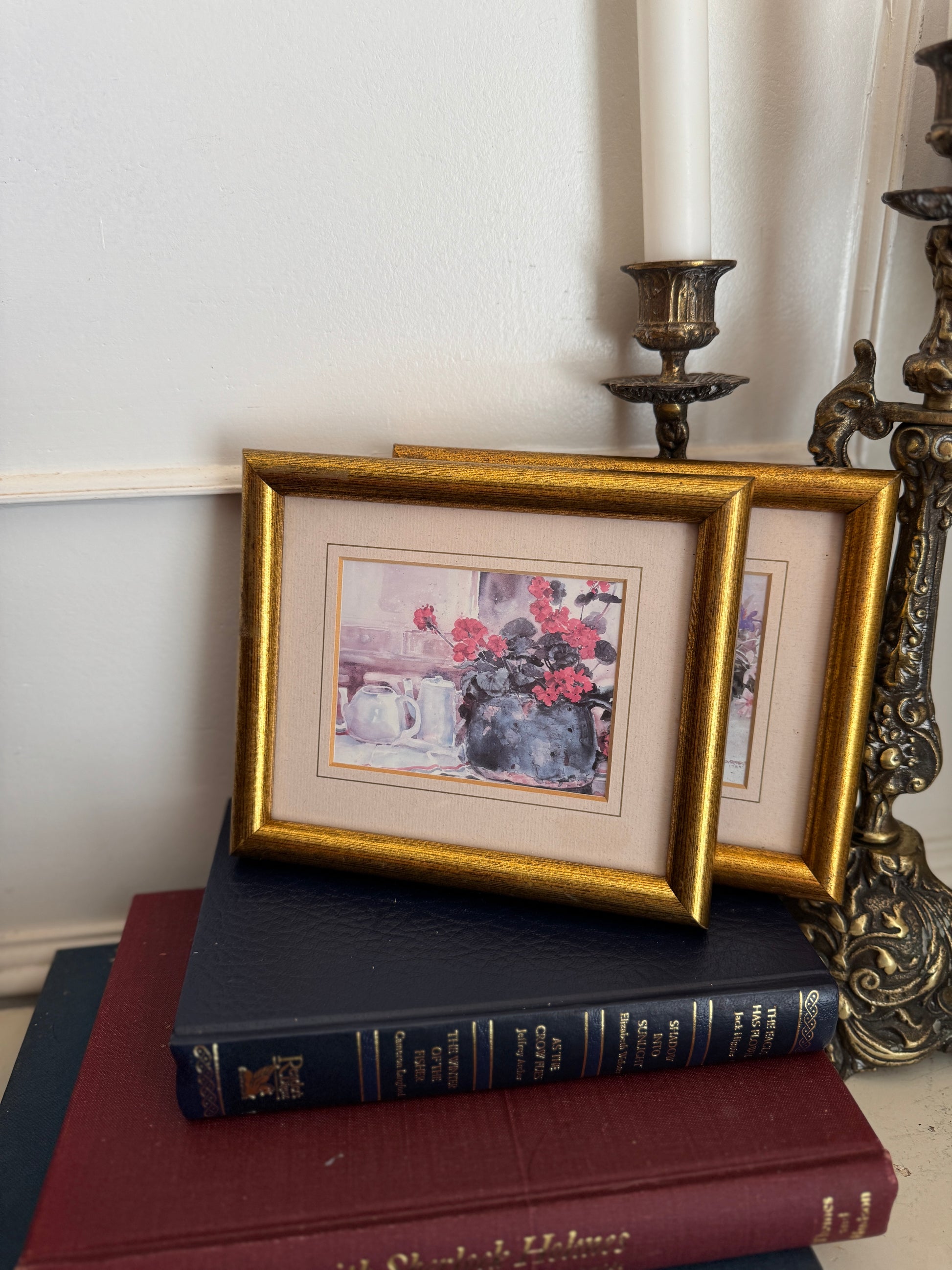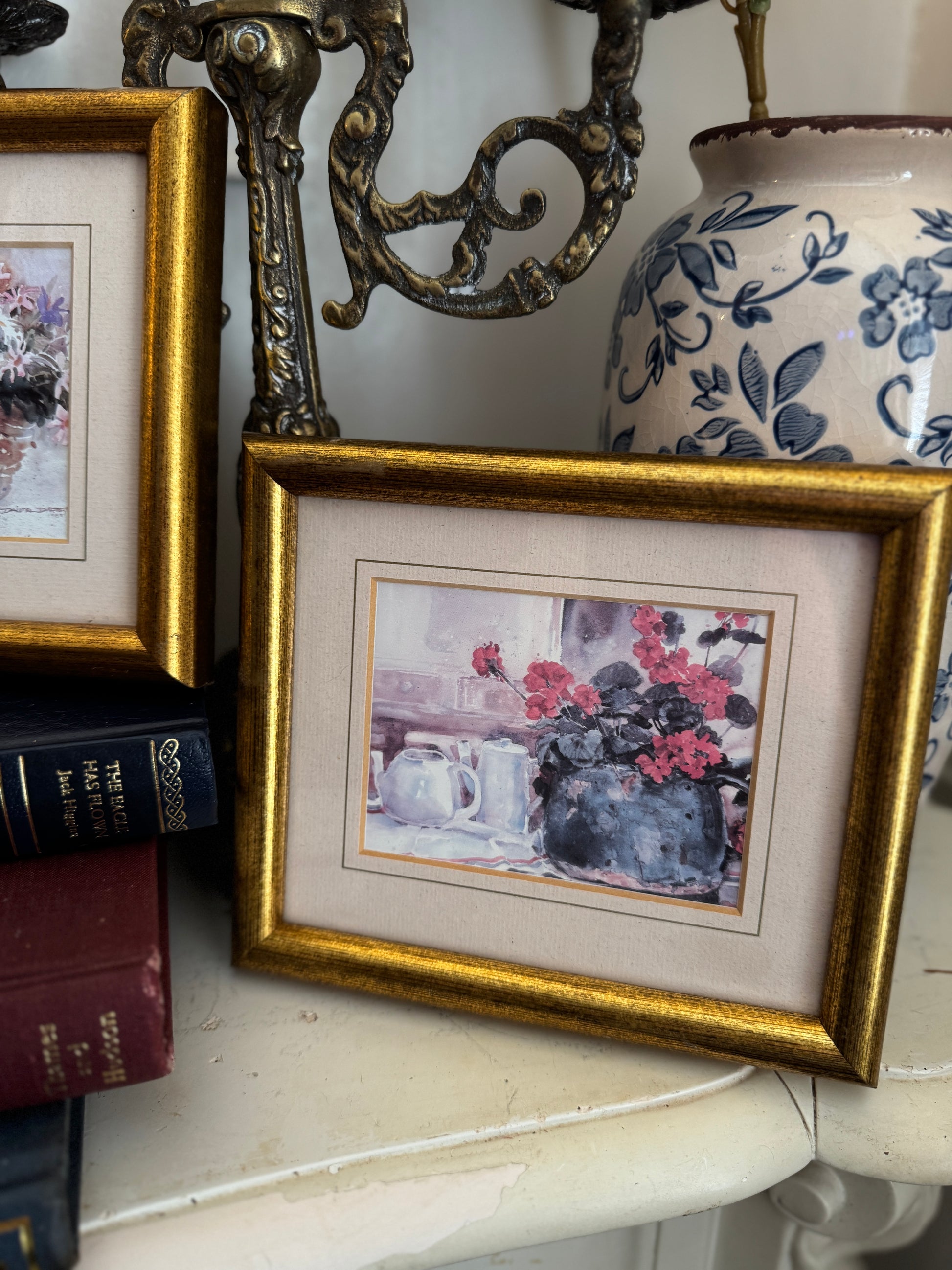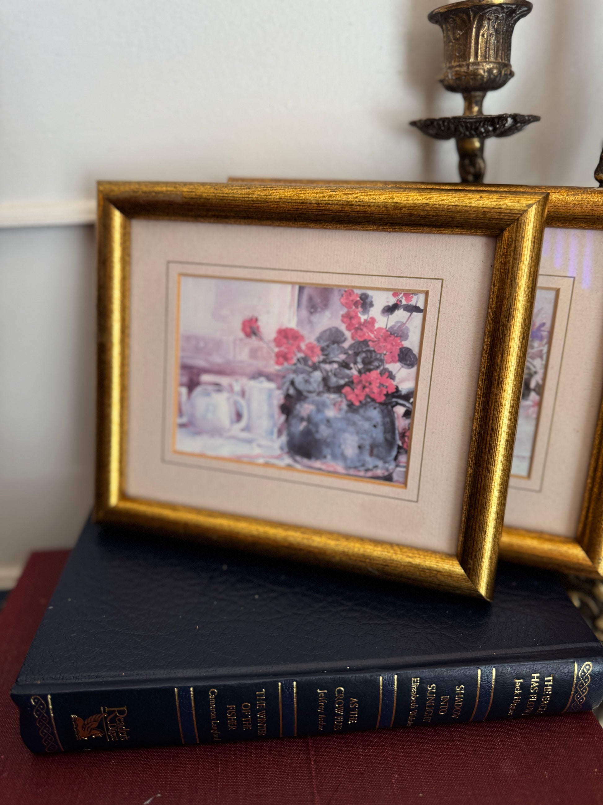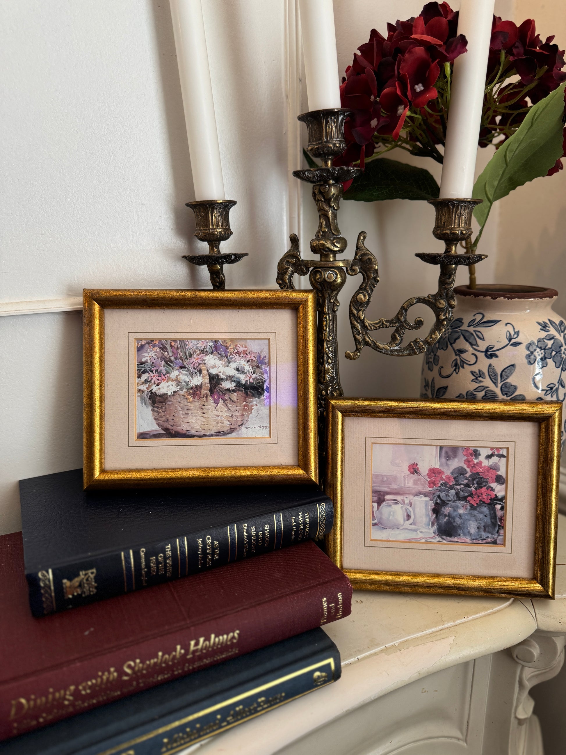 Discover timeless floral elegance with this vintage duo of Dalina Darton lithographs, each framed in delicate gold-tone mini frames. These limited series prints beautifully capture Darton’s signature botanical style, showcasing soft petals, graceful foliage, and gentle palettes that add charm and calm to any space.