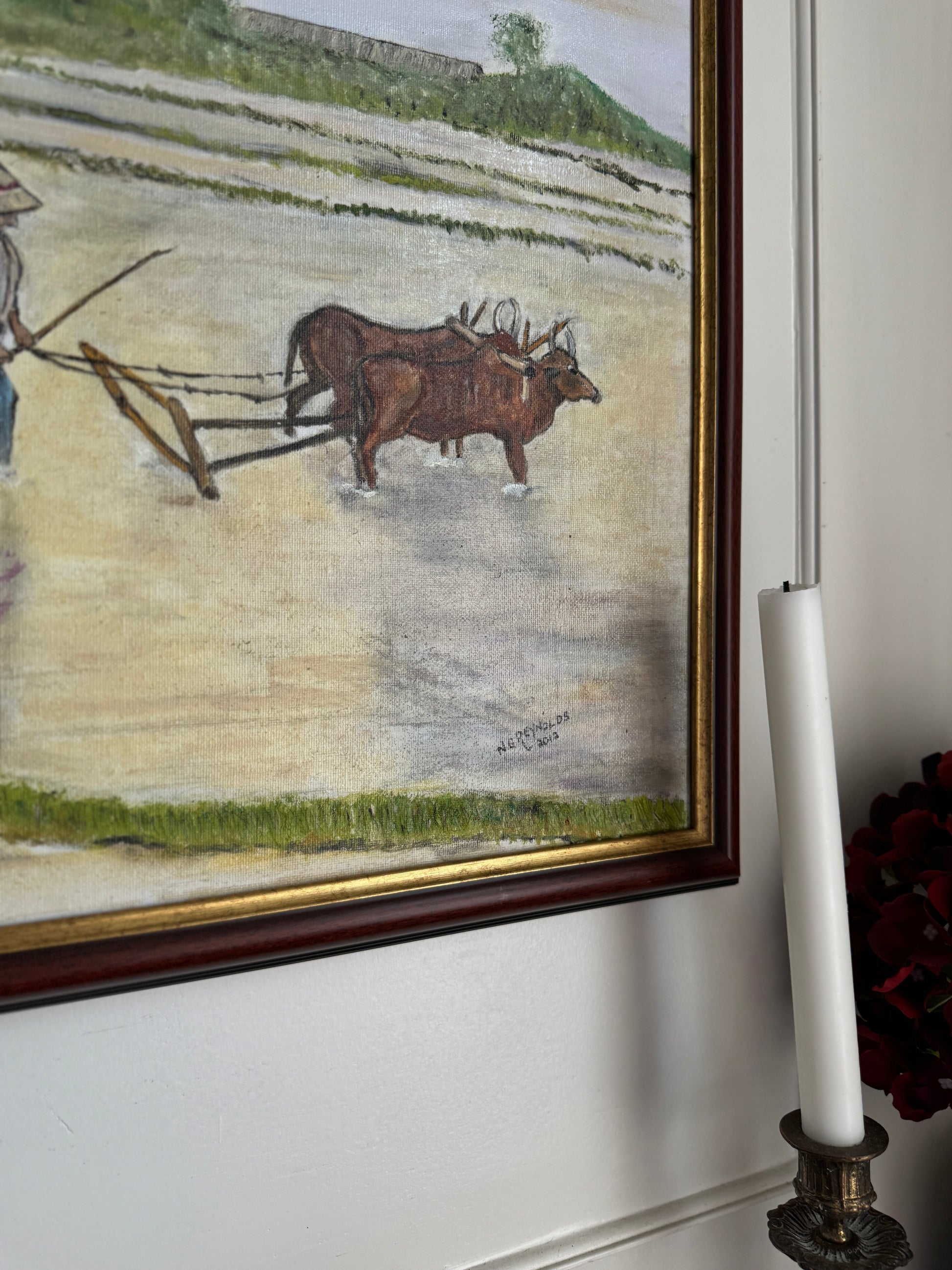This captivating oil painting is set in a vintage wooden frame and was created by N.G. Reynolds, a late artist from Solihull known for his rich, worldly perspective. Throughout his life, Reynolds travelled extensively, capturing diverse cultures, landscapes, and scenes from around the globe in his artwork.
