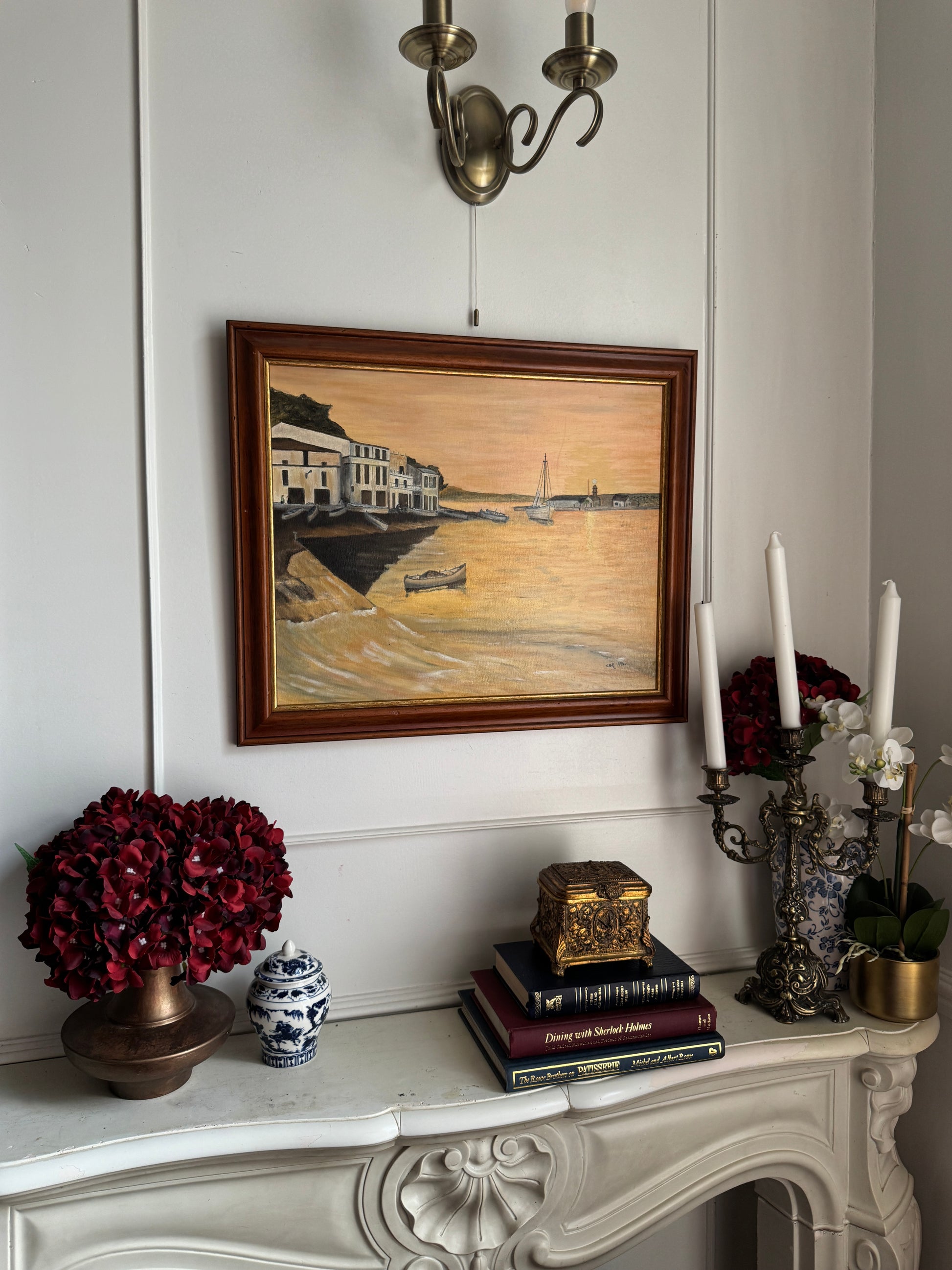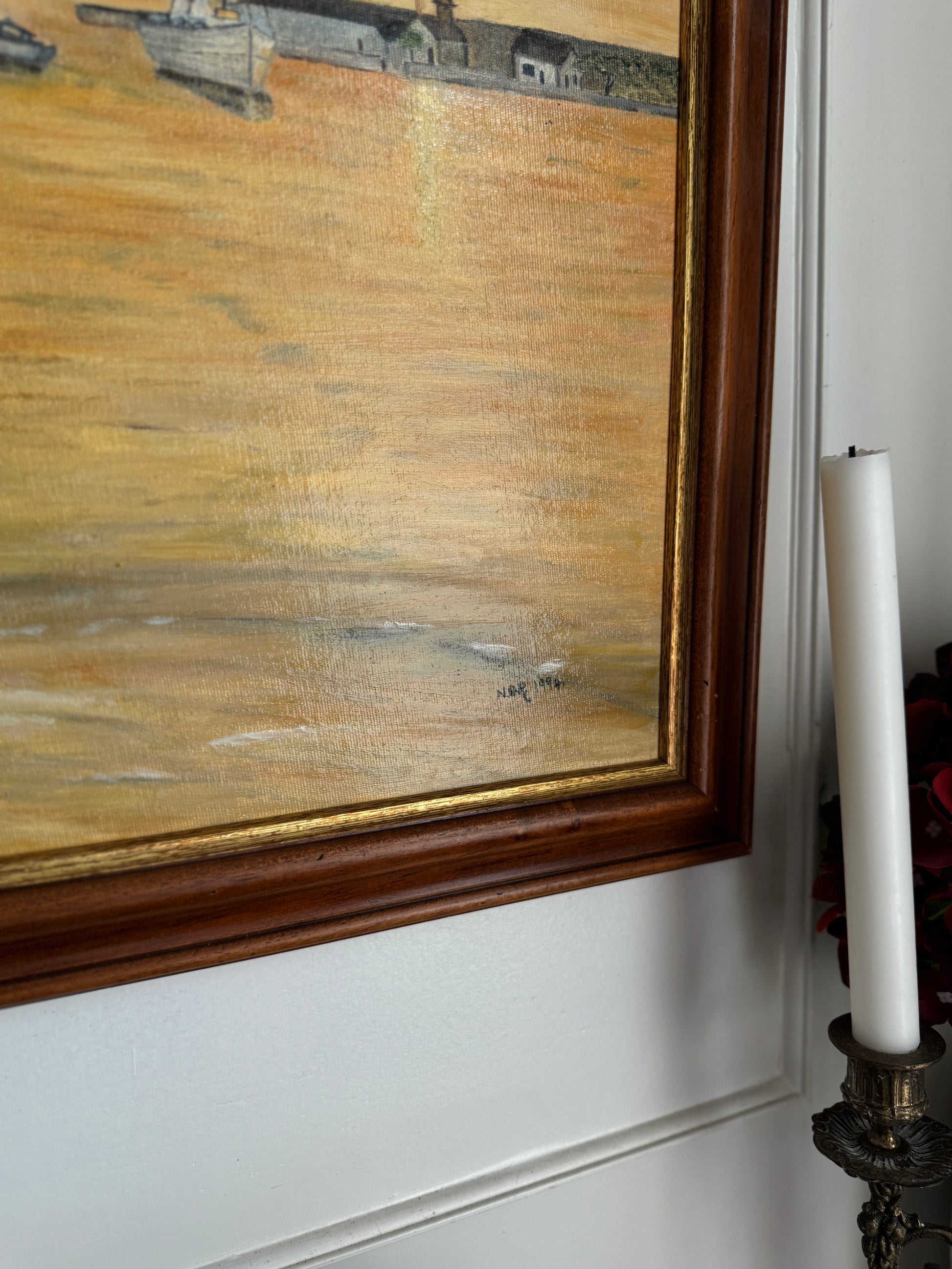 An atmospheric original oil painting titled "Golden Shorelines" by N.G. Reynolds, framed in a vintage gold wooden frame. This sunset seascape reflects the artist’s worldly eye and passion for storytelling through brushwork. A timeless and emotive piece with coastal warmth and vintage charm.