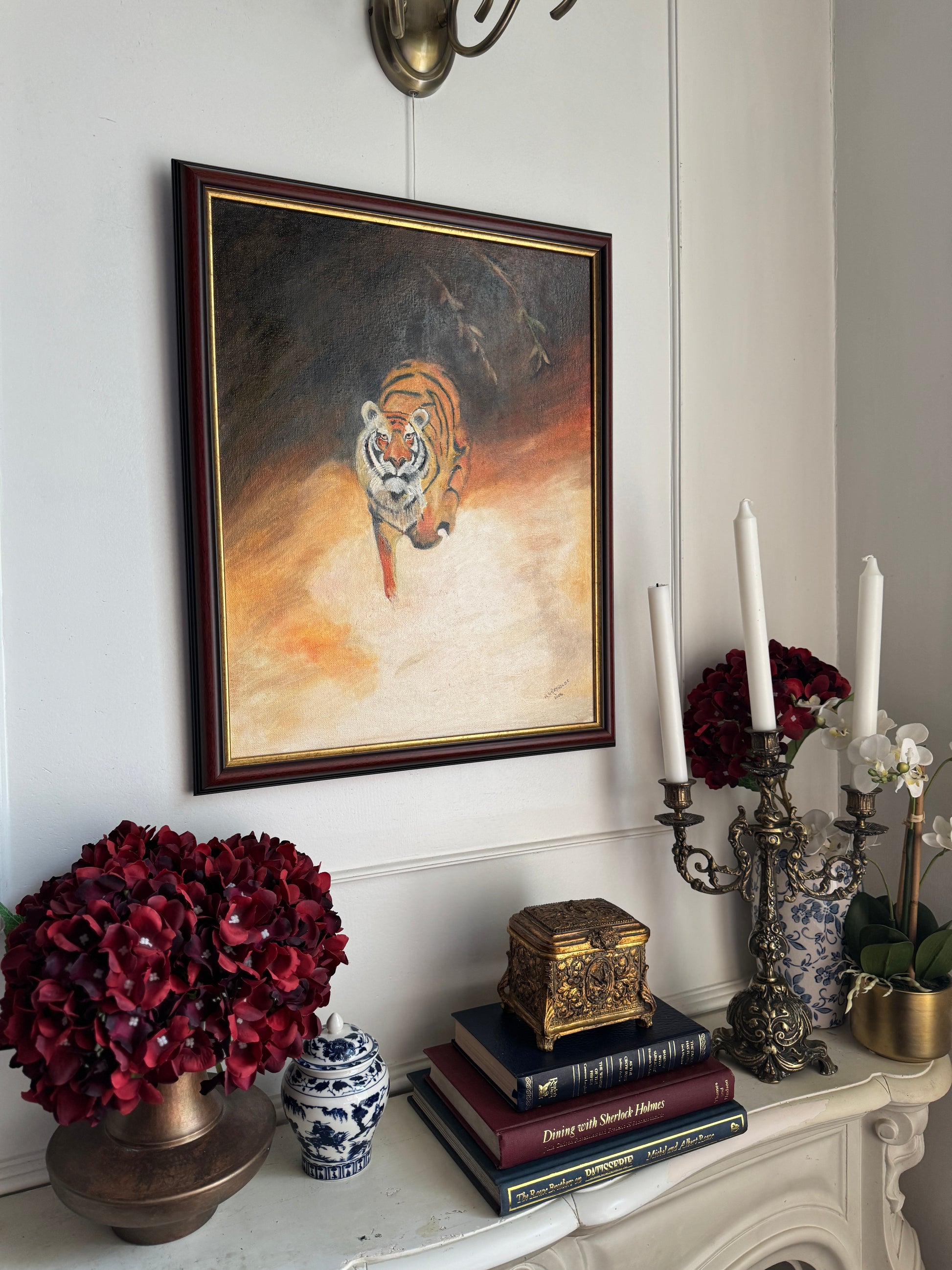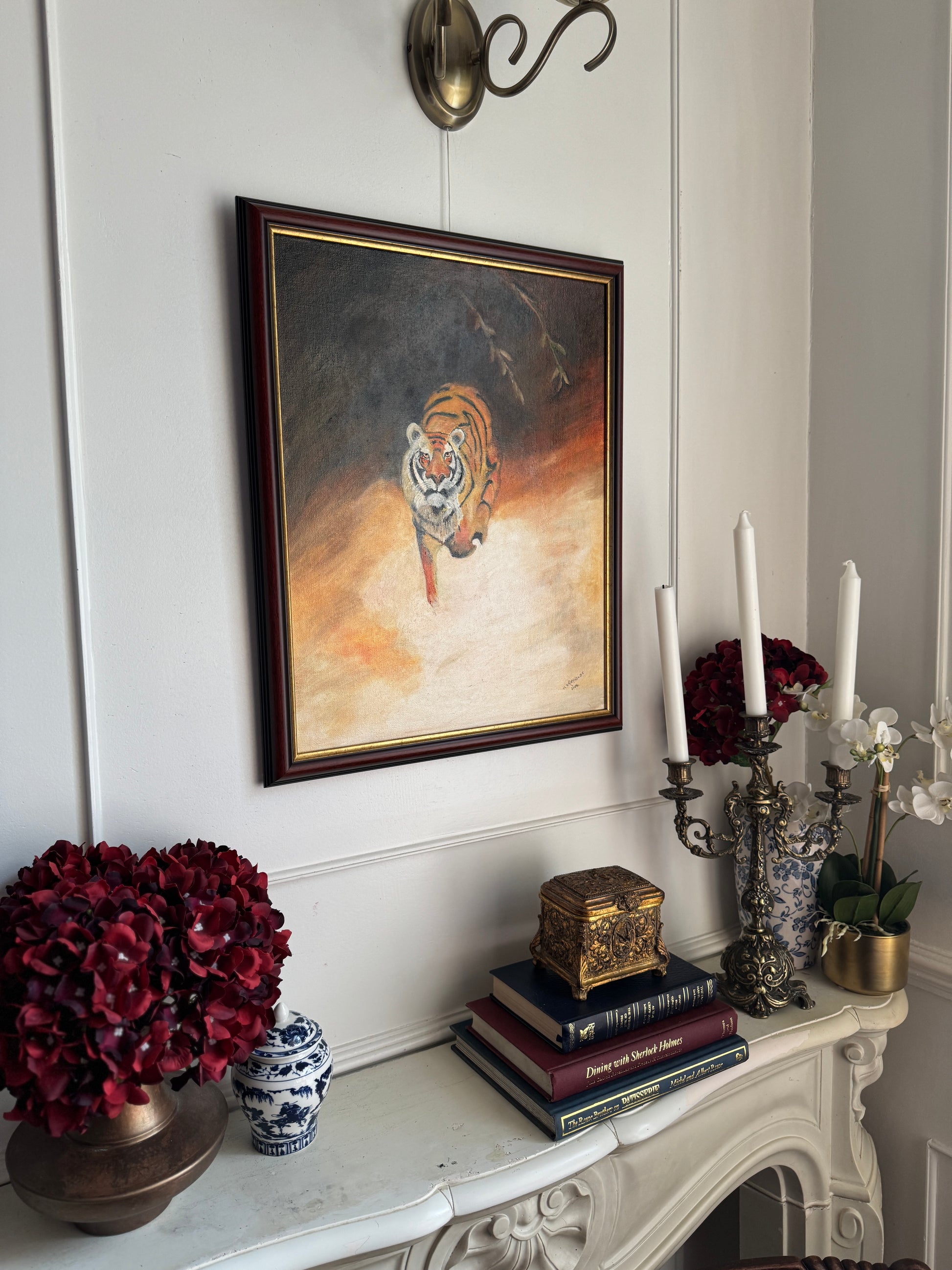 "Guardians of the Grasslands" is an original oil painting by N.G. Reynolds, capturing the majestic presence of tigers in their natural safari habitat. A timeless tribute to wildlife and nature’s grandeur.