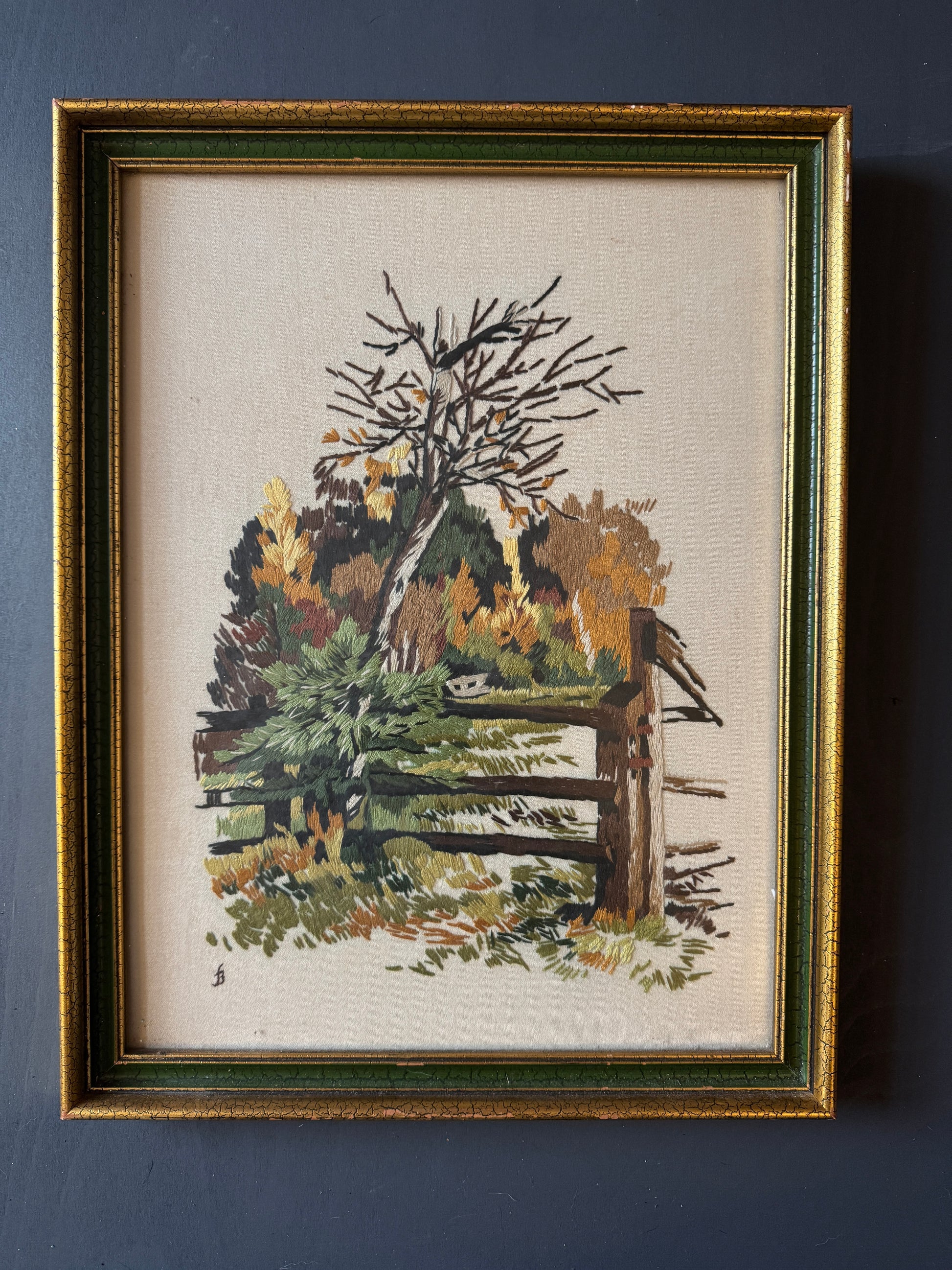 This delightful vintage embroidery artwork is housed in a medium-sized wooden frame, featuring intricate stitching that reflects traditional textile craftsmanship. The warm wooden tones beautifully complement the delicate embroidery, offering a timeless and homely aesthetic. A metal chain on the back adds a practical and vintage-inspired touch, ready for effortless wall display.