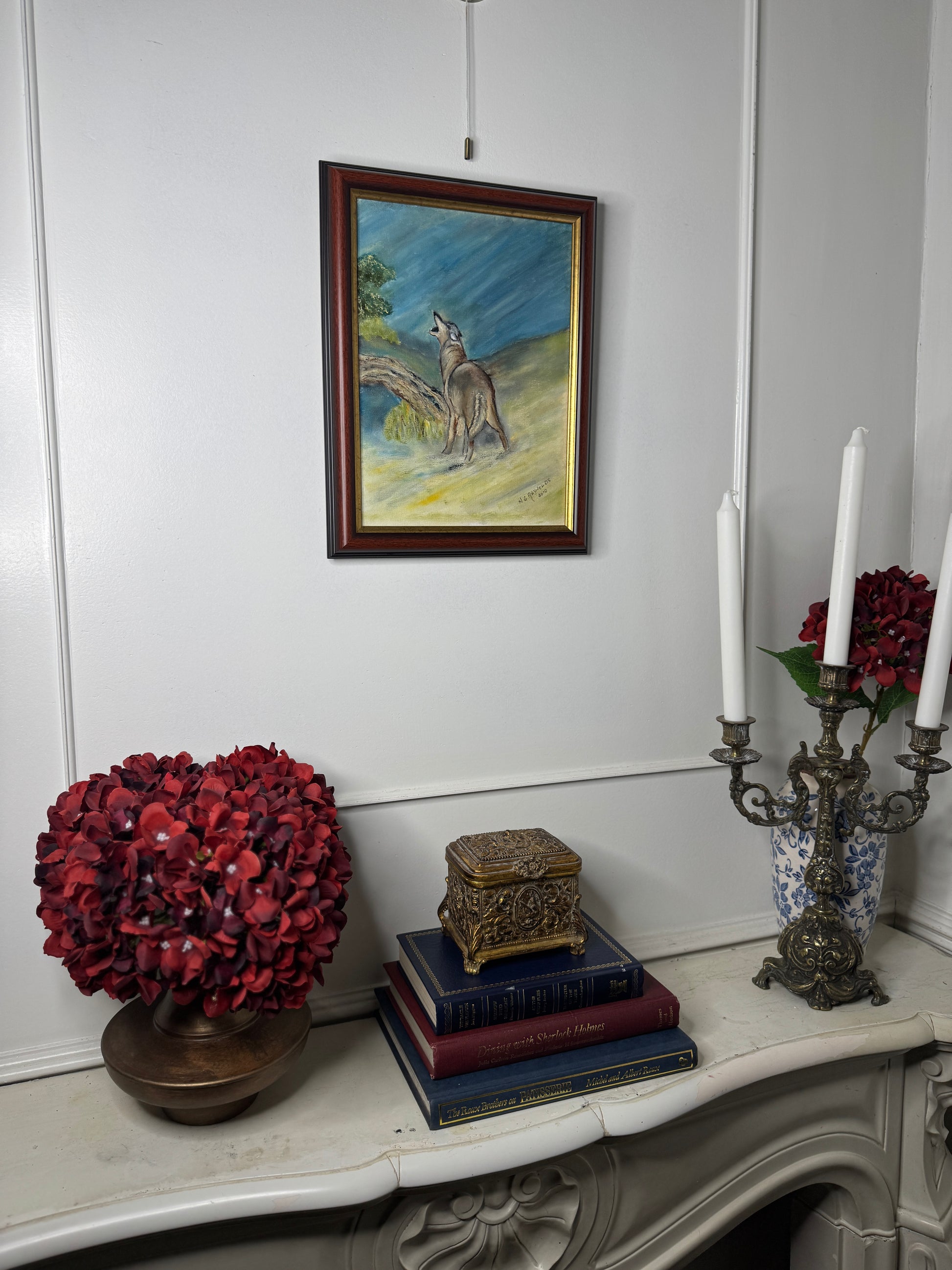 This original oil painting by British artist N.G. Reynolds captures the raw power and intensity of a roaring wolf in the wild. The dramatic composition emphasizes the wolf’s fierce expression, powerful stance, and untamed energy.