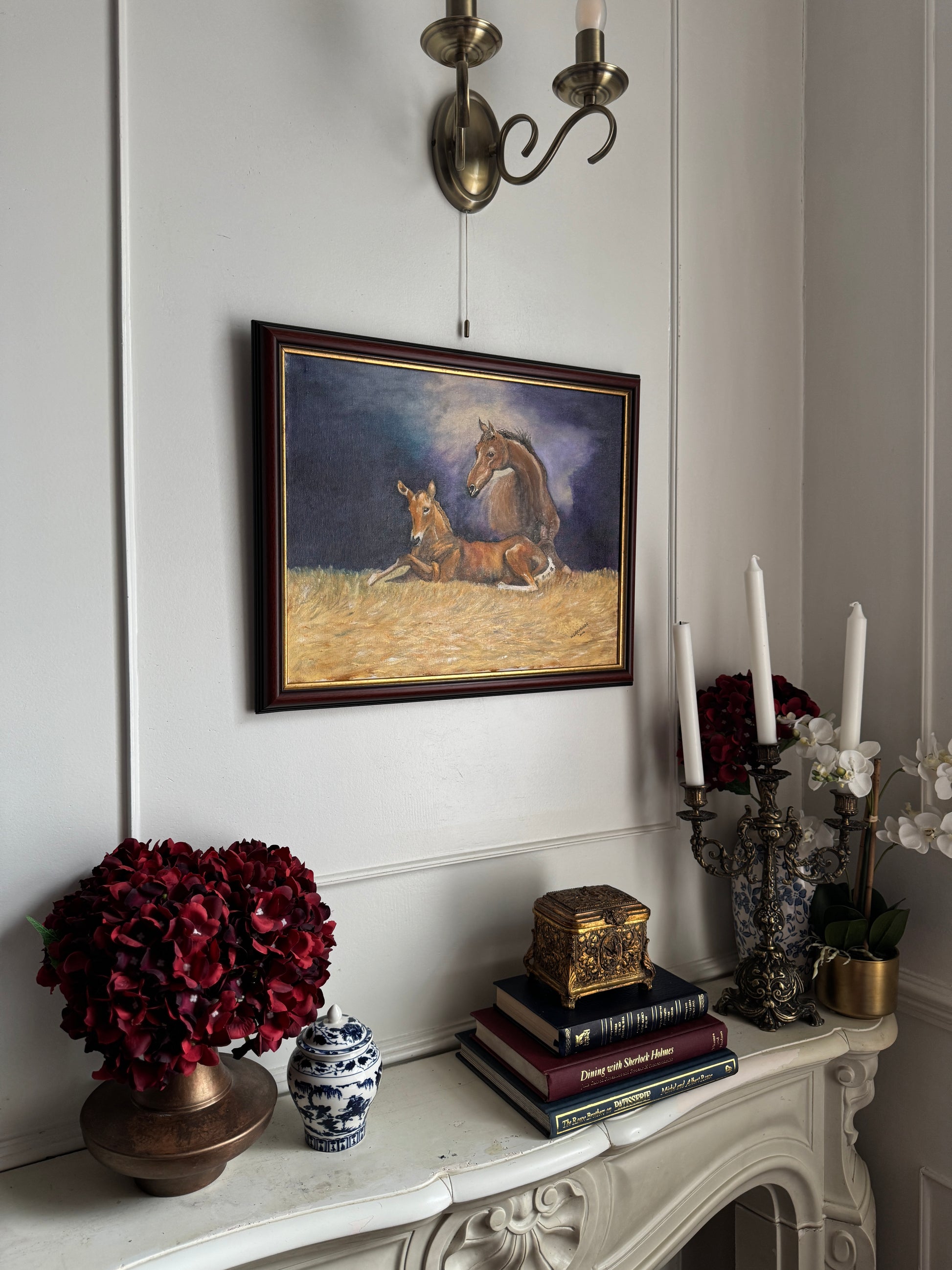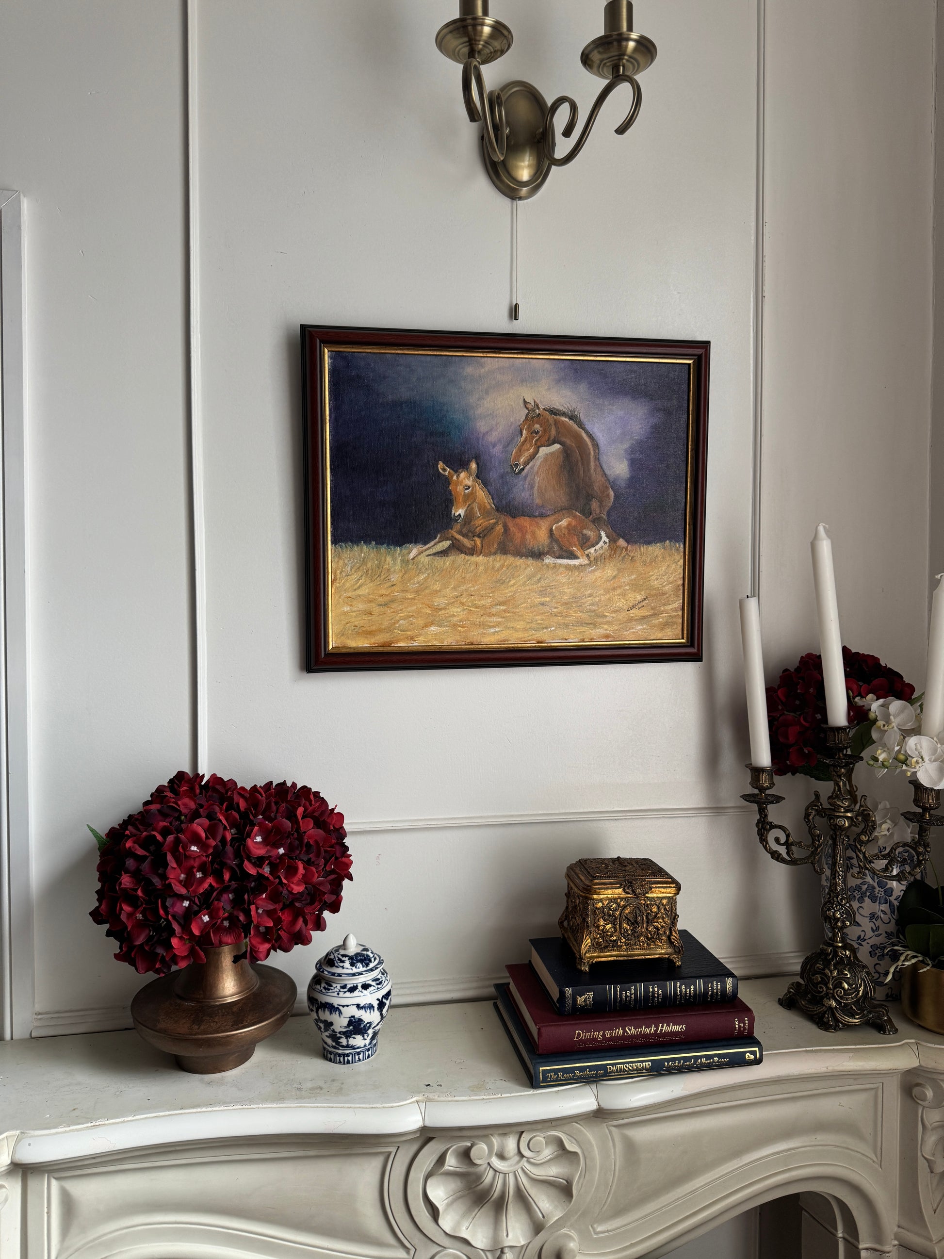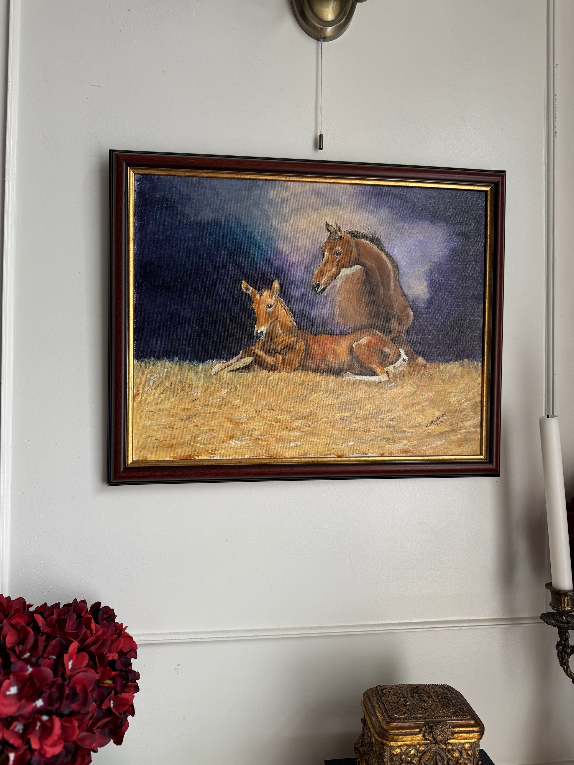 This gentle oil painting captures a moment of pure maternal love — a foal nestled close to its mother, their nuzzles tender and full of silent affection. The soft tones and brushwork reflect the peaceful rhythm of nature and the deep, unspoken bond shared between the two. A beautiful tribute to nurture, trust, and the quiet strength of motherhood.