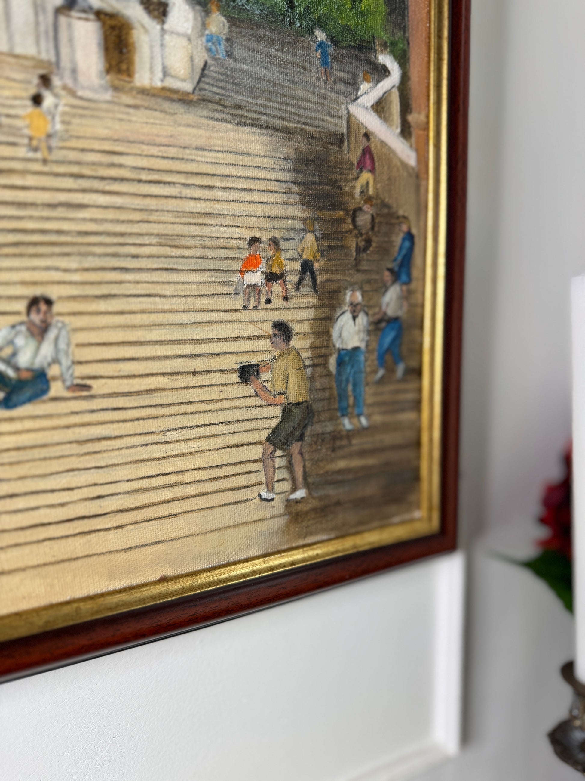 Wander through the heart of historic Italy with this striking depiction of a lively street scene, where grand stone staircases rise between characterful buildings. Rich in textures and sunlit hues, the piece is alive with the presence of visitors exploring centuries-old charm.