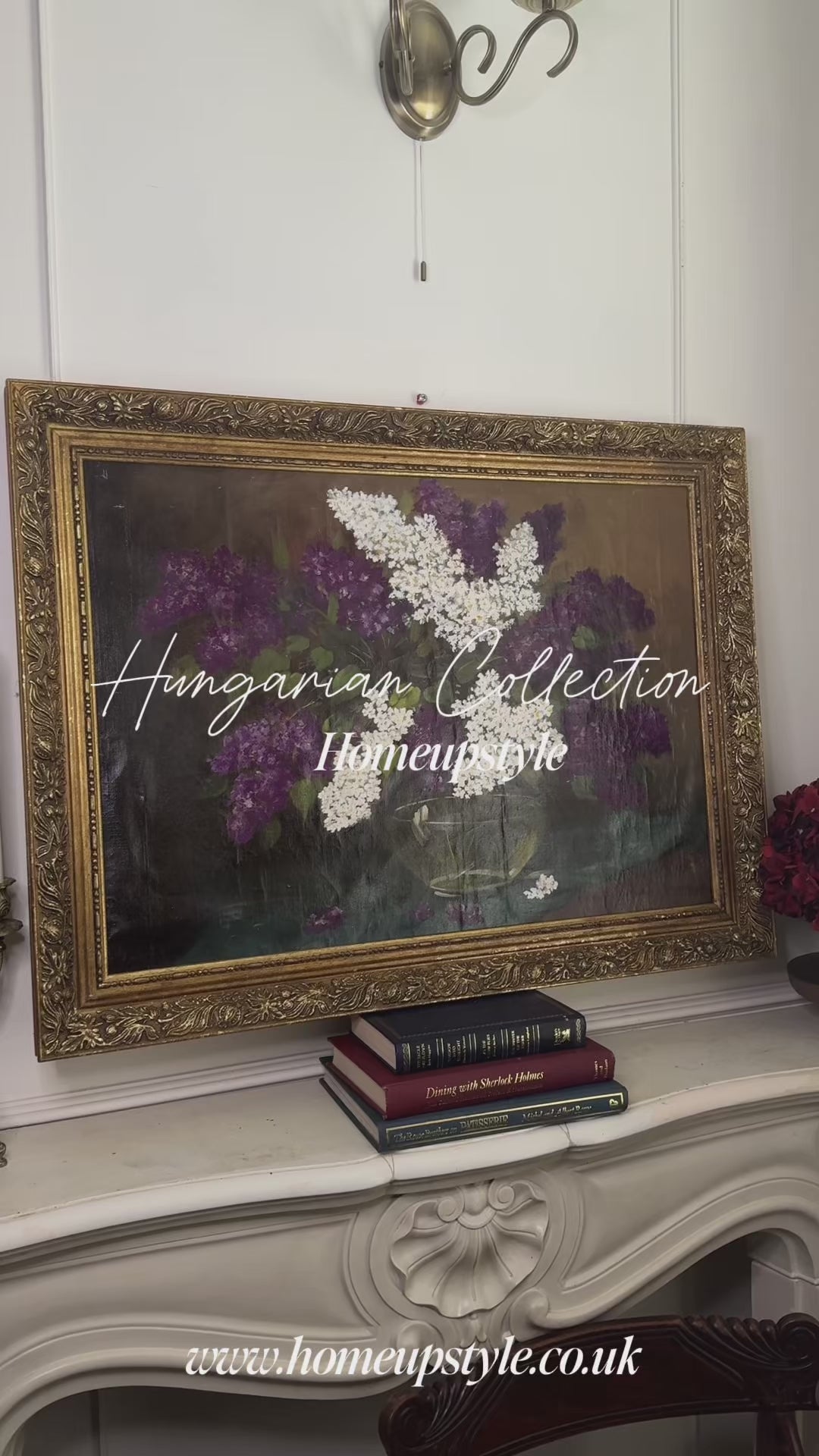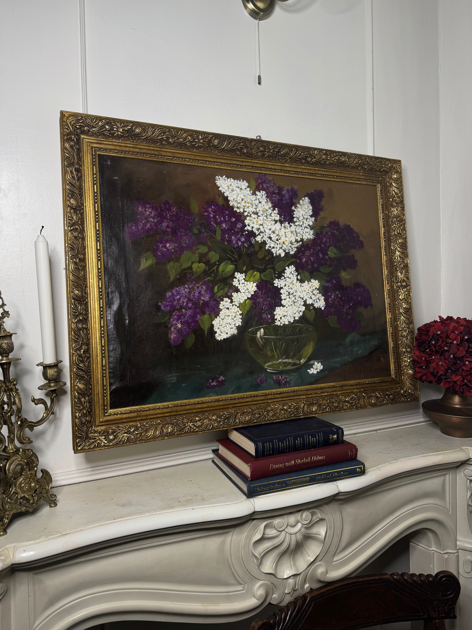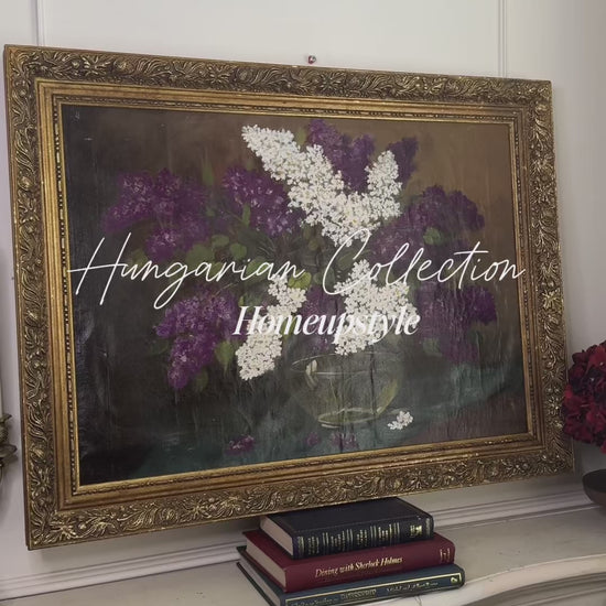 A stunning large imported Hungarian oil painting depicting a delicate bouquet of lilacs, masterfully rendered with rich texture and vibrant tones. The artwork is presented in an ornate gold gilt frame, enhancing its timeless elegance and classical charm. Its generous size makes it an impressive statement piece, ideal for adding warmth and sophistication to any interior. A rare and exquisite find, this painting combines fine artistry with European heritage, perfect for collectors or those seeking a touch of old-world luxury.