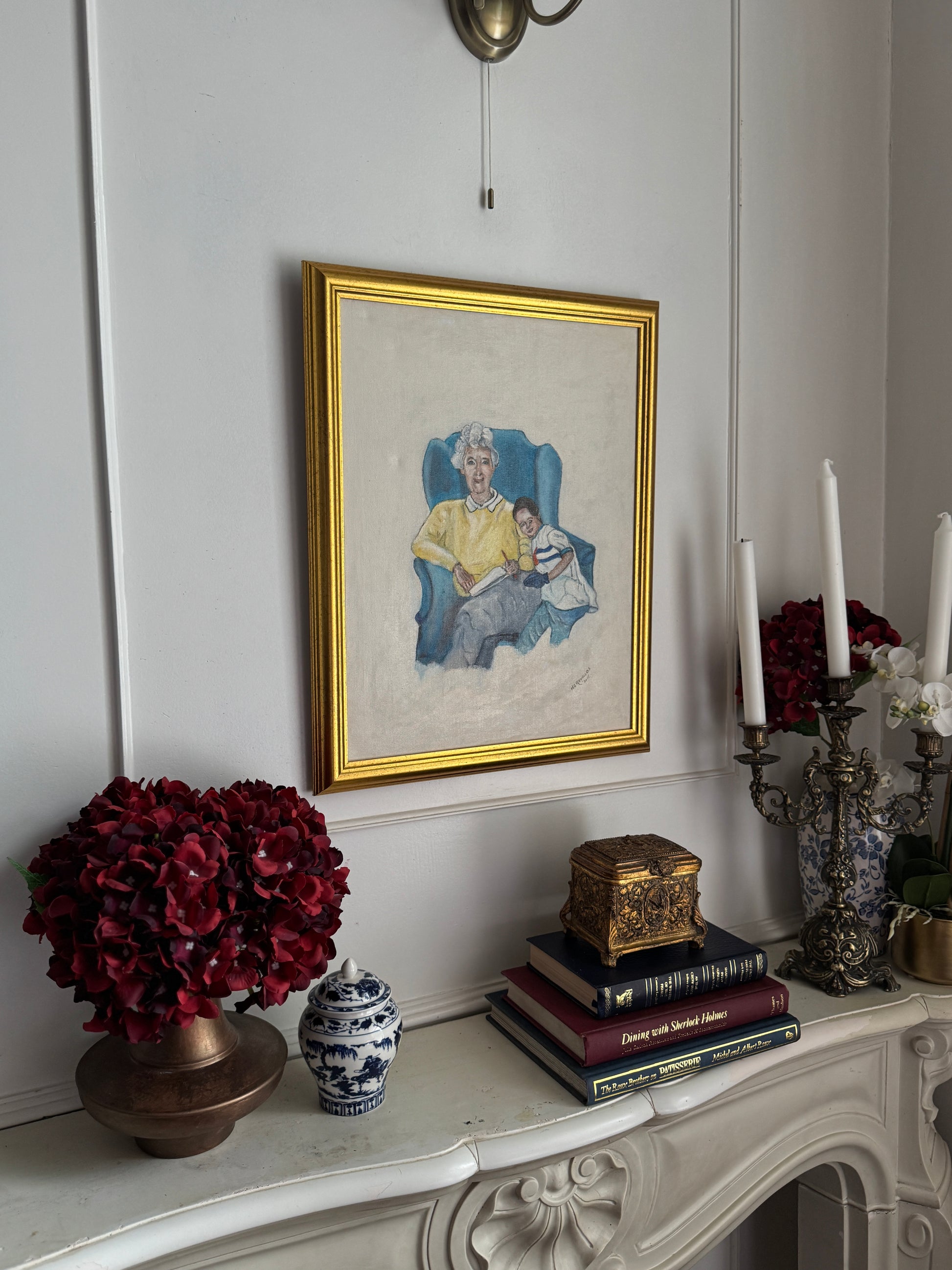 This touching painting beautifully portrays a heartfelt moment between a grandmother and the painter as a young child, wrapped in a warm, loving embrace. With gentle brushstrokes and soft, comforting colors, the artwork captures the deep connection, security, and unconditional love shared between them. The scene evokes feelings of nostalgia and family warmth, making it a perfect tribute to the precious bonds that shape our earliest memories. Ideal for anyone who cherishes the timeless love between generations.
