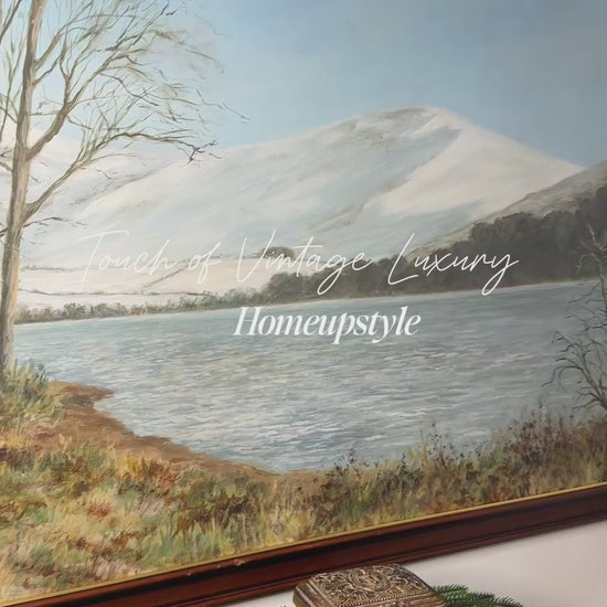 Bring breathtaking natural beauty into your home with this extra-large signed vintage oil painting, a stunning depiction of majestic mountains rising above a calm lakeside. Painted with incredible depth and realism, this piece captures the serene harmony between land, water, and sky — evoking a sense of peace and grandeur.