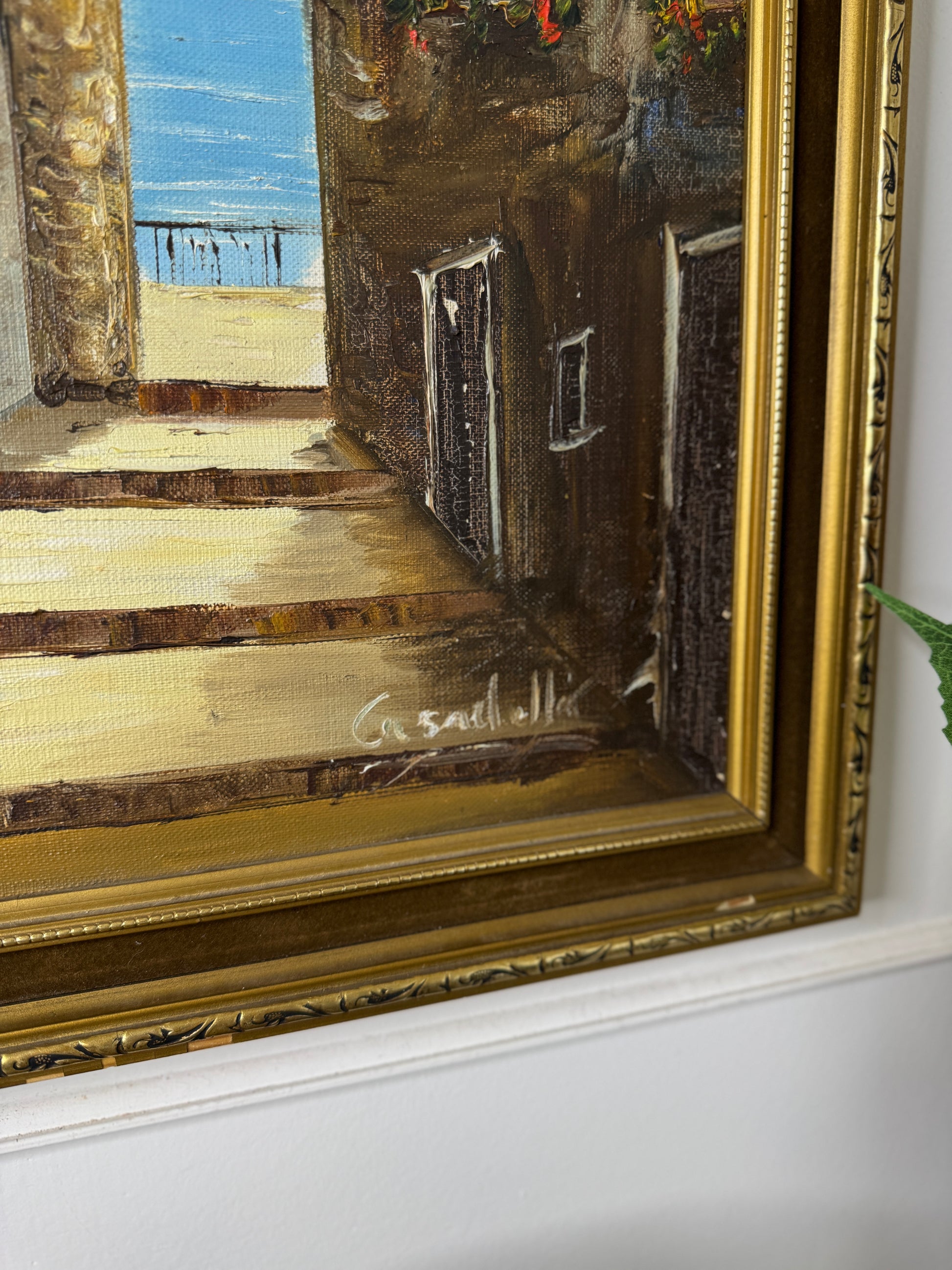 Immerse yourself in the warmth and charm of the Mediterranean with this original oil painting on canvas, depicting a picturesque coastal village. Created using the palette knife technique, the piece is alive with texture, vibrant colours, and expressive detail.