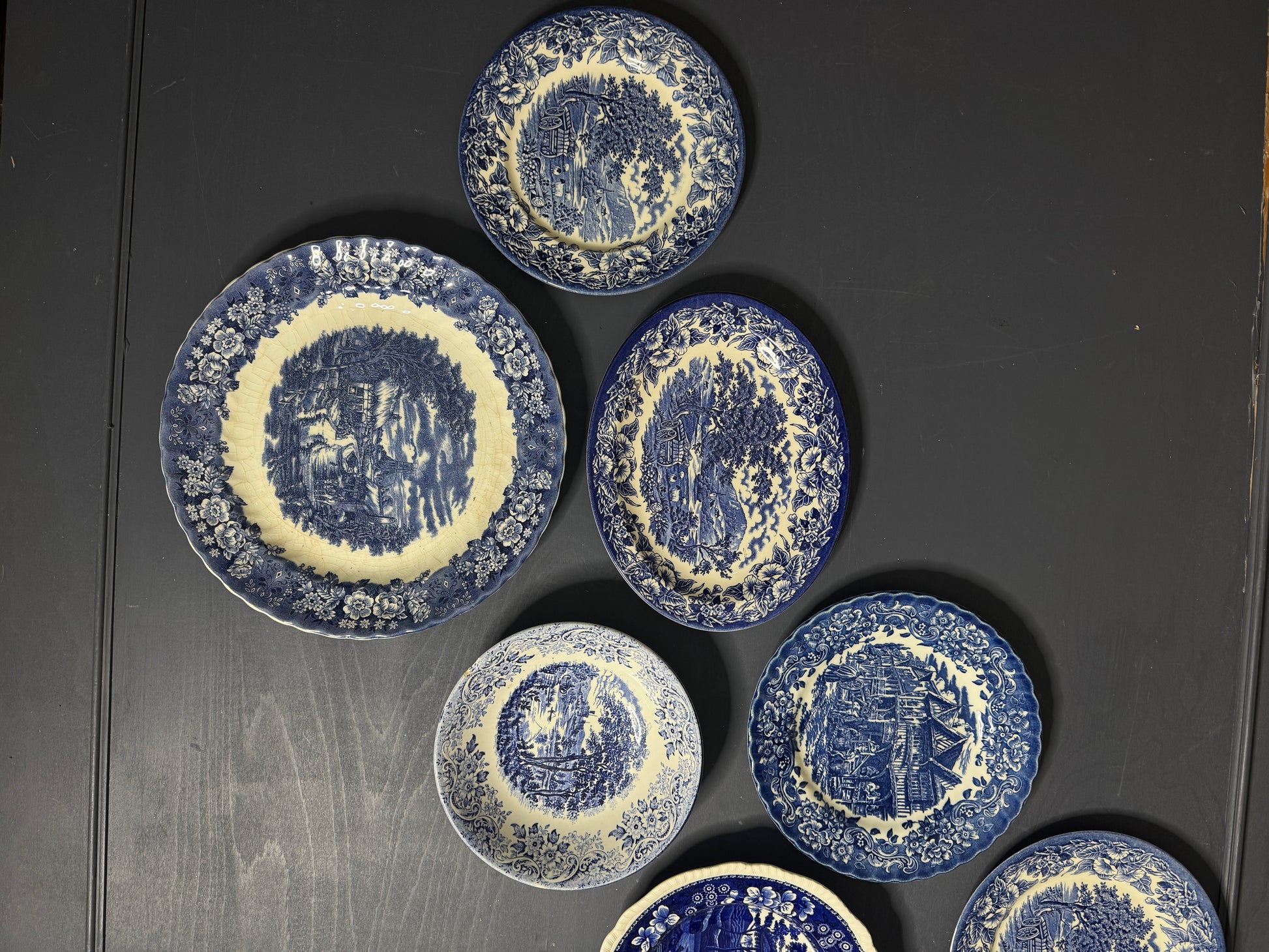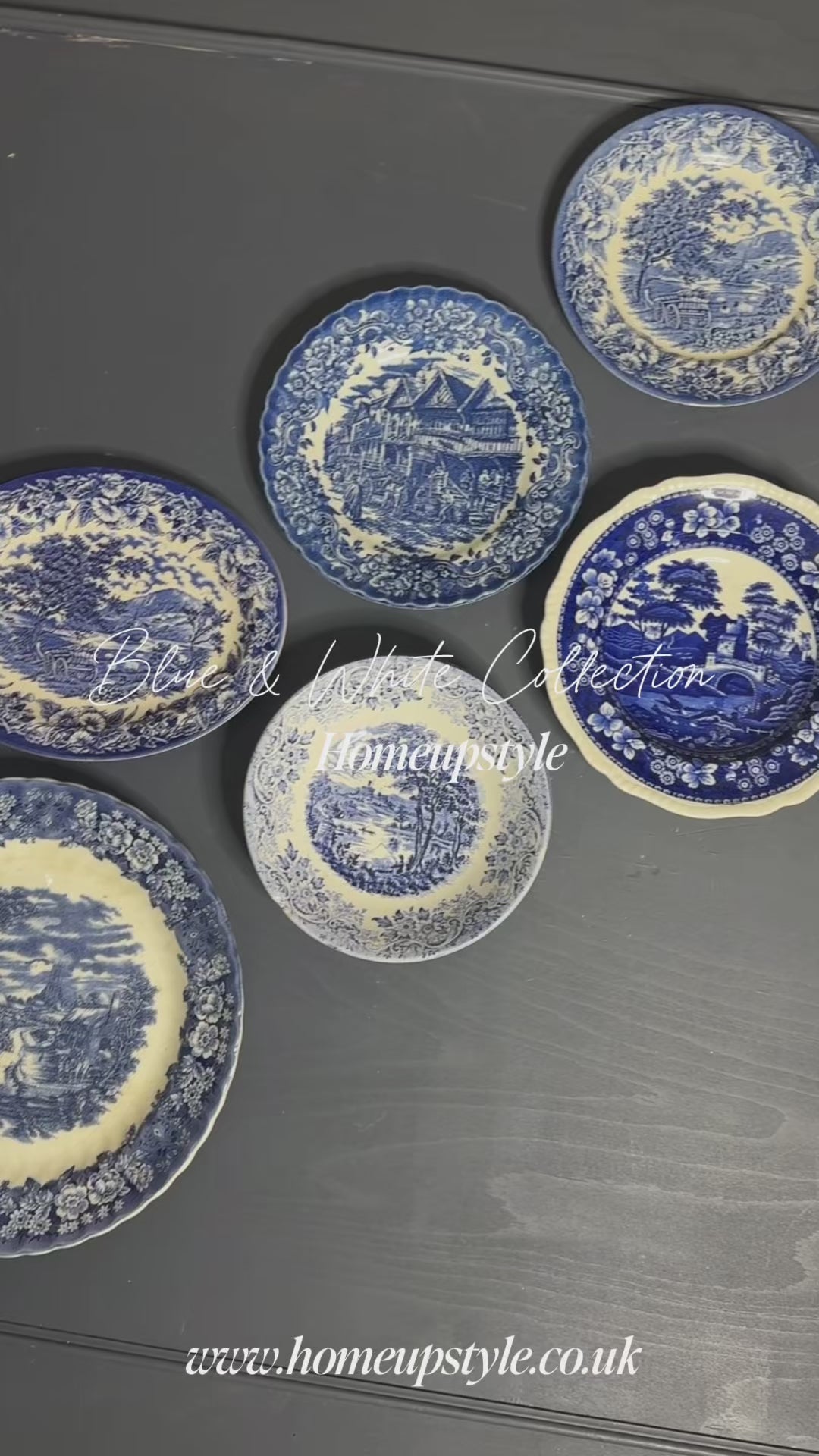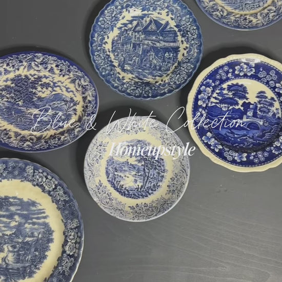Curated mix of blue and white English side plates in classic Willow style—perfect for decorative displays or eclectic wall art with timeless charm.