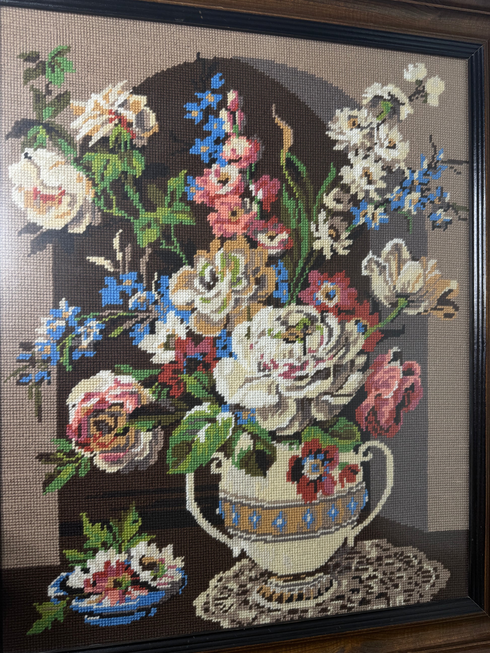 🌼 Design: Hand-stitched Gobelin embroidery of a flower bouquet