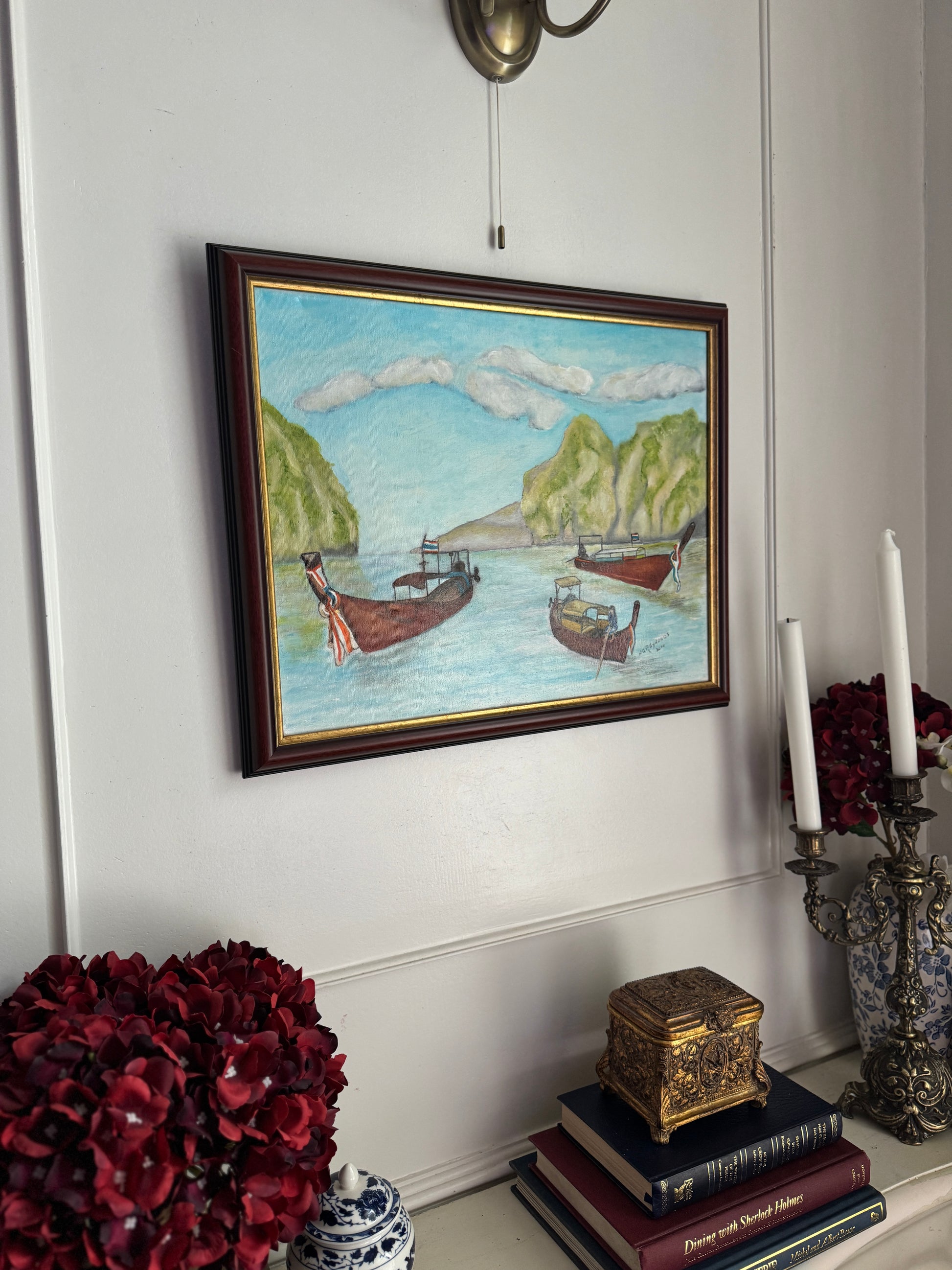 This captivating painting showcases the serene beaches of Thailand, featuring iconic long-tail boats gently resting on turquoise waters under a radiant sky. The artwork beautifully captures the vibrant colors and peaceful atmosphere of Thailand’s coastal scenery, inviting you to experience the laid-back island lifestyle and natural splendor. Perfect for those who adore tropical escapes and wish to bring a splash of exotic seaside charm into their home or office.