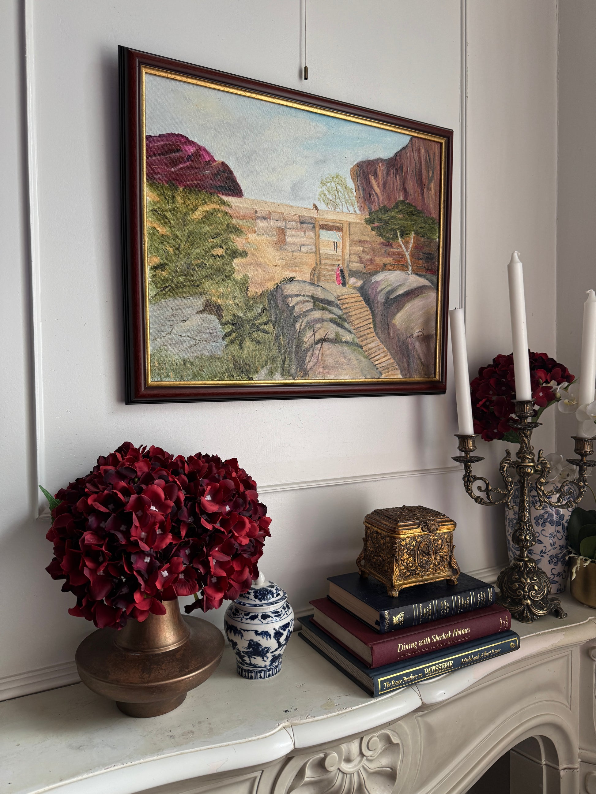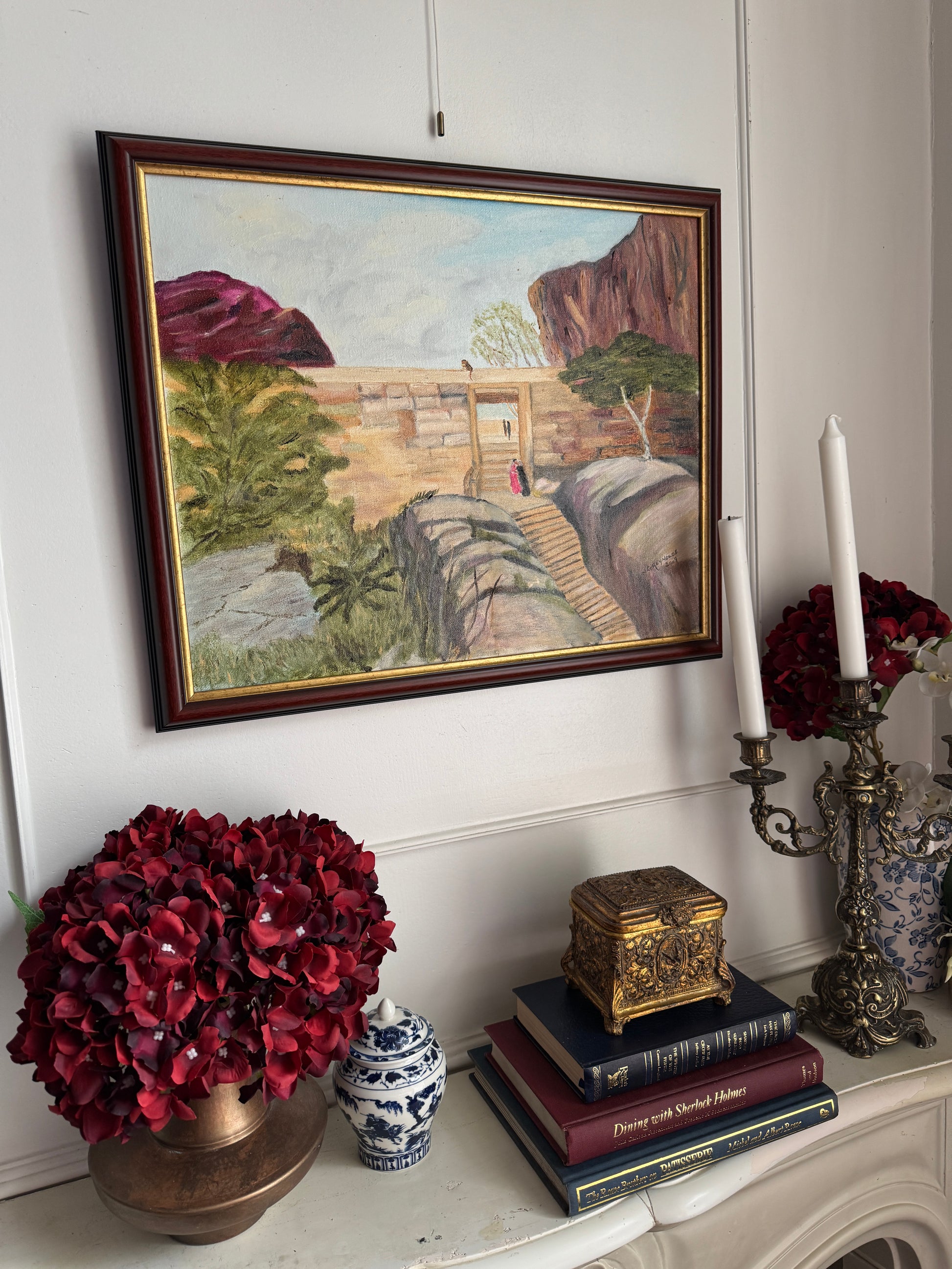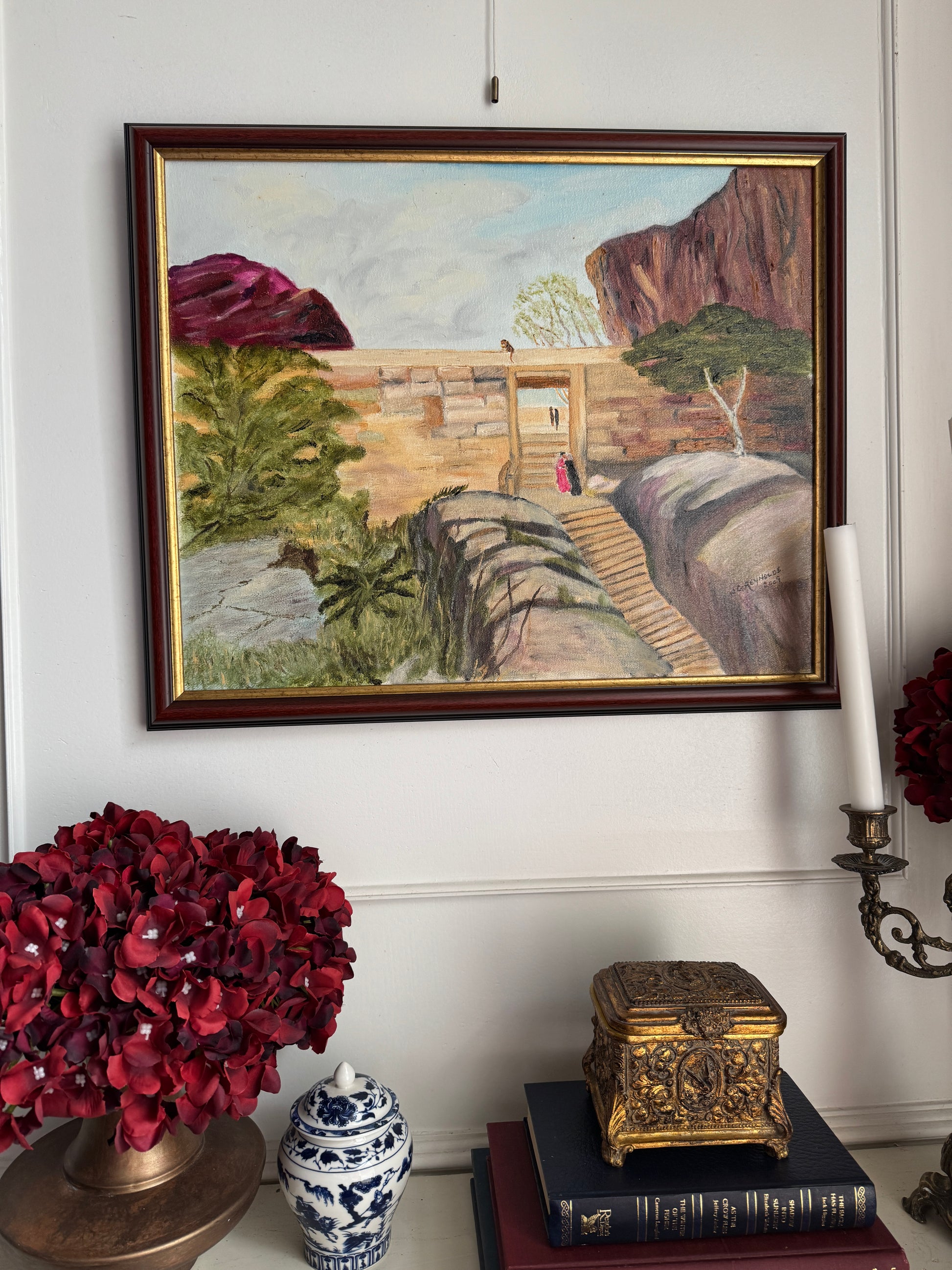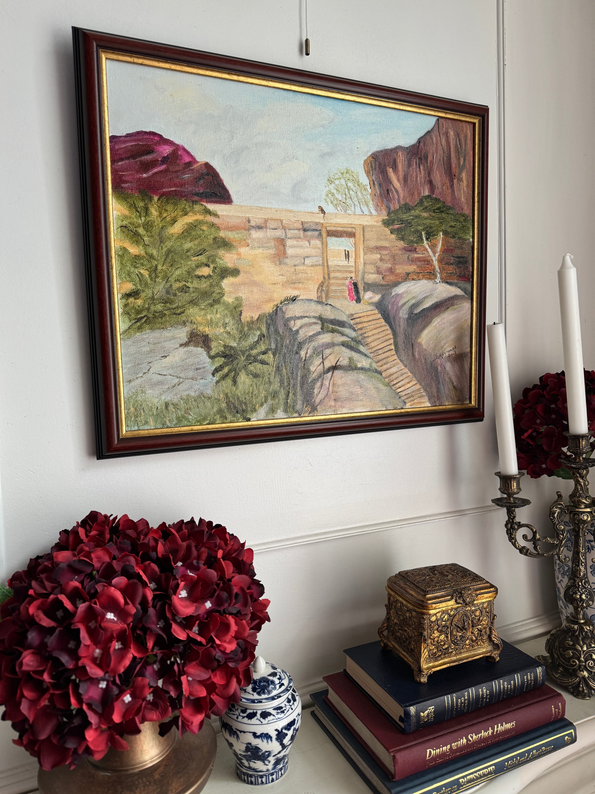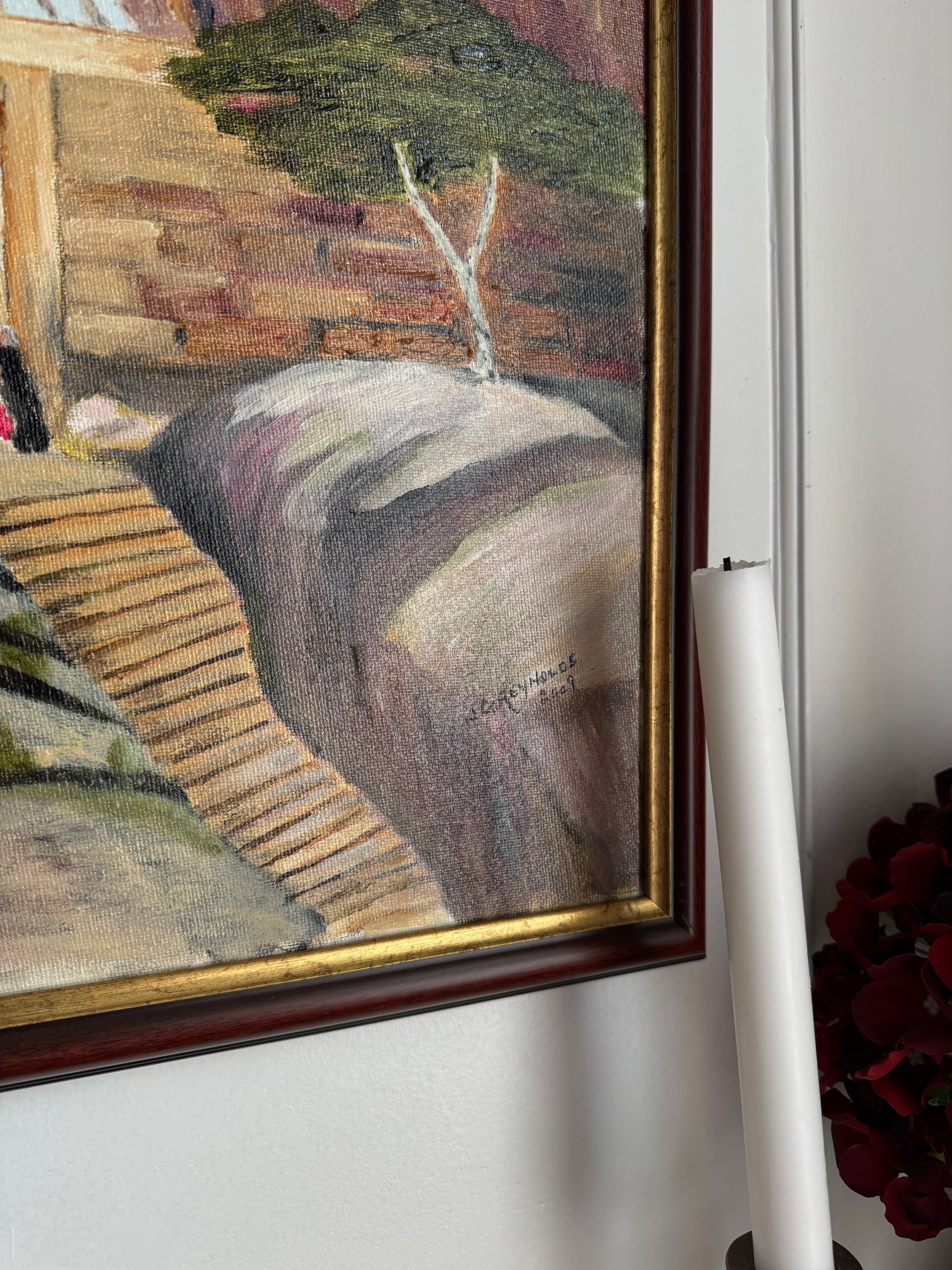 This captivating oil painting is set in a vintage wooden frame and was created by N.G. Reynolds, a late artist from Solihull known for his rich, worldly perspective. Throughout his life, Reynolds travelled extensively, capturing diverse cultures, landscapes, and scenes from around the globe in his artwork.