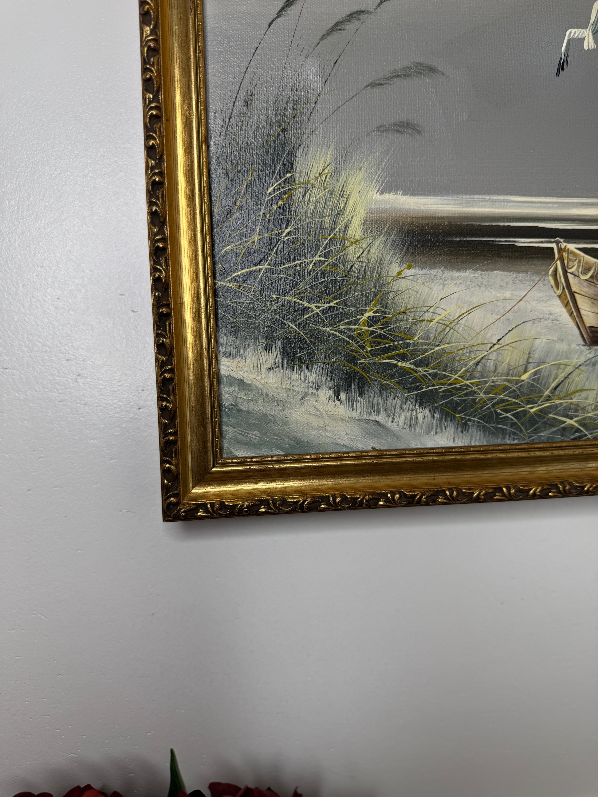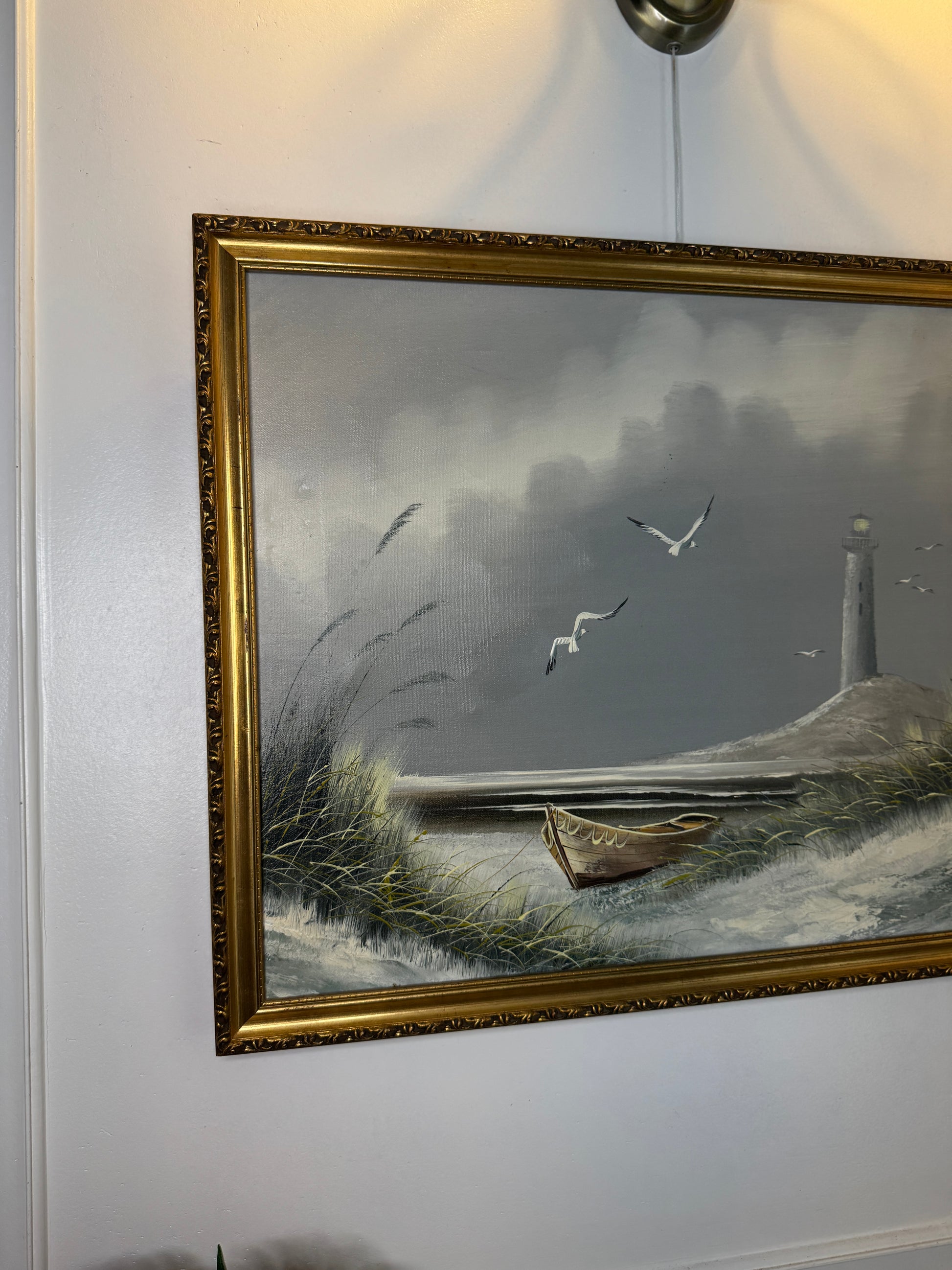 The painting is beautifully set in a detailed gold gilt frame, enhancing its coastal charm and classic elegance. Ideal for gallery walls, coastal-style interiors, or vintage decor settings.
