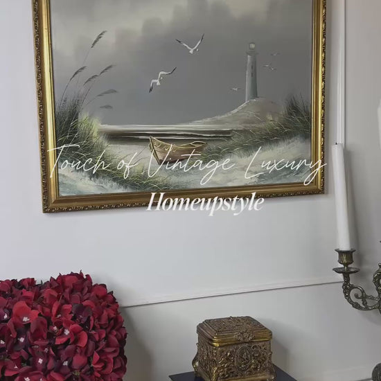 Bring the beauty and calm of the coastline into your space with this striking vintage oil painting. The seascape scene captures a lighthouse nestled among soft sand dunes, evoking a quiet and reflective mood. Although unsigned, the work showcases skilled brushwork and depth, making it a unique addition to any art lover’s collection.