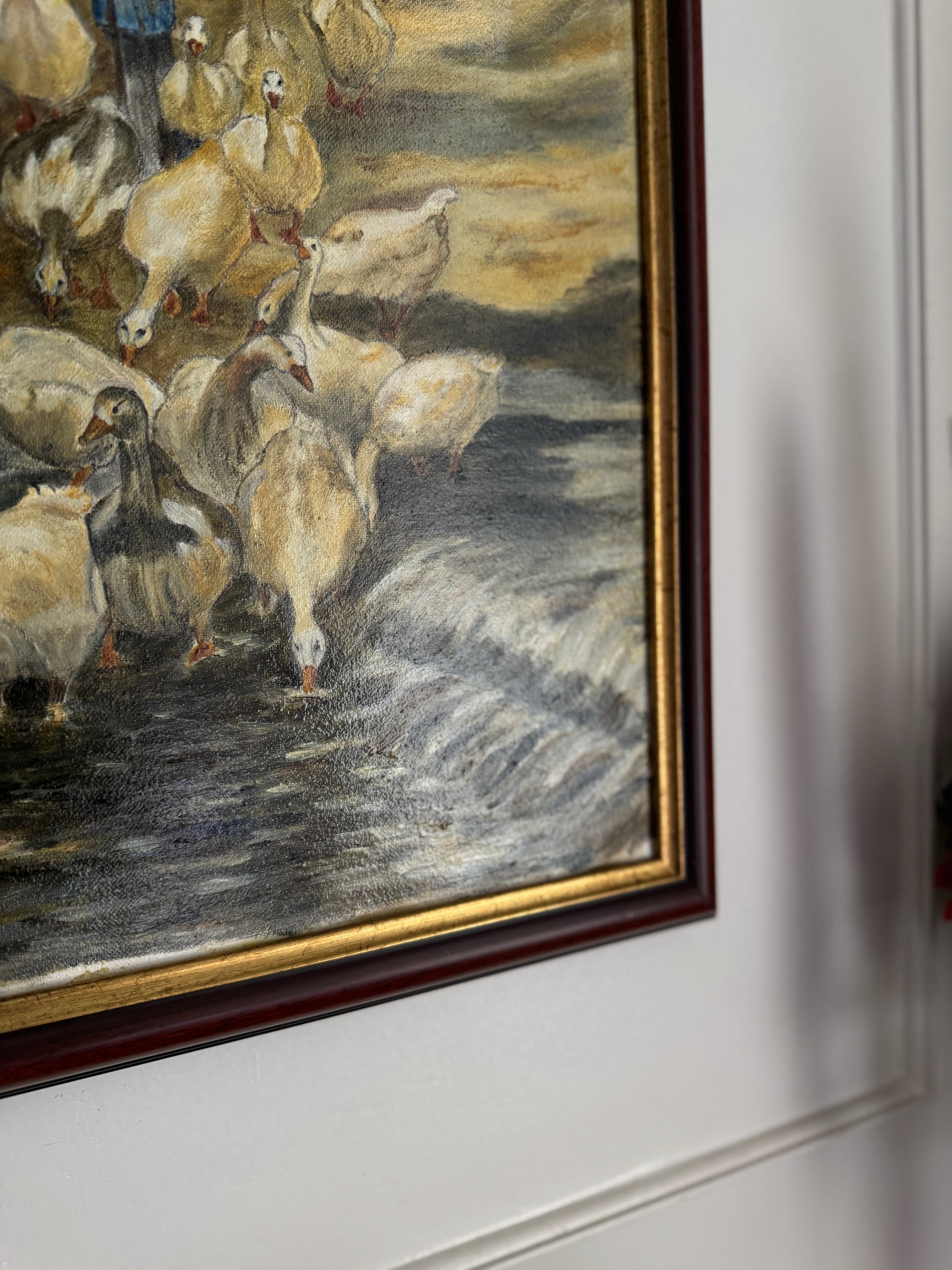 This tranquil painting beautifully portrays geese gathered at the edge of a quiet body of water, gently dipping their beaks as ripples spread across the reflective surface. The artist masterfully uses soft, natural tones to evoke a serene countryside moment, where wildlife and landscape merge in peaceful coexistence. Ideal for lovers of pastoral scenes and animal life, this artwork brings a sense of stillness, rhythm, and quiet appreciation for nature’s simplest rituals. Perfect for adding a calming presence to any space.