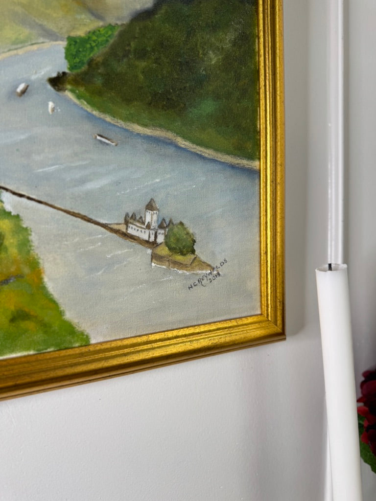 Step into a scene of timeless beauty with “Echoes by the River”, an original oil painting by esteemed artist N.G. Reynolds. This work captures the graceful decay of a small castle ruin standing quietly by the river’s edge, surrounded by the soft greens and florals of springtime. Rolling mountain silhouettes rise in the background, while sunlight glistens across the water — suggesting peace, resilience, and memory.
