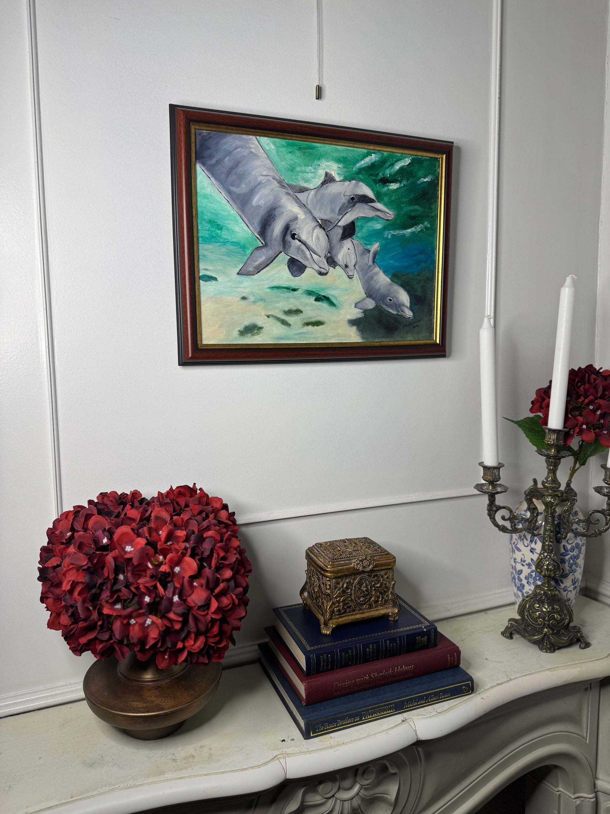 This joyful and dynamic original oil painting by British artist N.G. Reynolds captures the elegance and playful spirit of dolphins swimming side by side. Their fluid movements are beautifully expressed, reflecting the harmony of the ocean and the freedom of marine life.