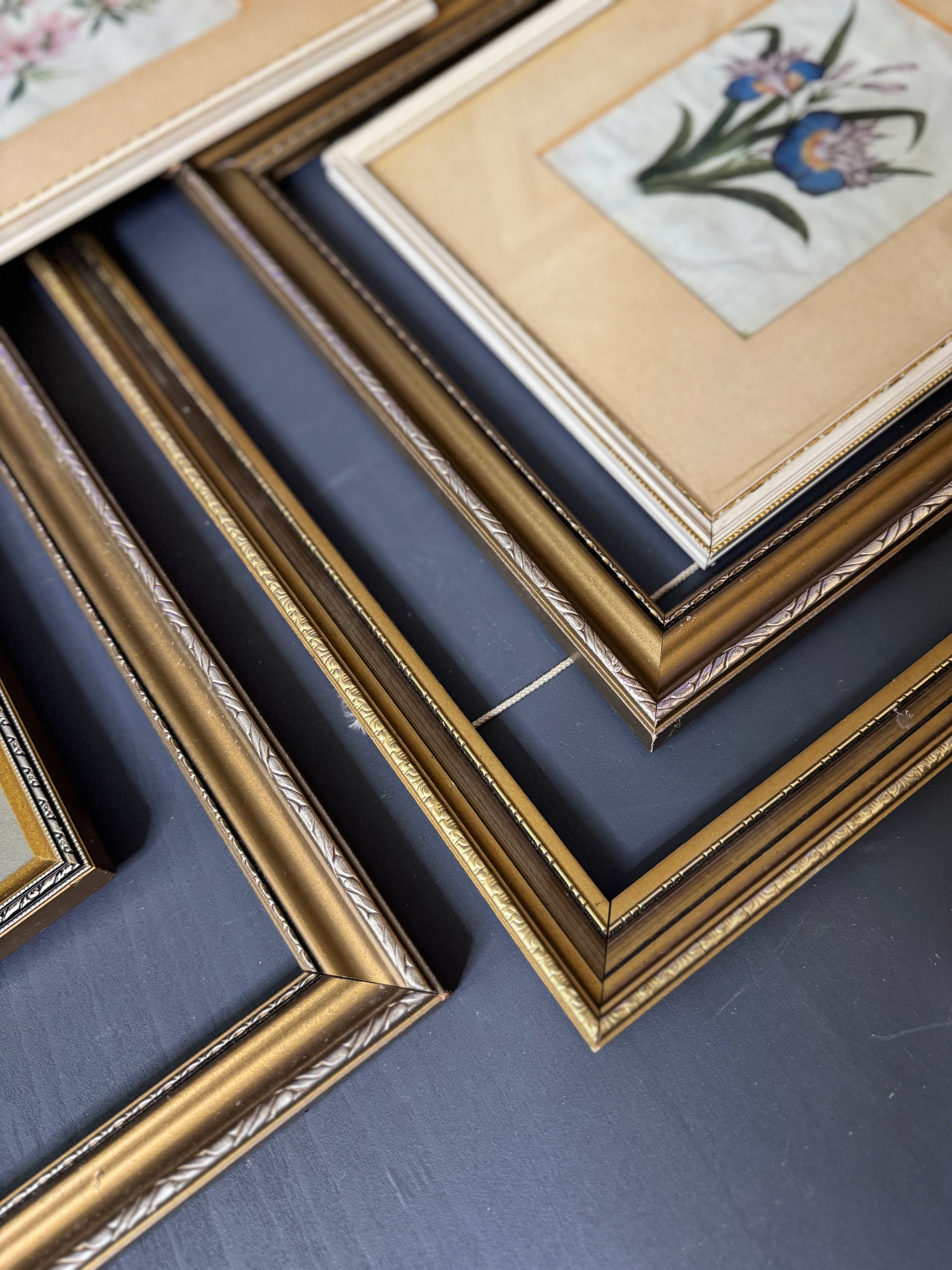 A gold gilt frame drop – an artful collection of empty vintage frames ready to add layers and texture to your wall styling.