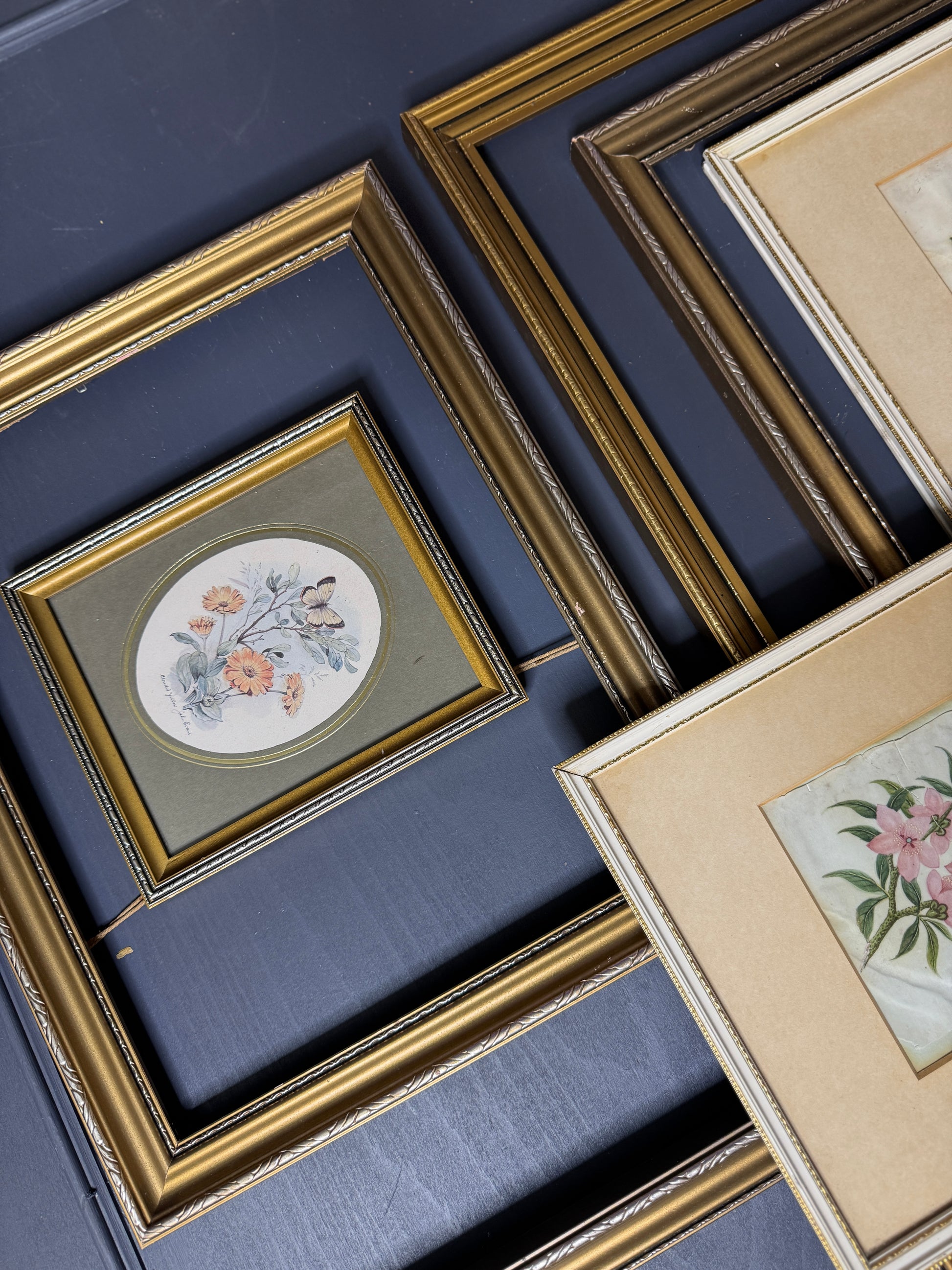 3 Vintage Floral Textile Artworks, delicately stitched and framed in beautiful gold gilt frames, showcasing soft botanical motifs.