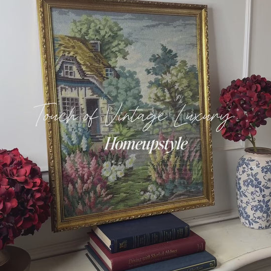 Bring timeless charm into your home with this hand-stitched vintage tapestry featuring a serene cottage scene surrounded by lush flowers. The warm tones and detailed embroidery capture the romance of countryside living, making it a stunning addition to any vintage, cottagecore, or traditional décor.