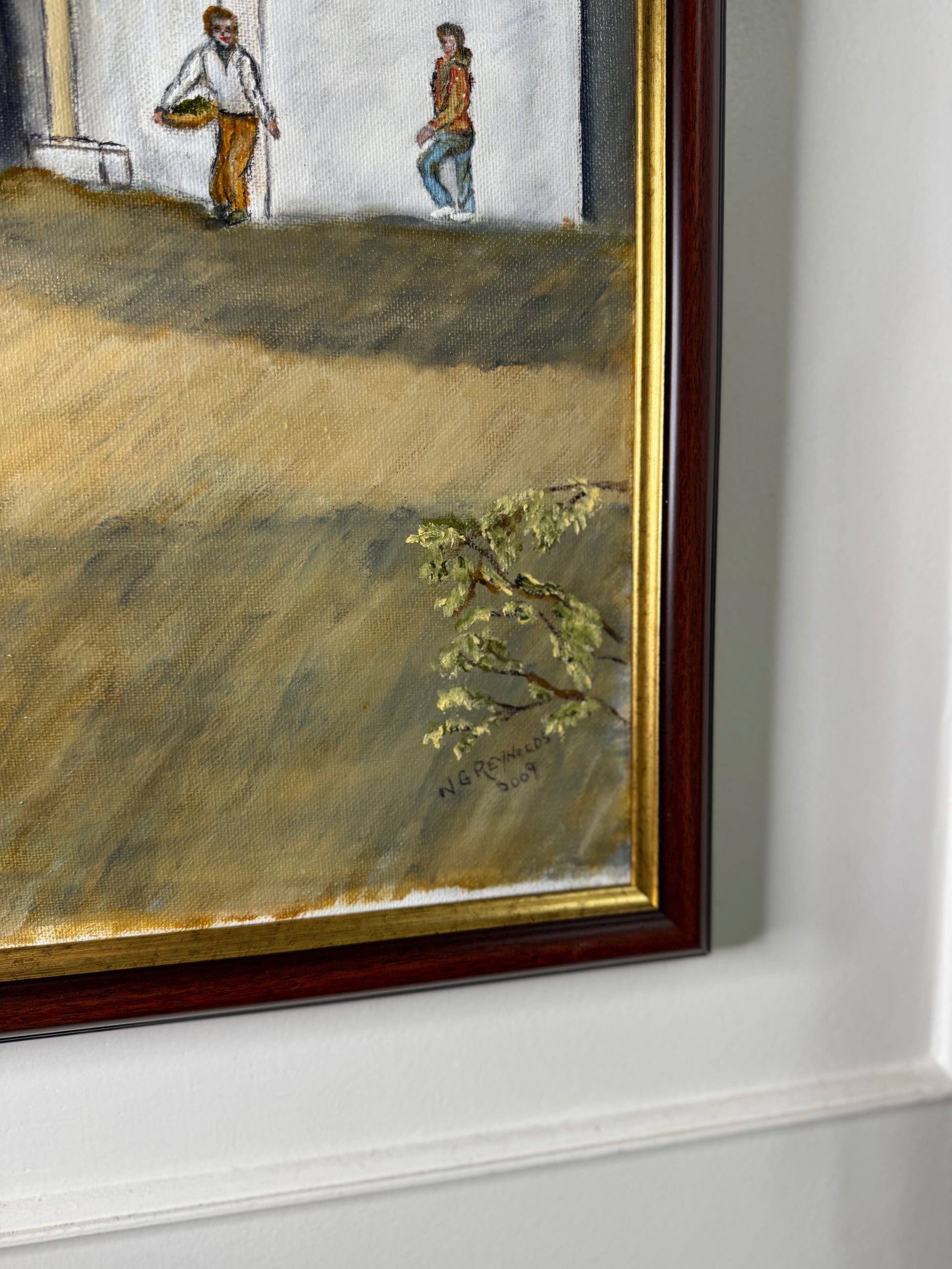 This captivating oil painting is set in a vintage wooden frame and was created by N.G. Reynolds, a late artist from Solihull known for his rich, worldly perspective. Throughout his life, Reynolds travelled extensively, capturing diverse cultures, landscapes, and scenes from around the globe in his artwork.