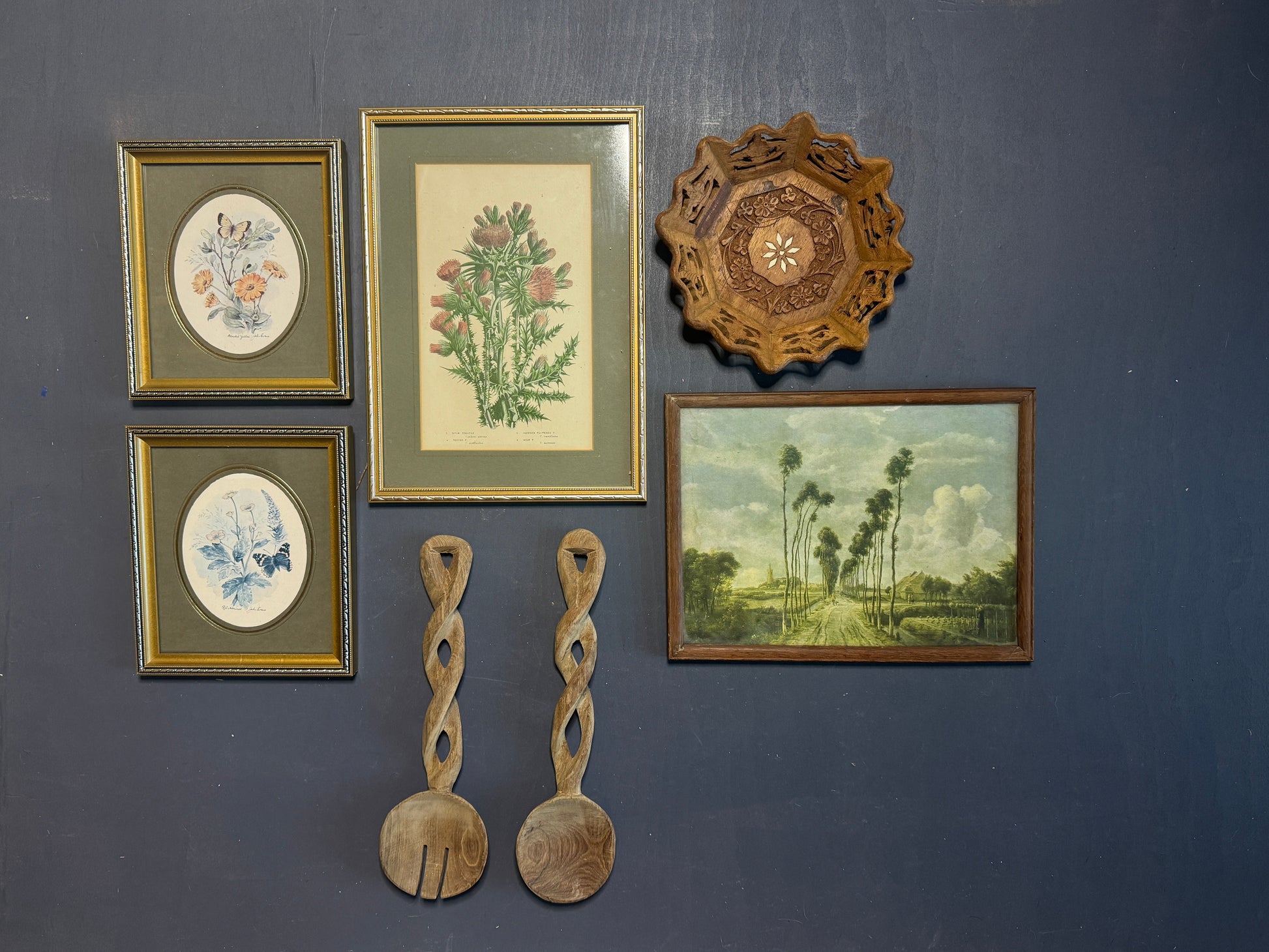 Create a warm, timeless farmhouse look in your home with this beautifully curated Vintage Rustic Gallery Wall Set, featuring a mix of earthy green and brown tones, wooden accents, and charming heritage décor pieces. This unique collection includes framed artwork, wooden wall spoons, and a vintage wooden tray—perfect for adding character to kitchens, hallways, dining spaces, or cottage-style interiors.
