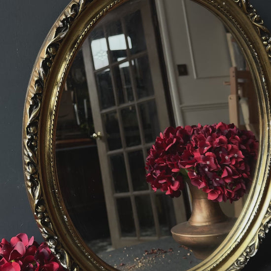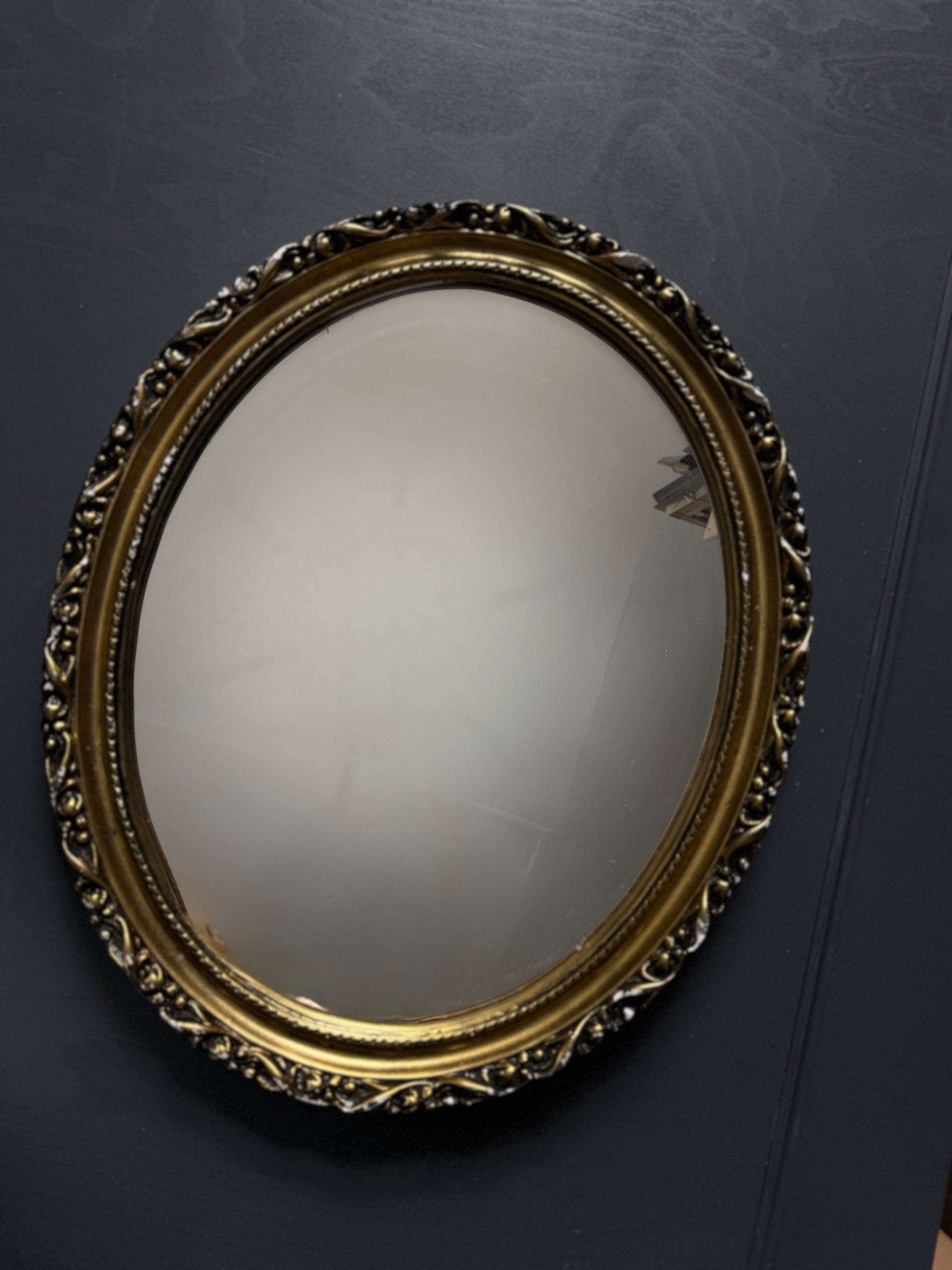 This vintage oval mirror features a stunning gold gilded frame with subtle decorative detailing and a gently aged patina, adding elegance and character. The medium size makes it ideal for use in an entryway, above a vanity, or as part of a gallery wall. Its graceful oval shape softens any space, while the gold finish brings a warm, timeless feel.