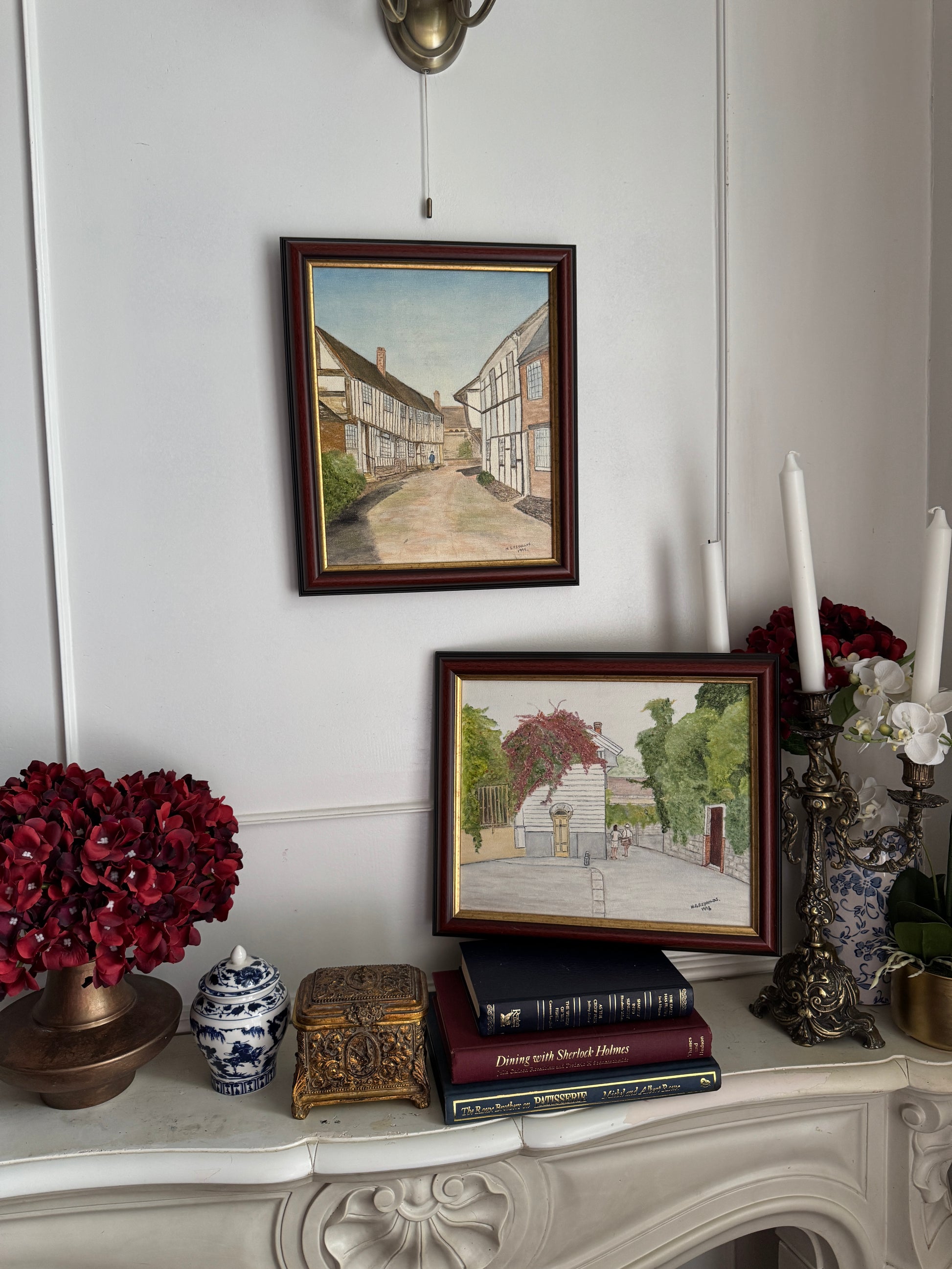 This delightful pair of original paintings transports you to the historic streets of Alcester, a picturesque English market town known for its Tudor charm and timeless beauty. Each painting beautifully captures the distinctive character of the streets—cobbled paths, warm brickwork, and the gentle curve of rooftops. With soft, romantic tones and delicate detail, this duo invites you to wander through quiet alleys and imagine stories unfolding within the walls. Ideal for traditional interiors, heritage lovers, or those seeking a touch of English countryside charm on their gallery wall.