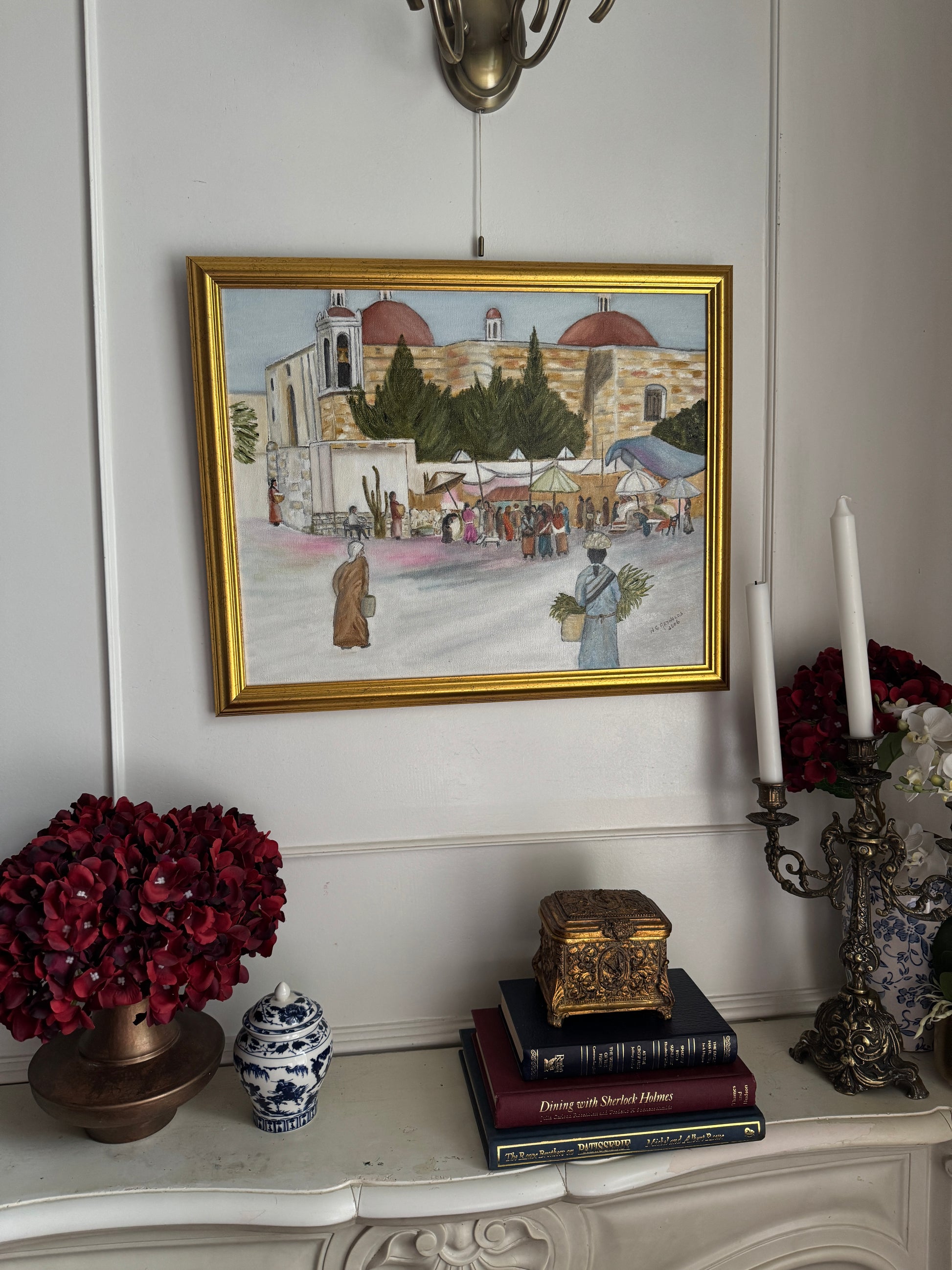 This captivating painting brings to life the bustling streets and colorful markets of Morocco, featuring intricate details and vivid hues that reflect the vibrant culture and daily rhythms of the medina. The artwork showcases the lively market stalls, traditional architecture, and the warm sunlight filtering through narrow alleys, offering a window into Morocco’s rich heritage. Perfect for lovers of travel-inspired art and those seeking to infuse their space with worldly elegance and warmth.