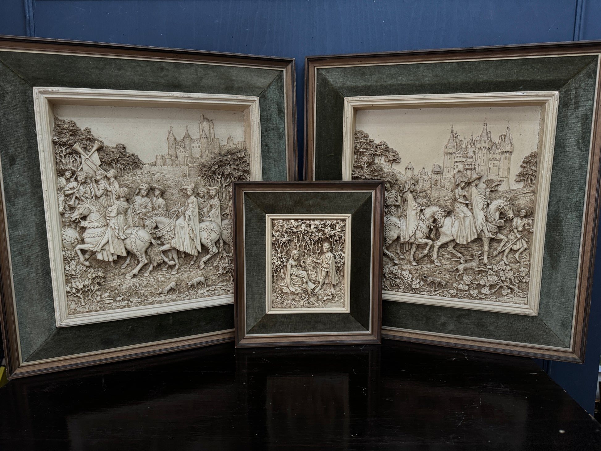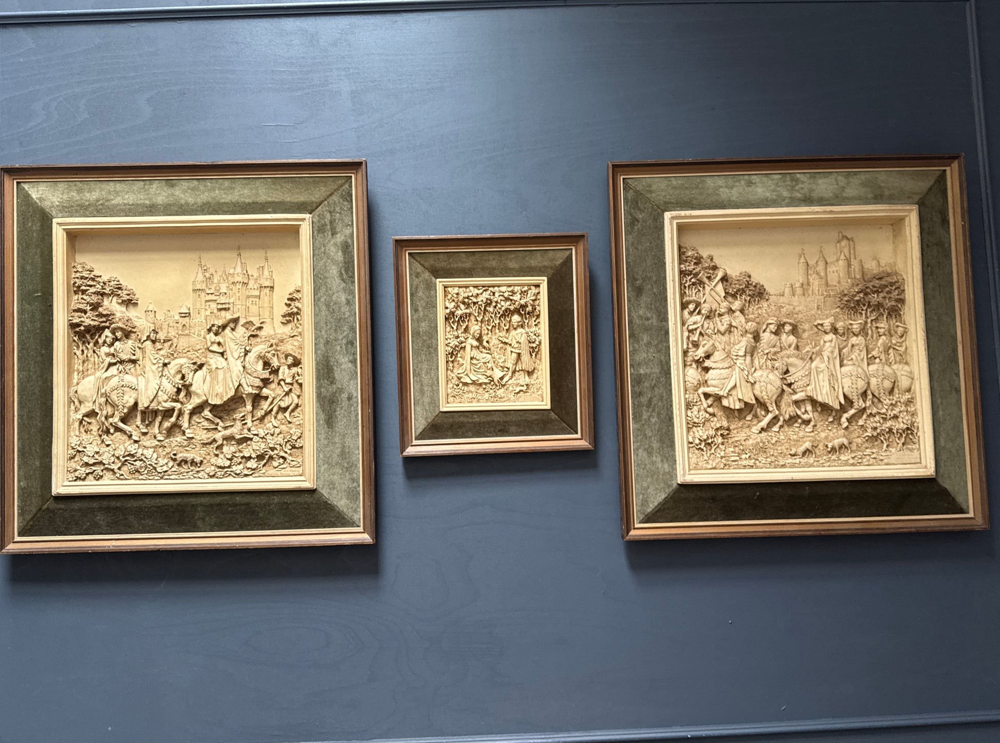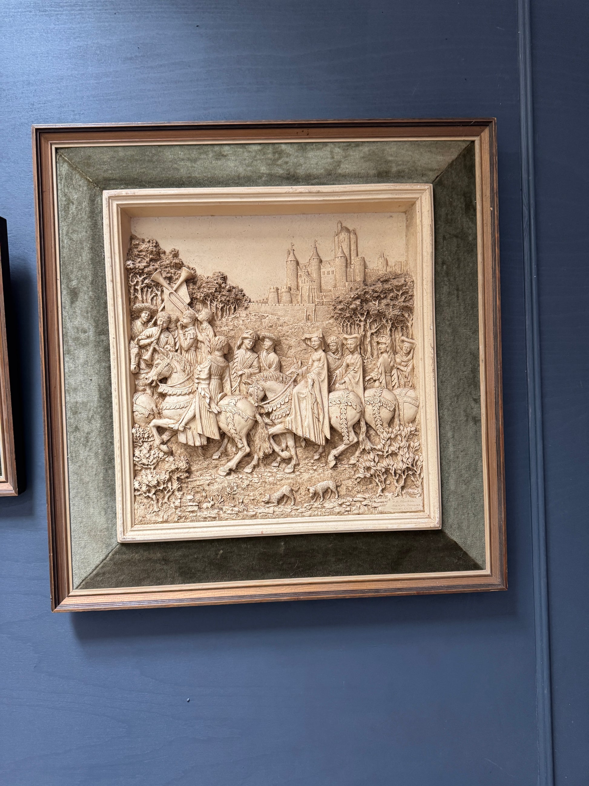 Discover the charm of Marcus Designs—a renowned maker of intricately handcrafted wall art and plaques from the 1970s and early 1980s. Known for their detailed raised relief scenes and unique storytelling through art, each piece was made in England with exceptional craftsmanship, often depicting historical, romantic, or pastoral themes.
