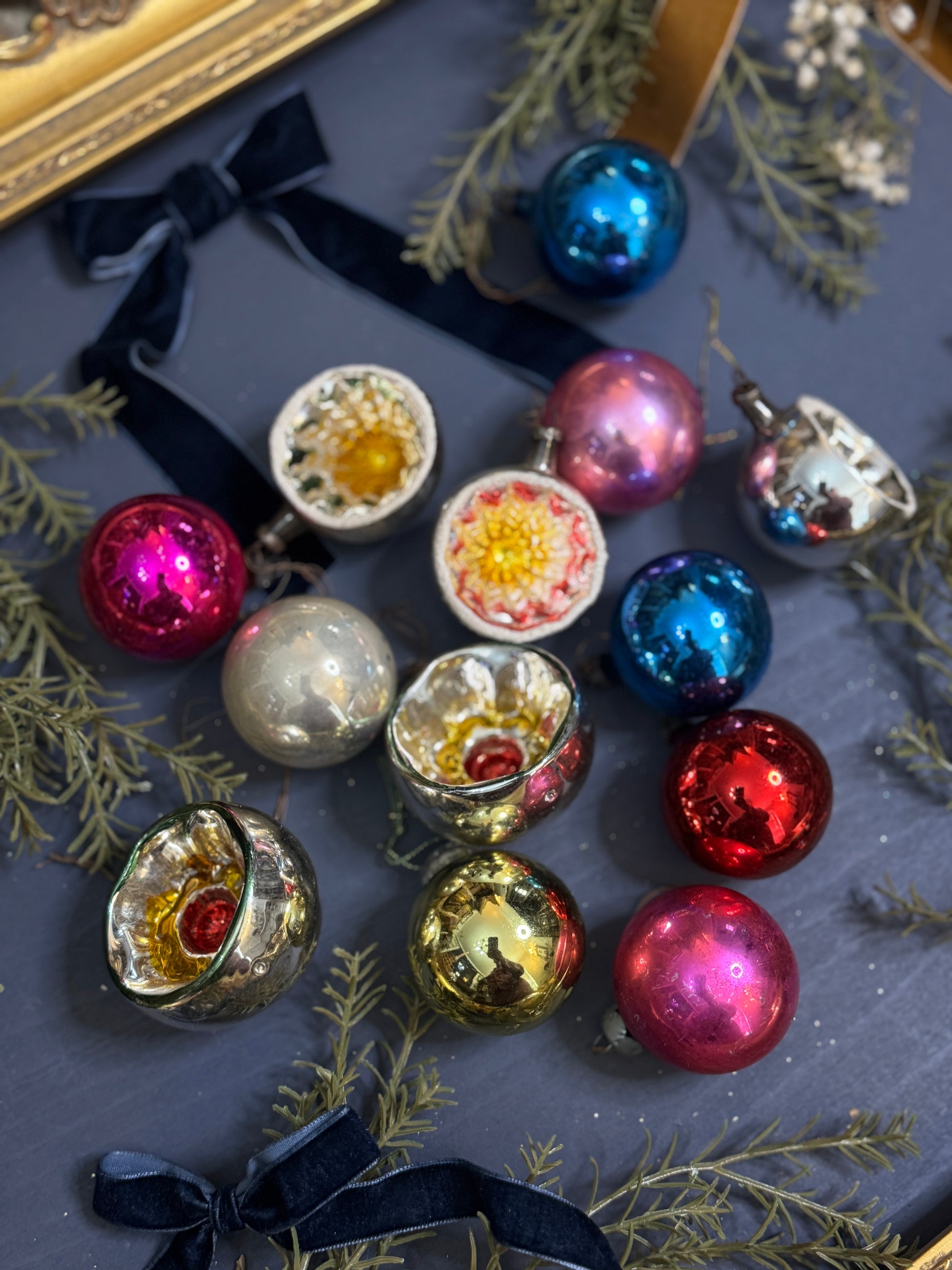 This mixed-size collection (5–6 cm) includes a variety of unique patterns and colours, bringing personality, sparkle, and timeless beauty to your Christmas tree. Their authentic vintage finish and soft patina make them perfect for creating a cosy, story-filled holiday atmosphere.
