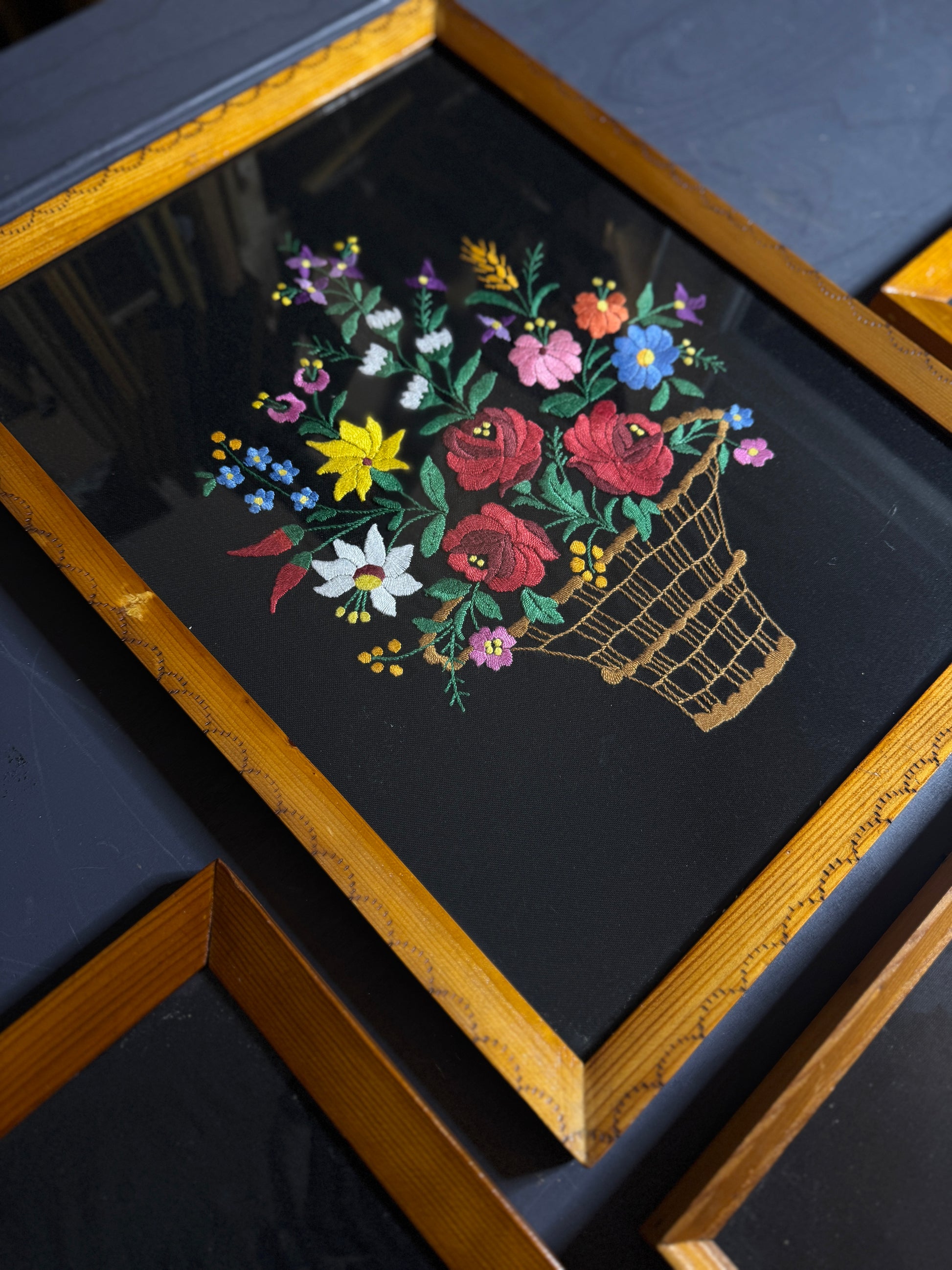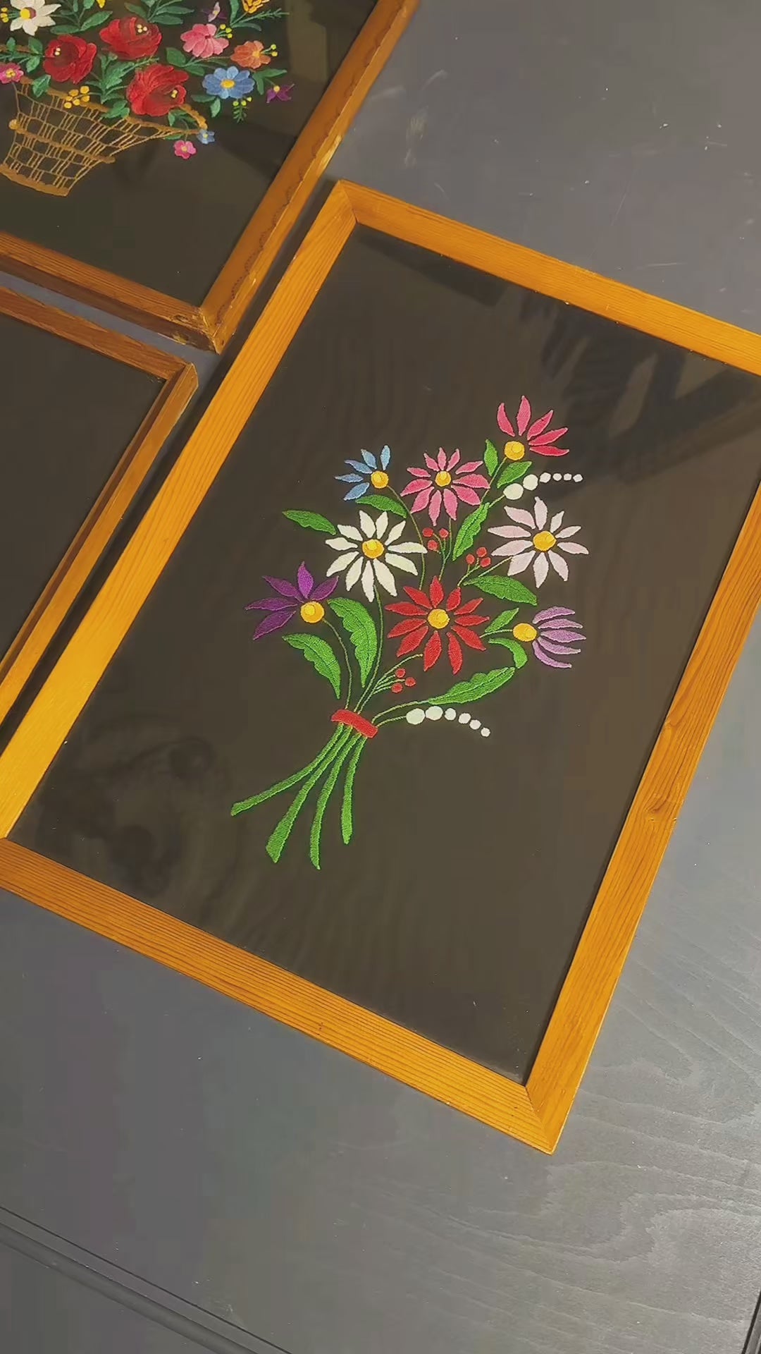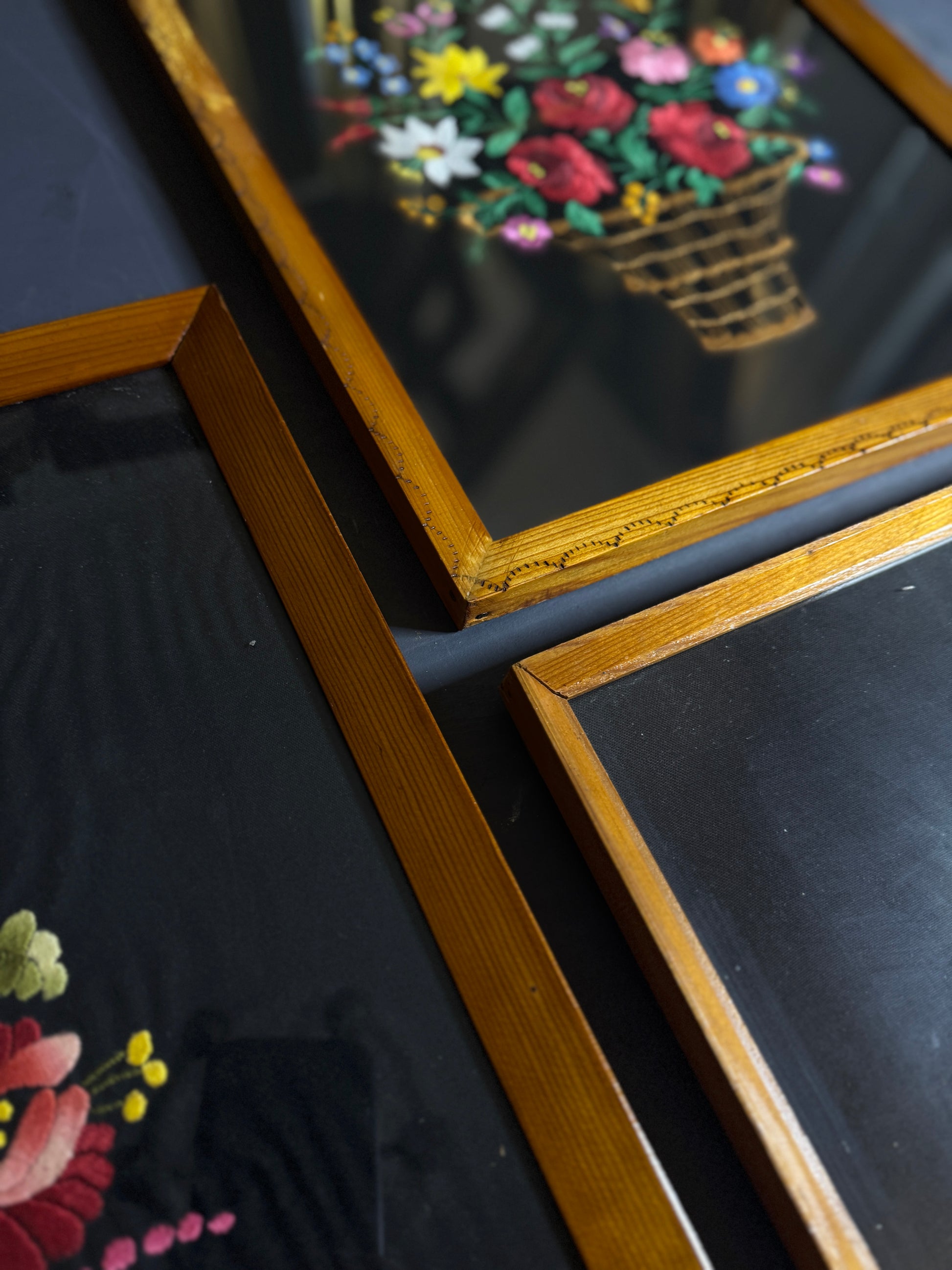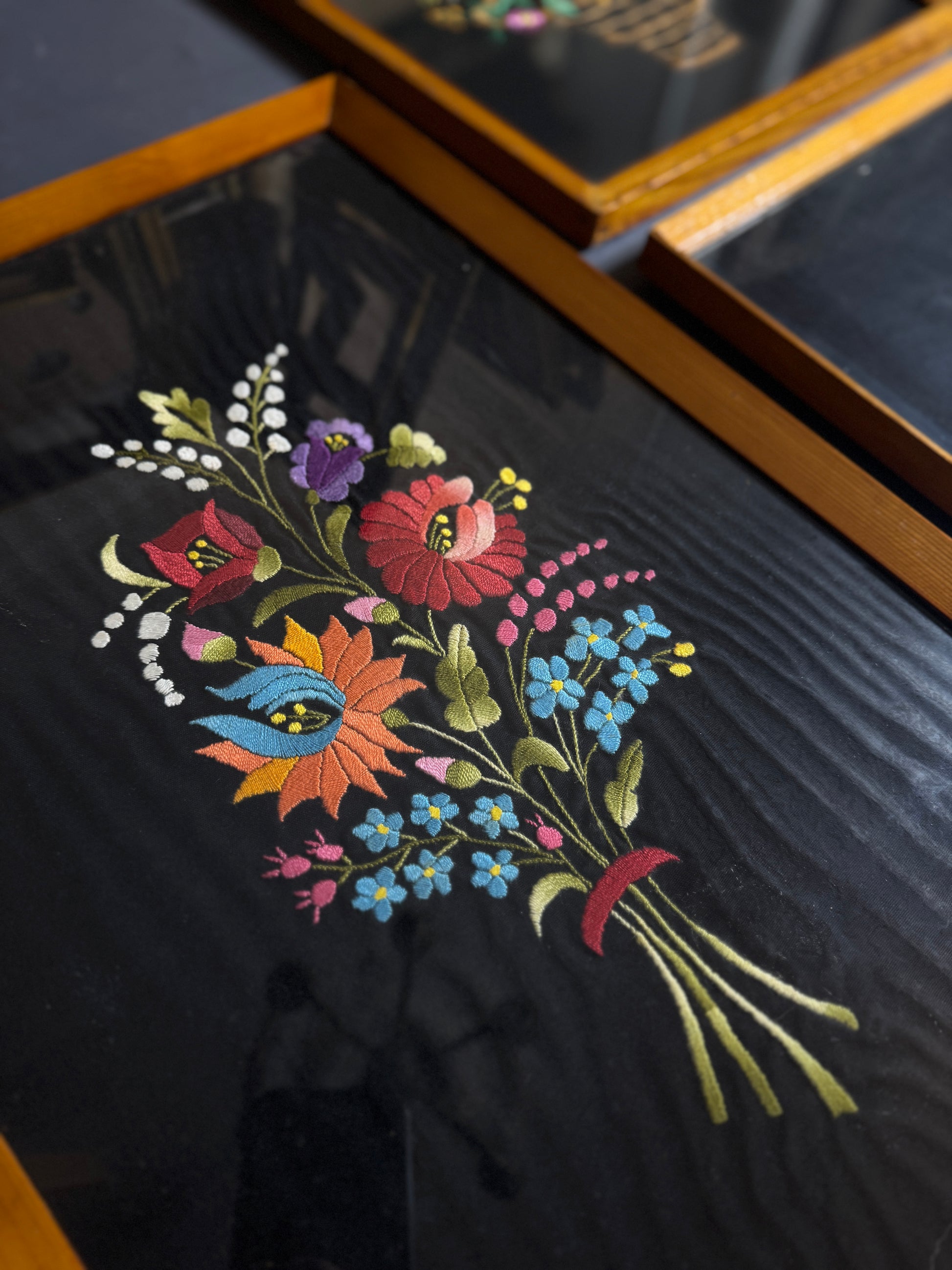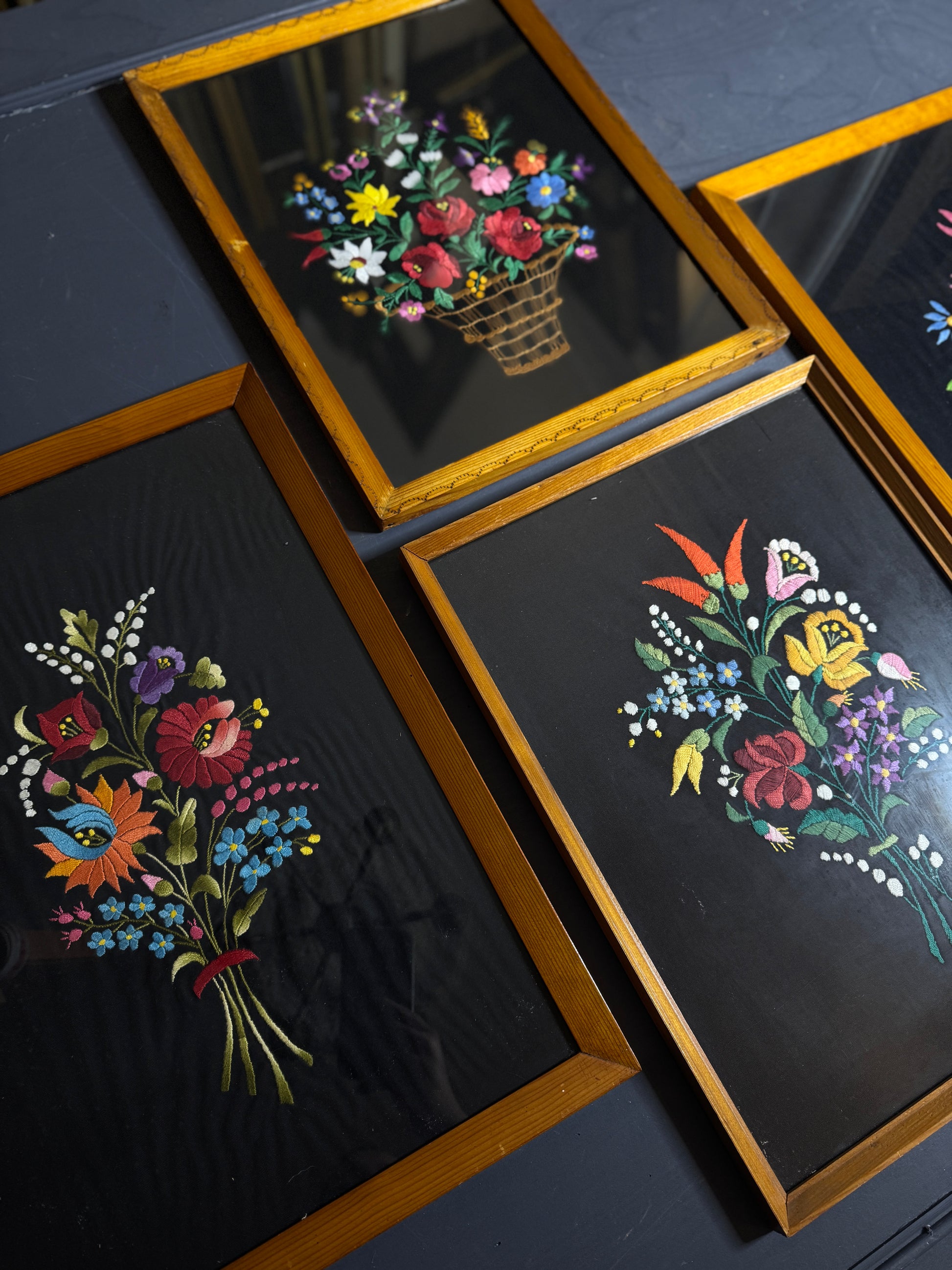 Vintage Hungarian Kalocsa Hand-Embroidered Floral Wall Art – Matyó Embroidery Gallery Wall Set (1950s–1960s)