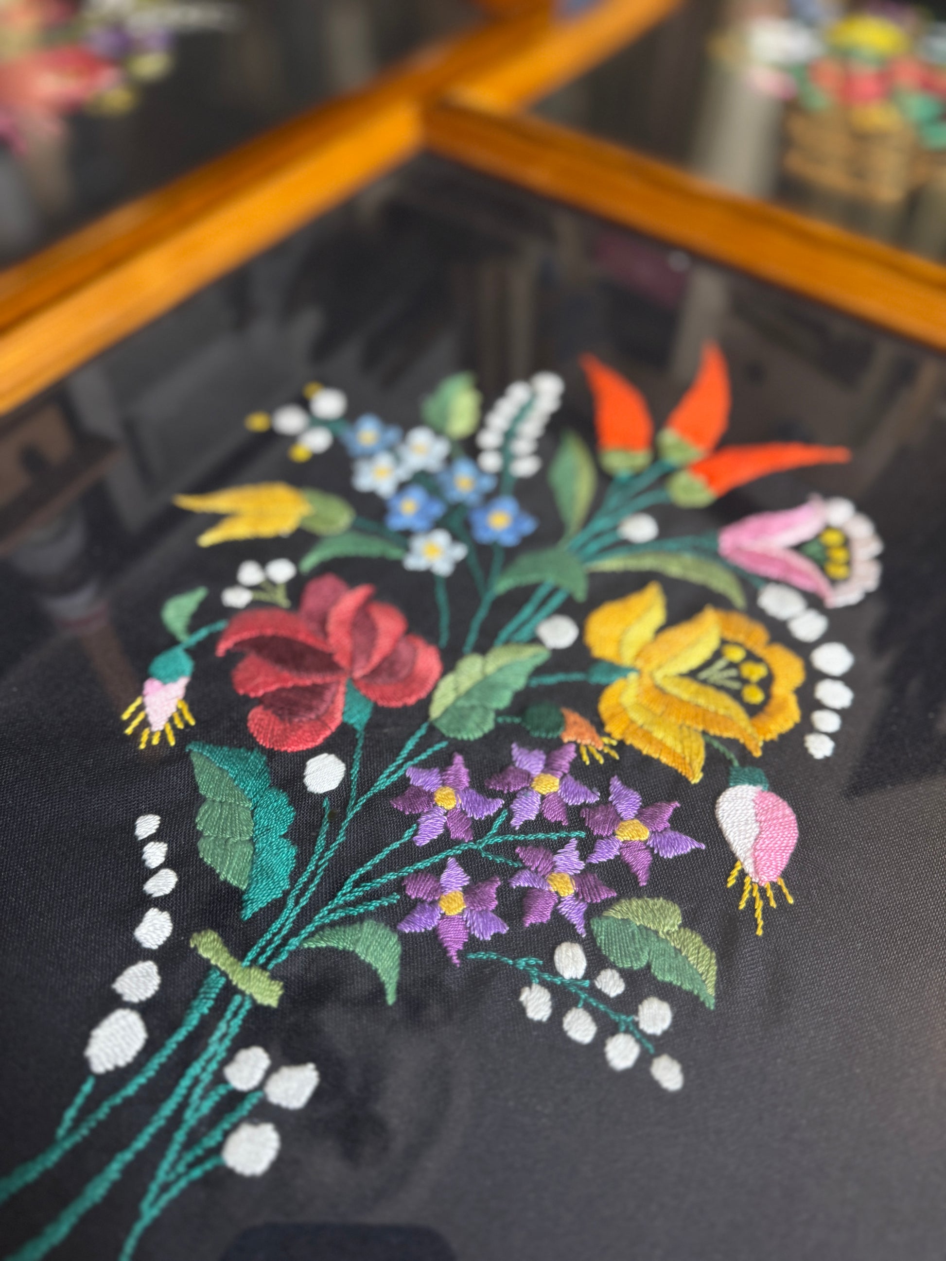 This Vintage Hungarian Kalocsa Hand-Embroidered Floral Wall Set is an authentic imported collection from Hungary, dating to the 1950s–1960s. Each piece has been lovingly hand-stitched, showcasing the unique artistry and cultural significance of traditional Hungarian embroidery.