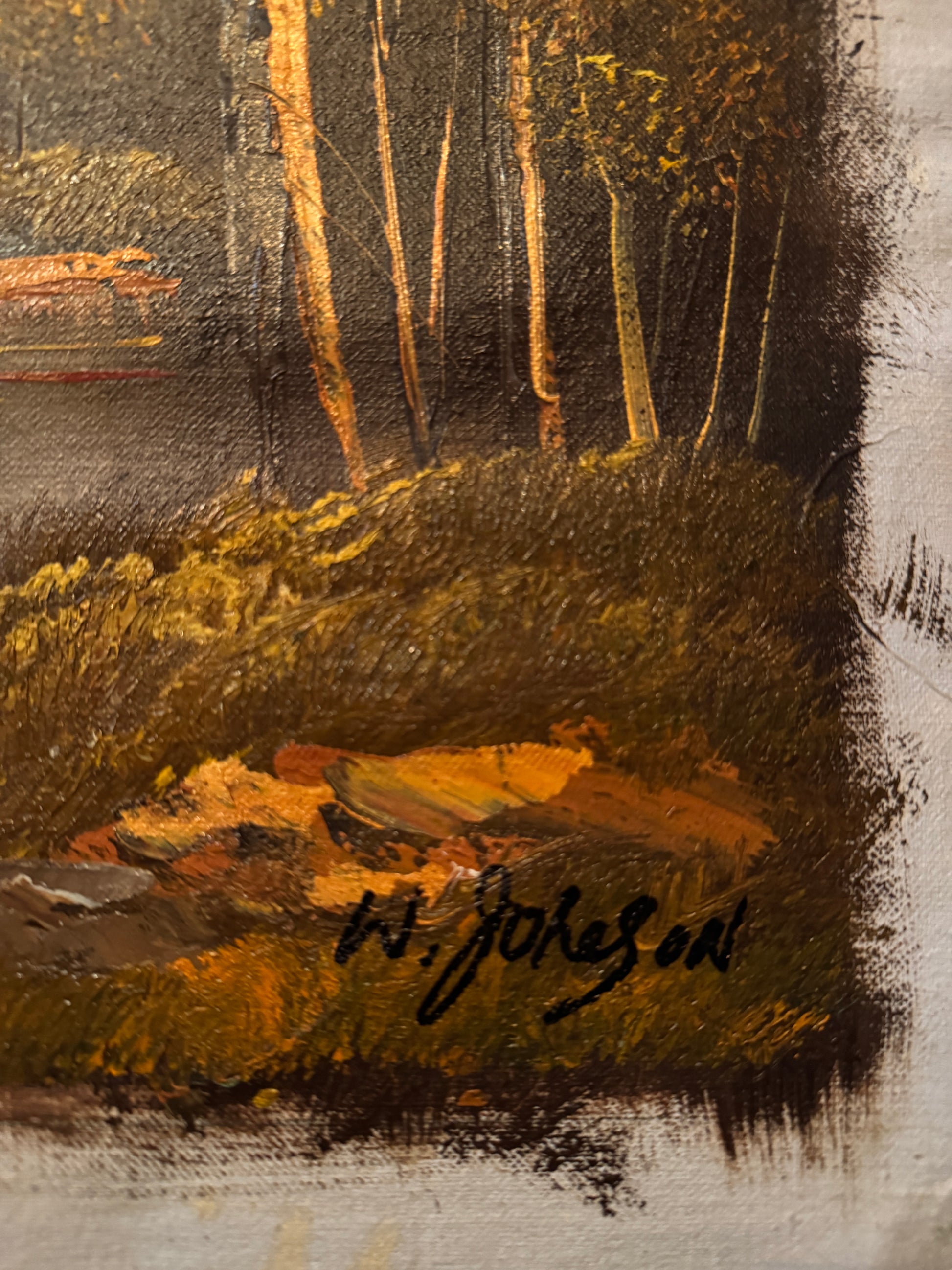 Bring elegance and serenity into your home with this charming vintage oil painting by artist W. Johnson. Titled “Peacefulness by the Lake,” this piece captures a calming lakeside landscape with beautifully soft brushwork and rich, warm tones. The scene evokes a sense of stillness and quiet reflection — a perfect focal point for any room.