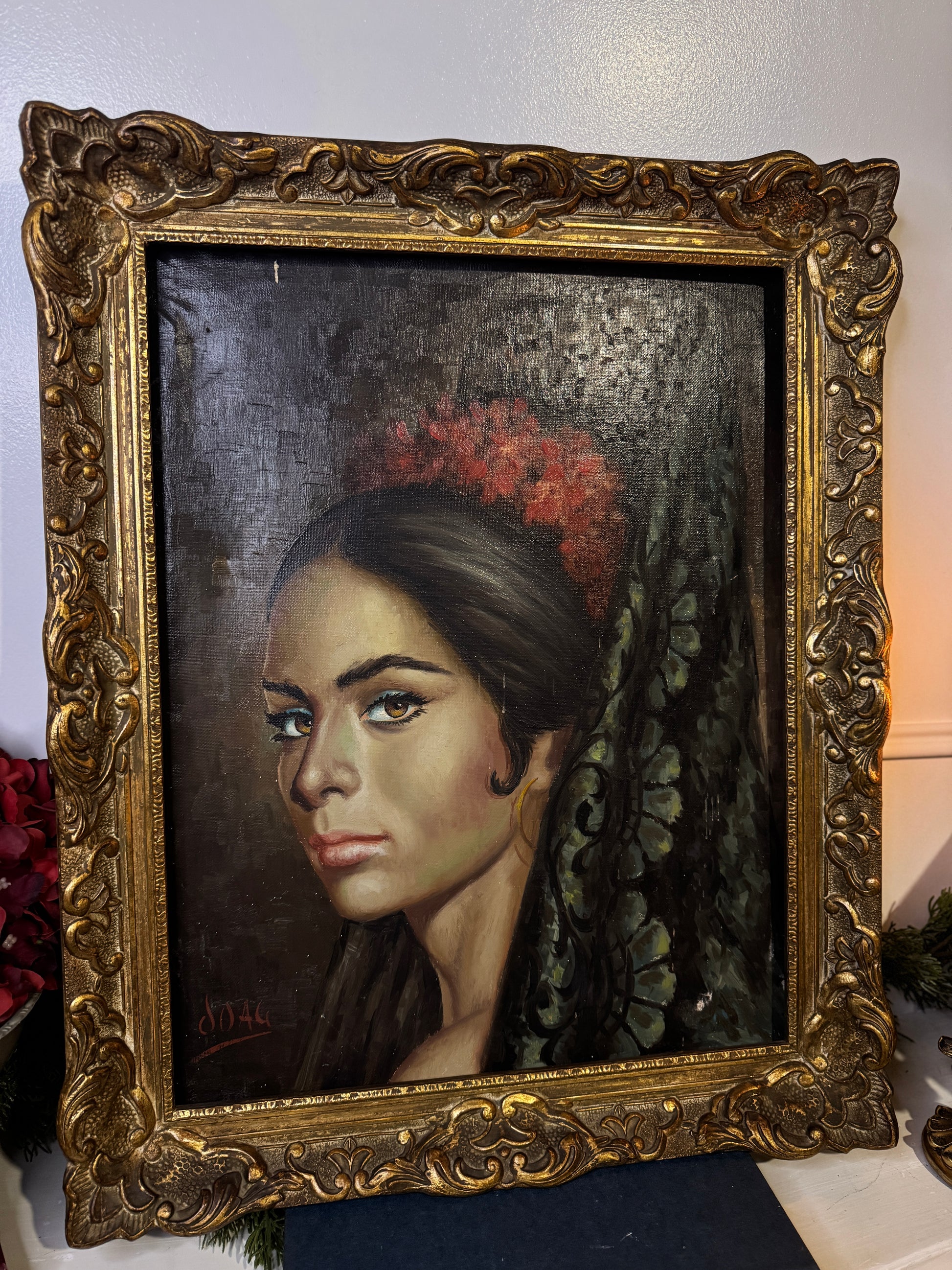 Vintage Portrait Oil Painting by Joan in Ornate Chippendale Gold Rare Antique Picture Frame