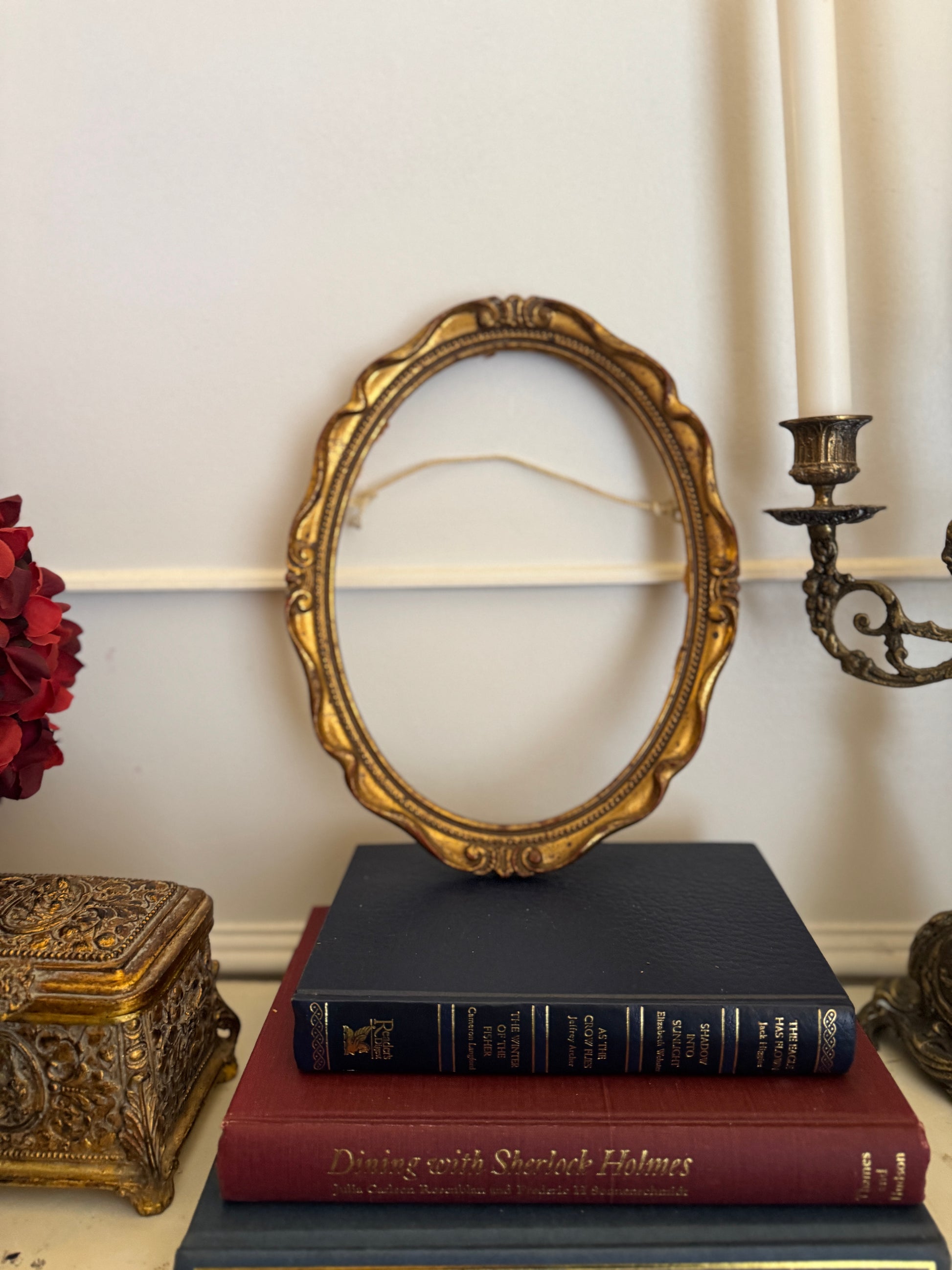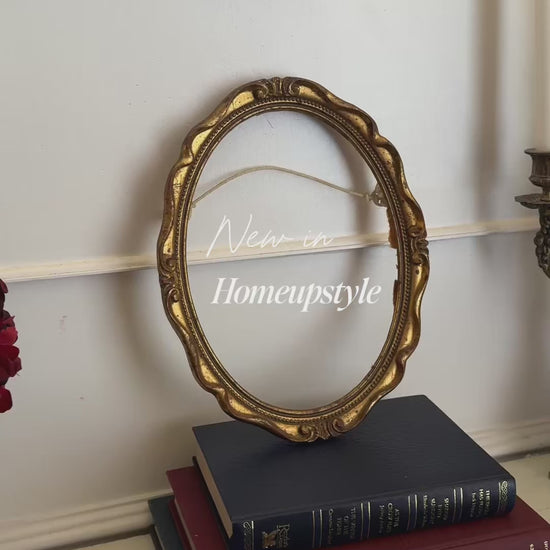 This beautifully vintage-themed portrait is showcased in the exquisite Portofino Oval Frame, finished in a soft antique gold gilt. The ornate yet refined detailing of the frame adds a touch of old-world charm, making it a standout piece for any classic or romantic setting.