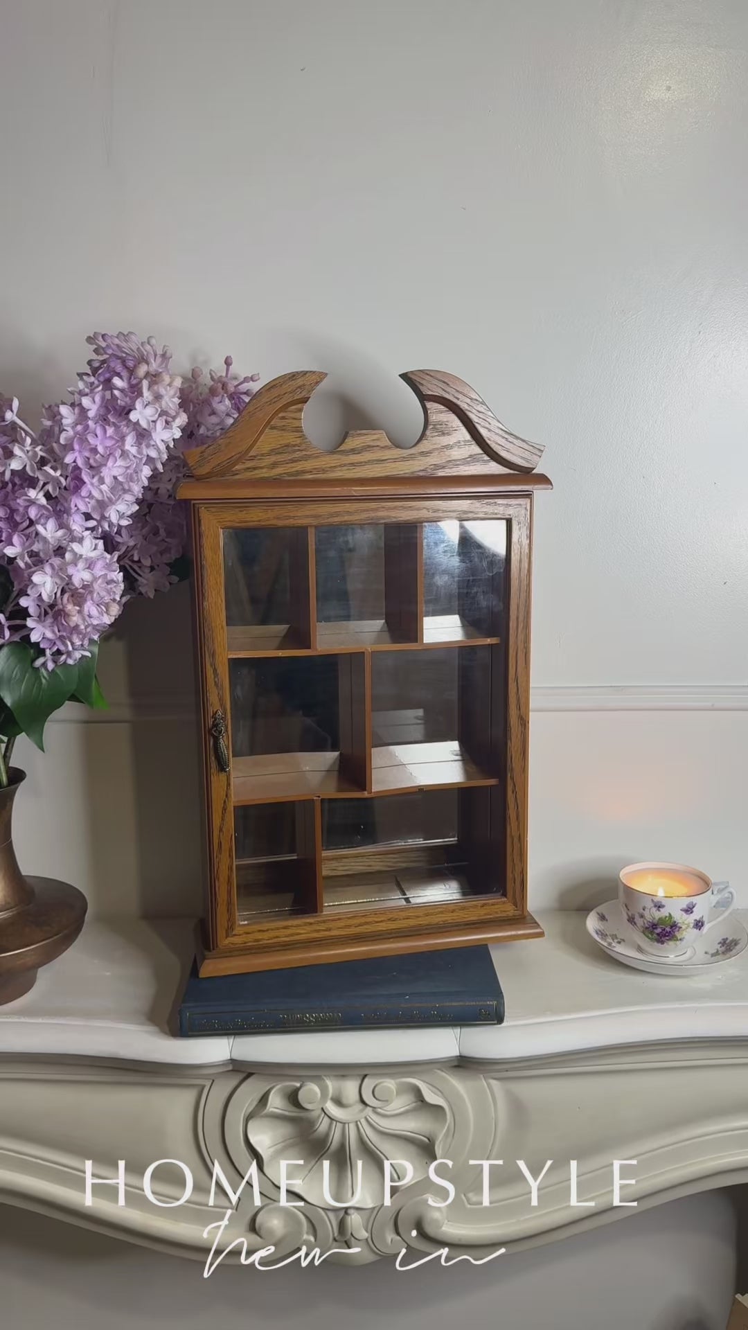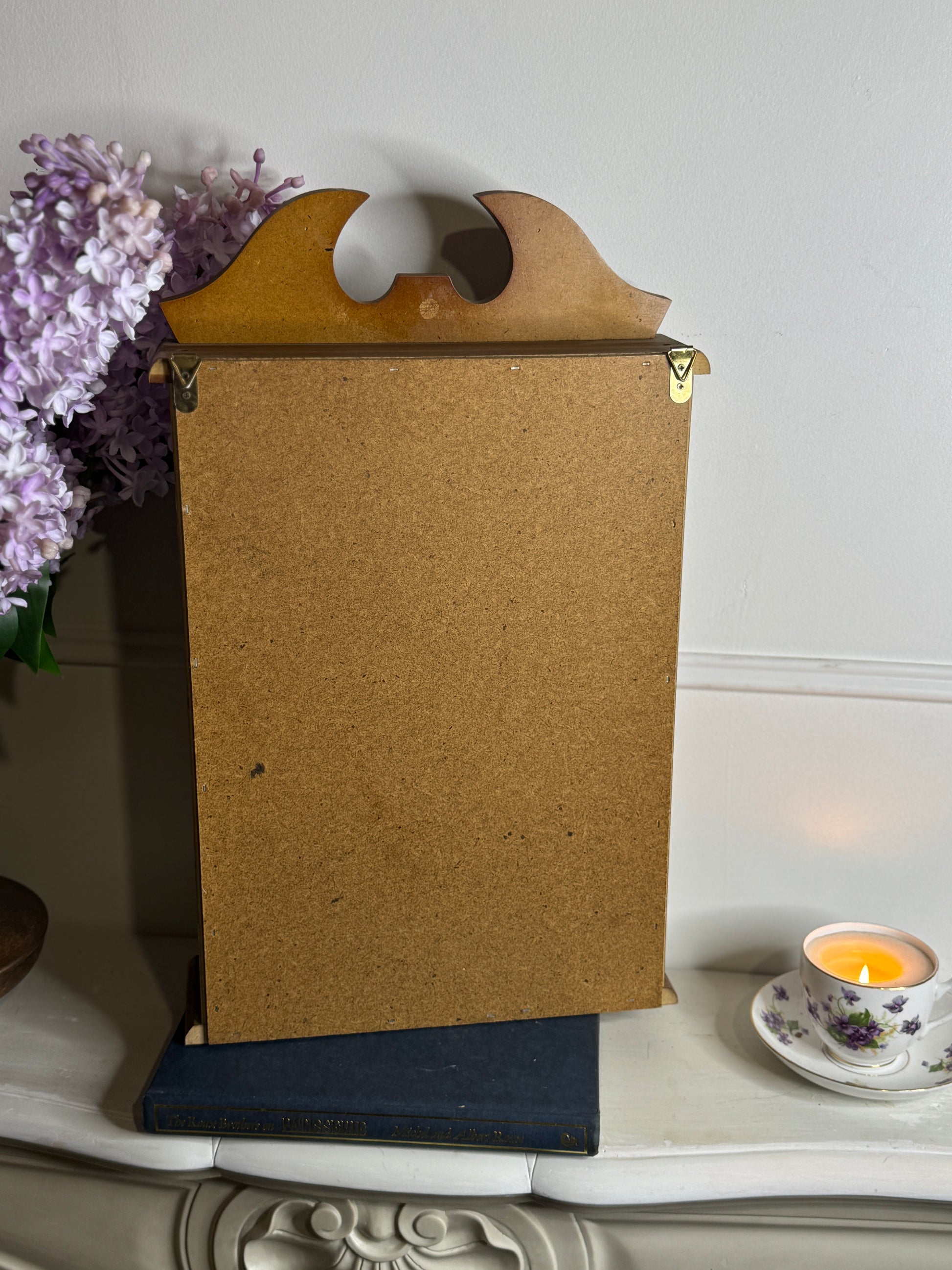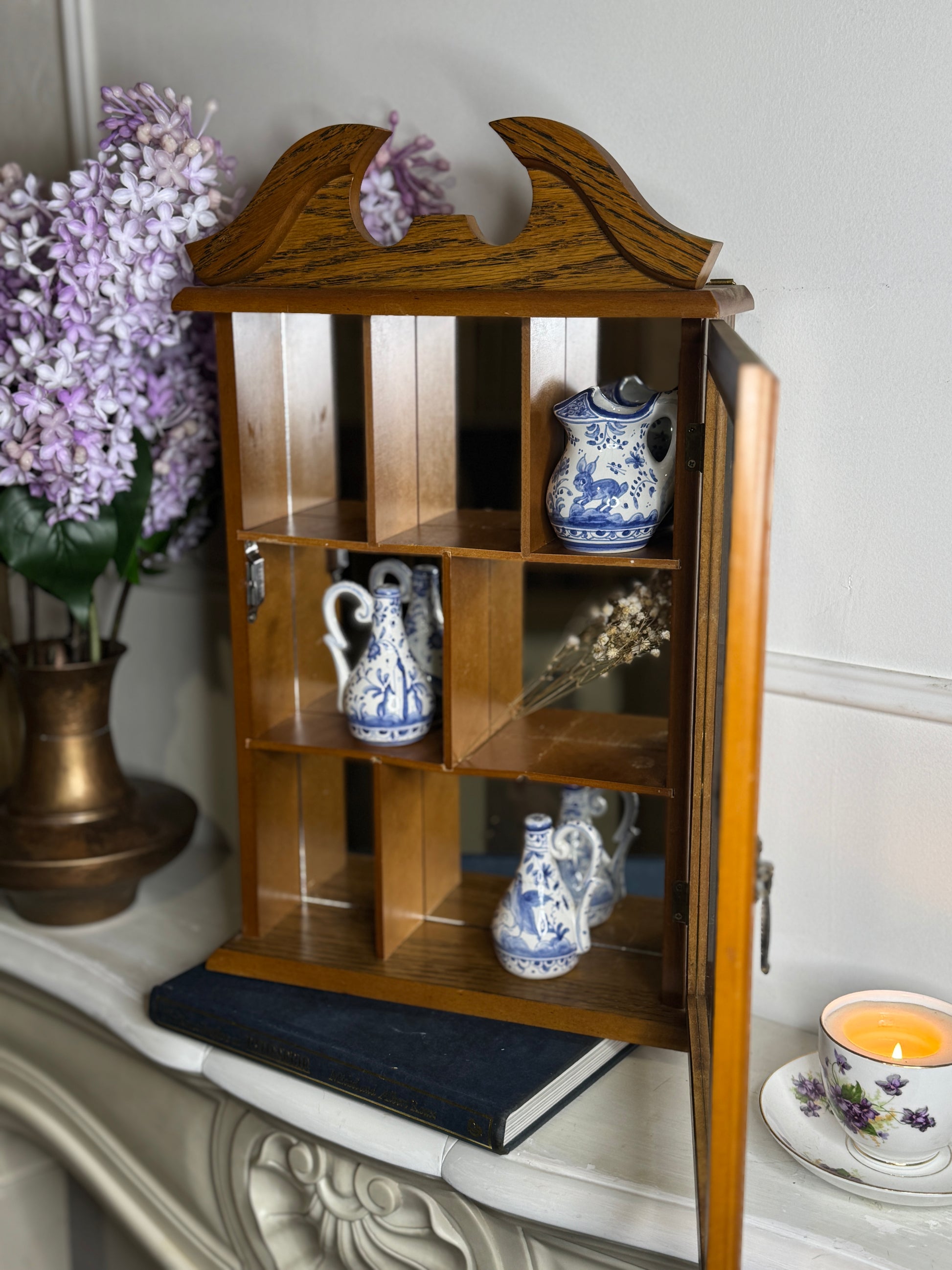 A charming vintage wooden wall display cabinet, perfect for showcasing your favourite collectibles, trinkets, miniatures or sentimental treasures.