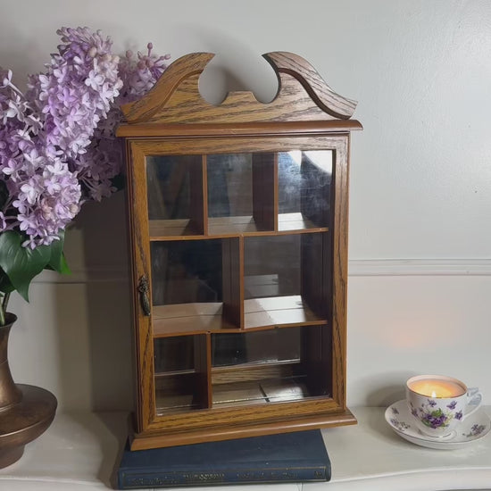 Vintage Wooden Wall Display Cabinet – Glass Fronted Trinket Shelf with Mirror Back